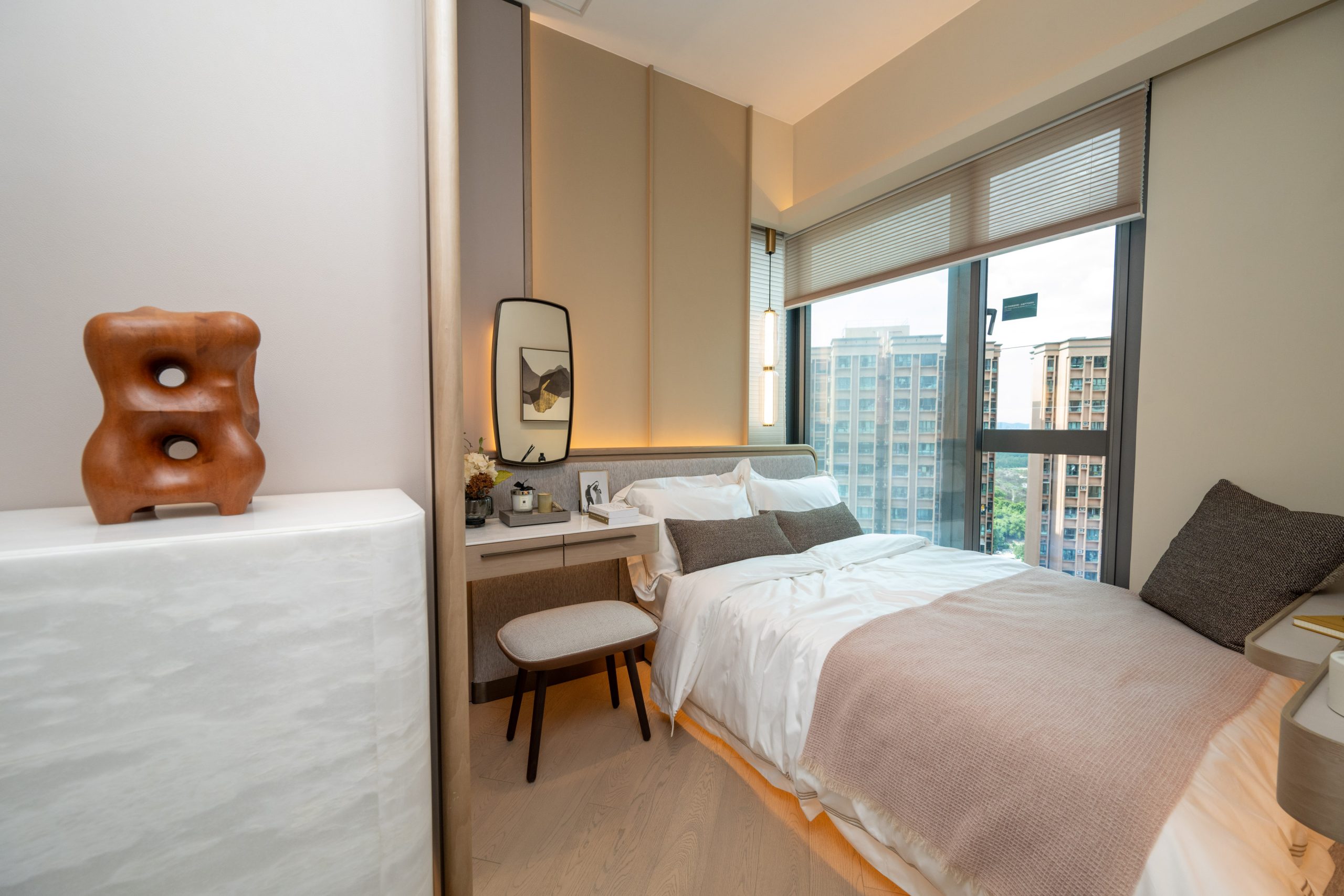 主人睡房貫徹單位以杏色調為主軸,偌大的玻璃窗可同時將窗外風光及自然光線引入室內,加強睡房空間感。地板以複合木地板鋪砌,睡房靠窗位置擺放一張雙人大床,另一則牆身設有皮質飾面的木製層板,陳列各種特色小擺設,牆身以簡約的油畫作點綴。床頭位置擺放淺色雲石紋理檯面的金屬梳妝枱。另一邊放置一組皮飾面高身衣櫃連全身鏡,採趟門設計,提供足夠的儲物空間,設有獨特的嵌入式展示台。