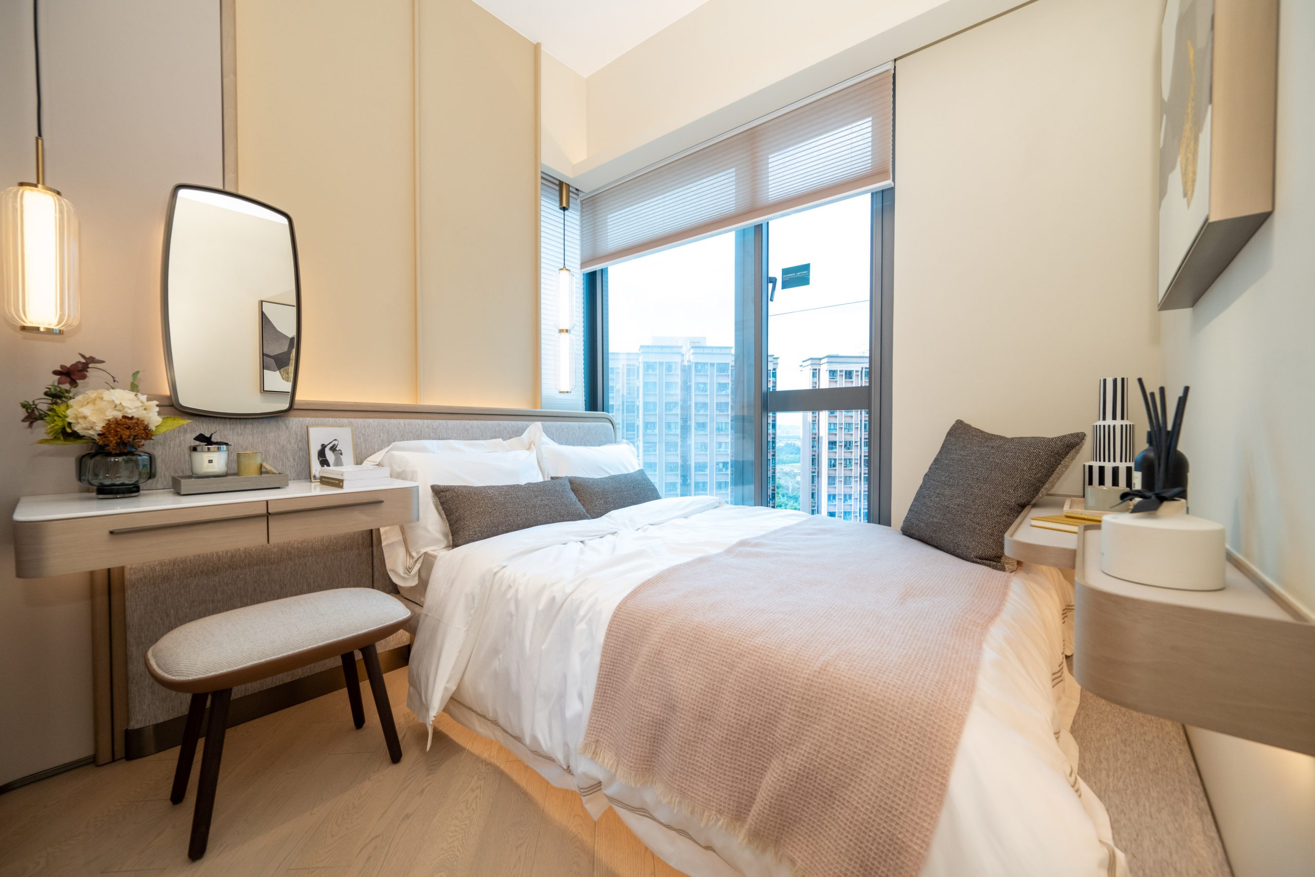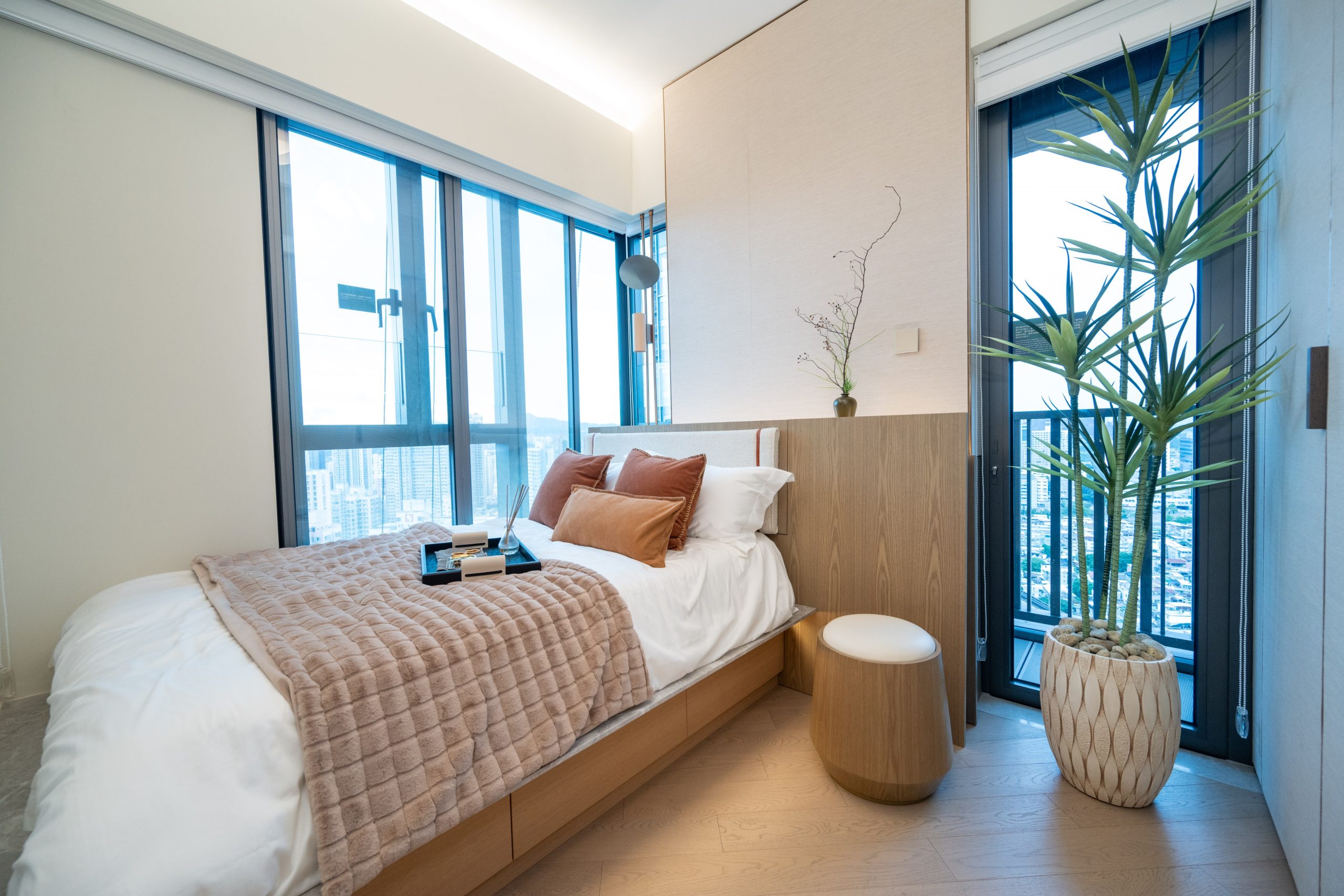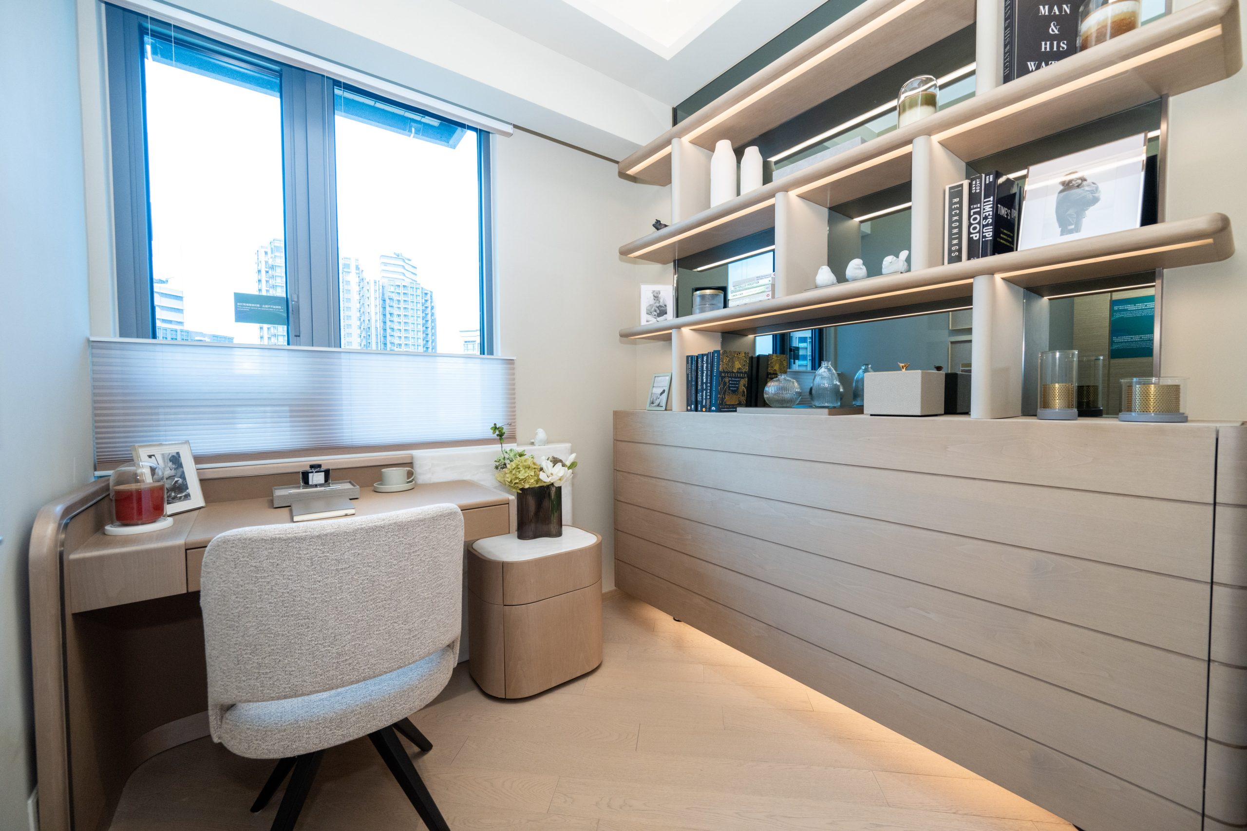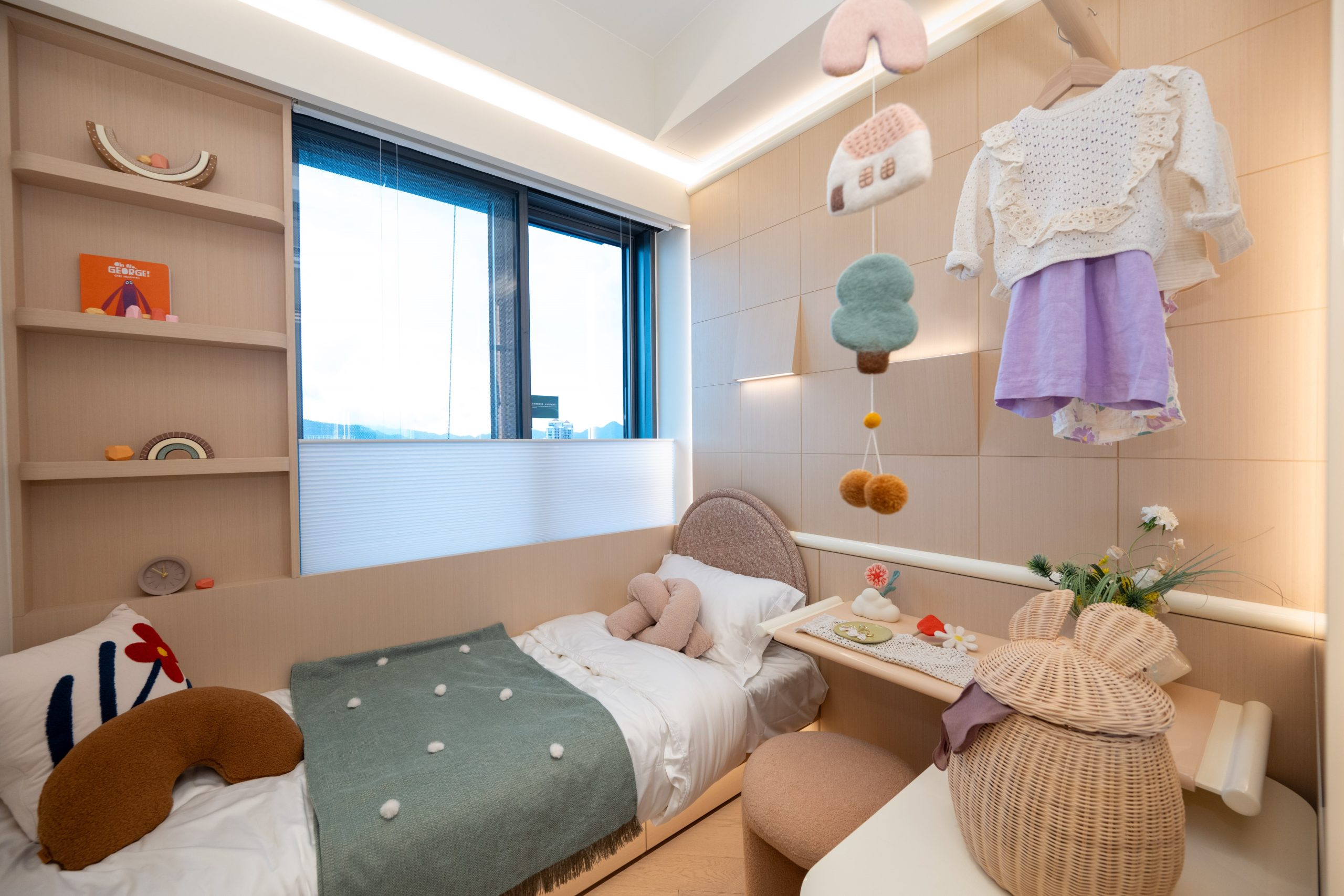 為緊貼家庭住戶的需要,設計師悉心將睡房1設計成色彩繽紛的兒童房,偌大的玻璃窗增強採光度,靠窗位置掀放一張單人床,側設有矮身書桌及粉啡色毛絨兒童椅,一旁的象牙白色亮飾面地櫃及木製衣架提供充足收納空間。睡房內放置多個動物造型擺設、卡通掛飾、兔耳造型的籐籃,為兒童打造童趣滿分的空間。設計師將睡房2設計成可供書房或睡房之用的多用途房,並以暖色調為主,貫徹全屋主題,靠窗位置擺放素雅的象牙白色亮飾面書桌,配以圓形木椅,桌上綴以特色盆栽及茶具擺設,一旁的牆身掛上淺杏色的不規則藝術作品。睡房另一旁放置一組儲物及展示櫃,櫃的一旁可拉開擺放各類書籍,展示層架陳列多個特色的藝術擺設、書籍、特色盆栽、香水等,營造出充滿時尚品味的生活格調。展示層架下方設有收納式床鋪,搖身一變即可以作睡房用途,倍添靈活性。