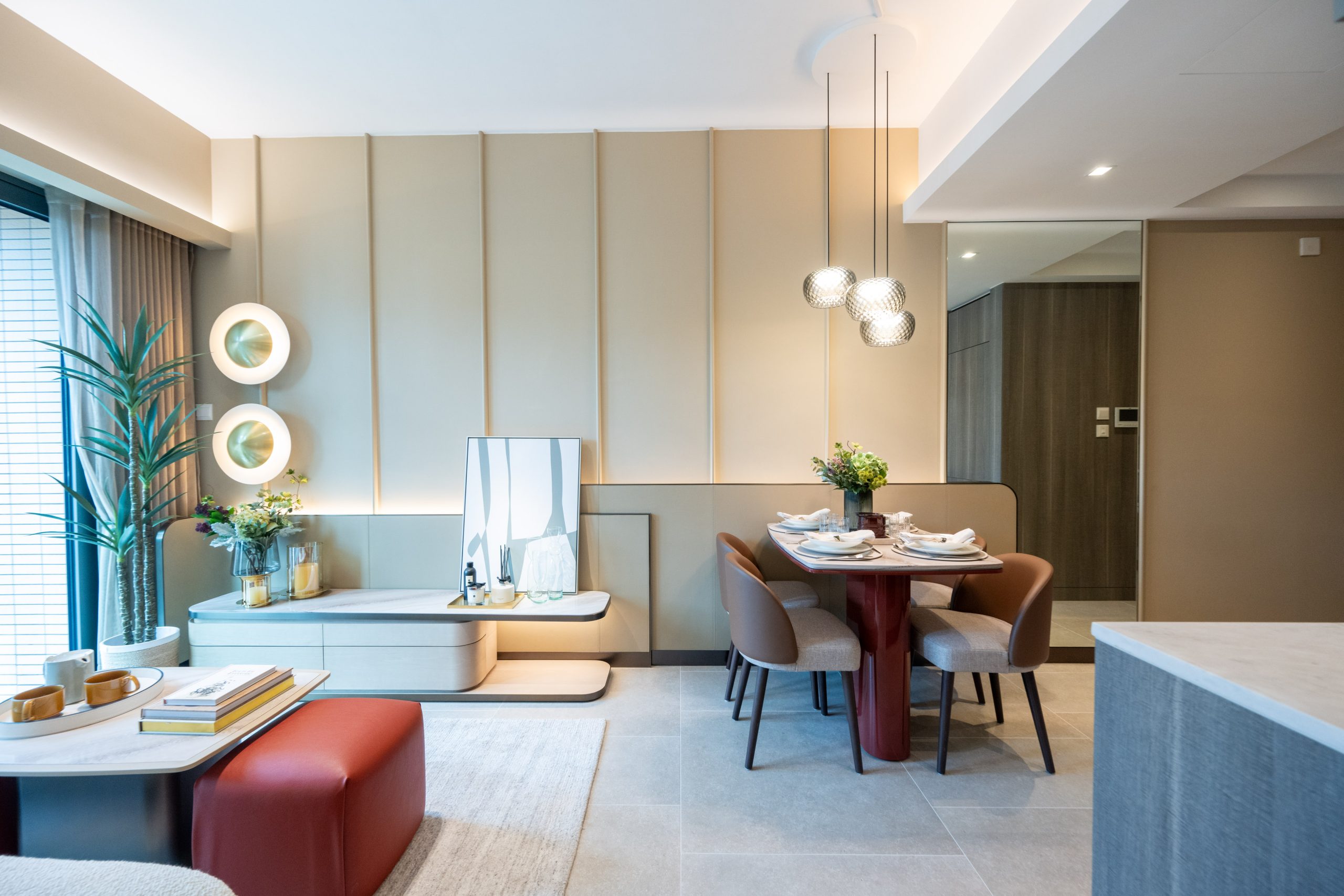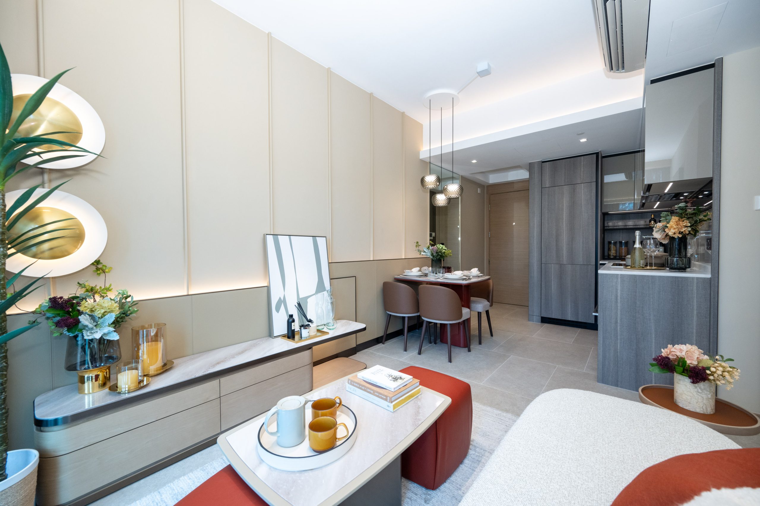 客廳地板以低調型格的淺灰色雲石紋地磚鋪砌,映襯屋內以杏金色為主調的設計,洋溢高雅舒適氛圍。客廳放置米白的布藝梳化,以不同顏色及布料的抱枕作襯托,配合獨特的灰白色橫紋地毯,擺放杏色雲石紋茶几以及兩張棗紅色皮質椅子後空間仍感寬敞。客廳的另一端設有杏色雲石紋地櫃,擺放不同花卉、蠟燭、香薰及充滿藝術氣色的玻璃擺設,配上抽象的藝術掛畫。客廳一旁有偌大的落地玻璃折疊門連接室外空間,廣納自然光線,令單位更見明亮溫馨。飯廳天花採用玻璃吊燈設計,以淺啡色雲石紋餐桌配淺灰色布藝坐墊拼深啡色皮椅背餐椅,桌上擺放銀白色的餐具及優雅花卉,盡顯低調型格的格調。餐桌旁設置偌大的全身鏡,提升室內空間感。