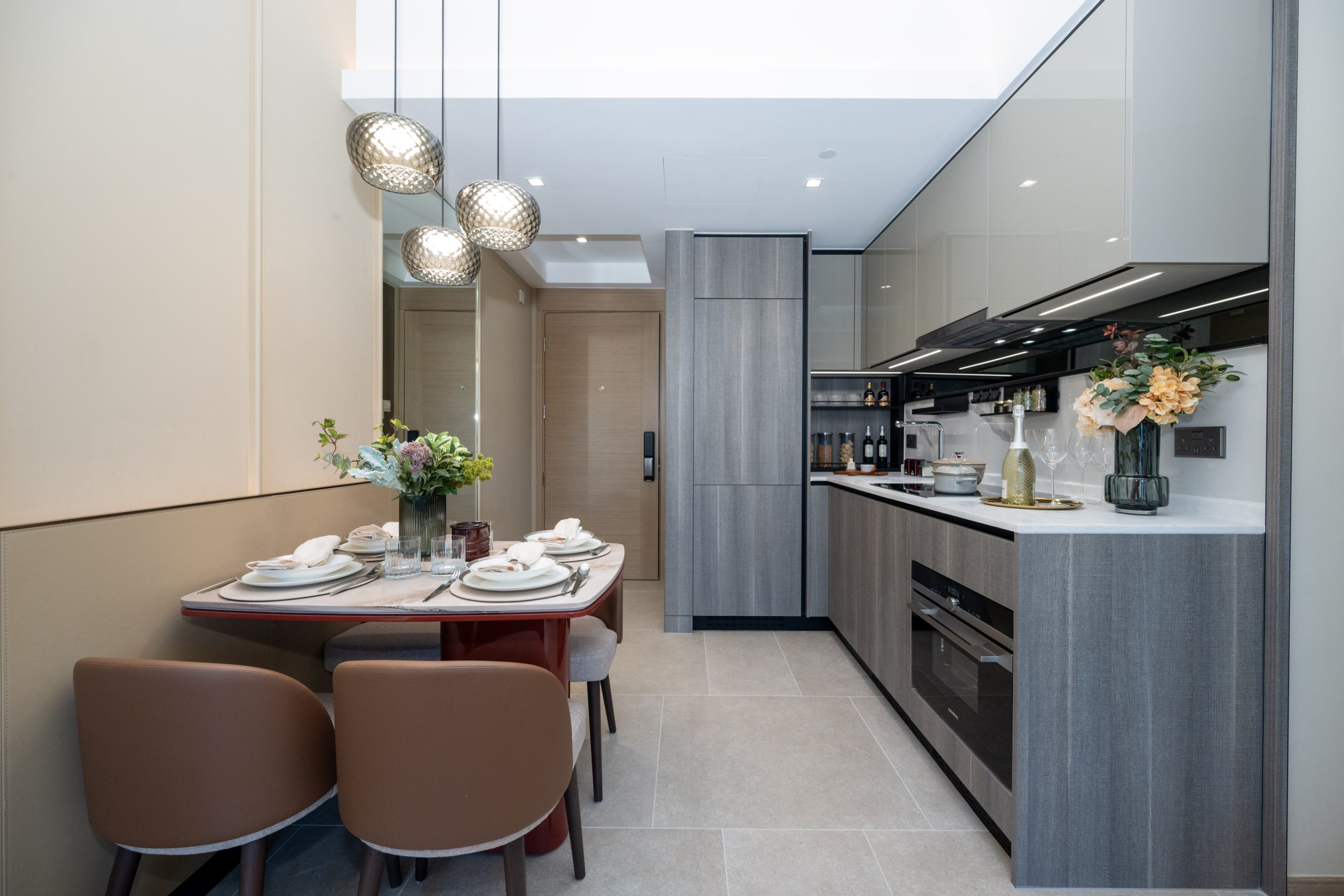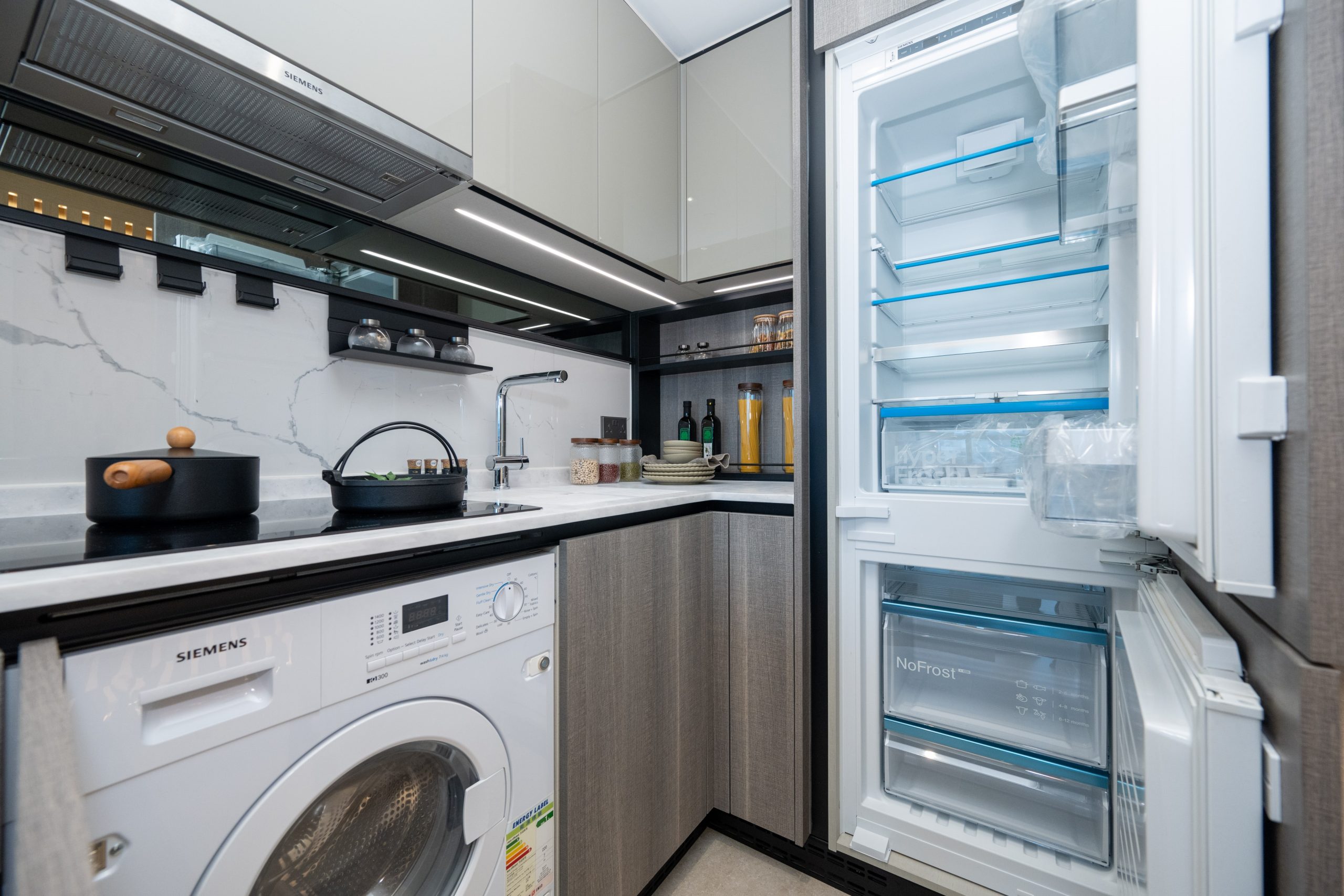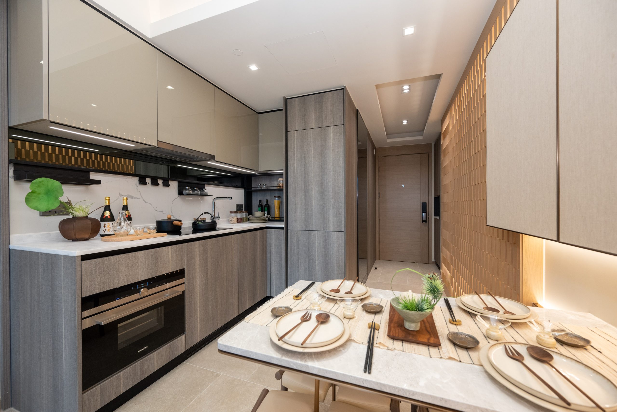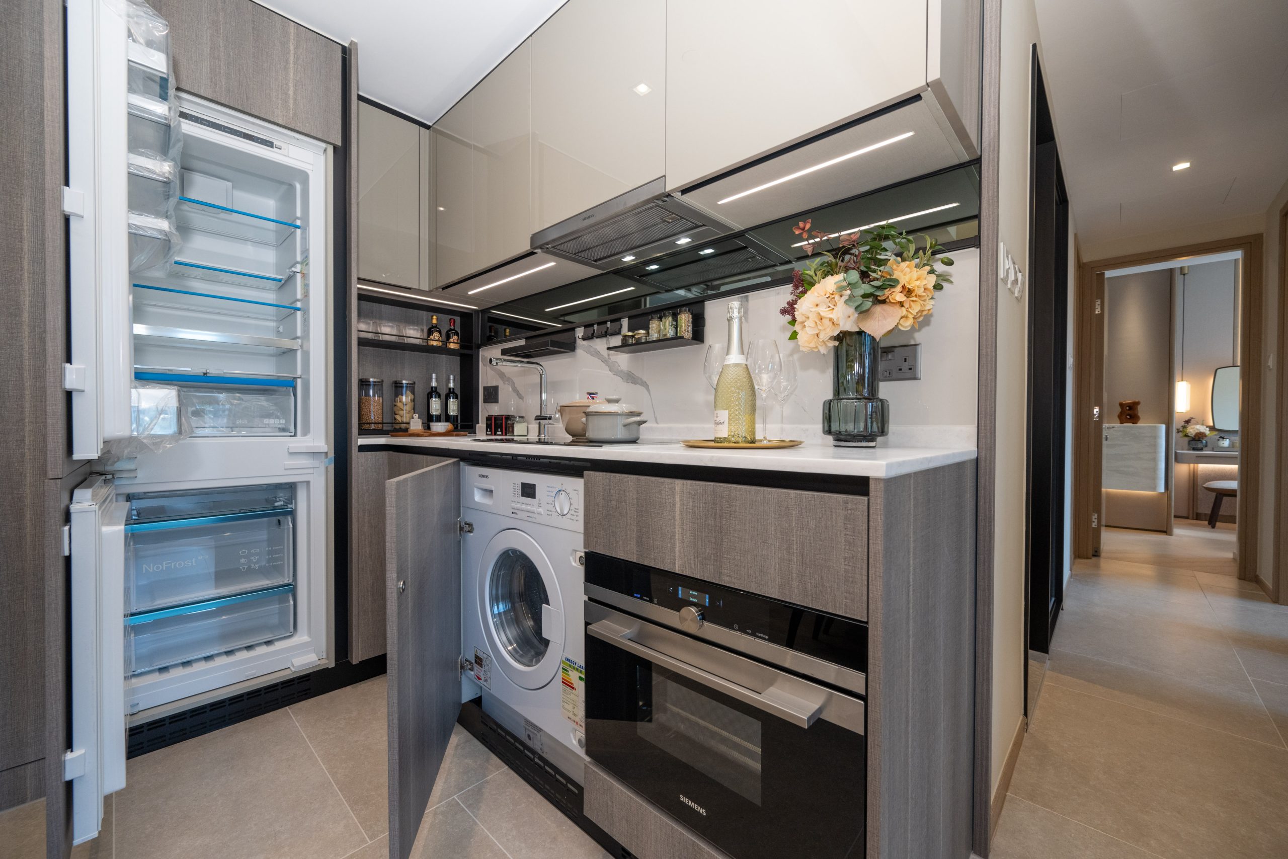 單位採用開放式廚房設計,灰色亮飾面拼深木紋廚櫃與象牙白色雲石工作檯面互相映襯,提供充裕的收納空間。廚房設備一律選用德國品牌Siemens品牌家電組合,設備齊全,更同時被整合到廚櫃之中,節省空間之餘又顯整潔歸一。