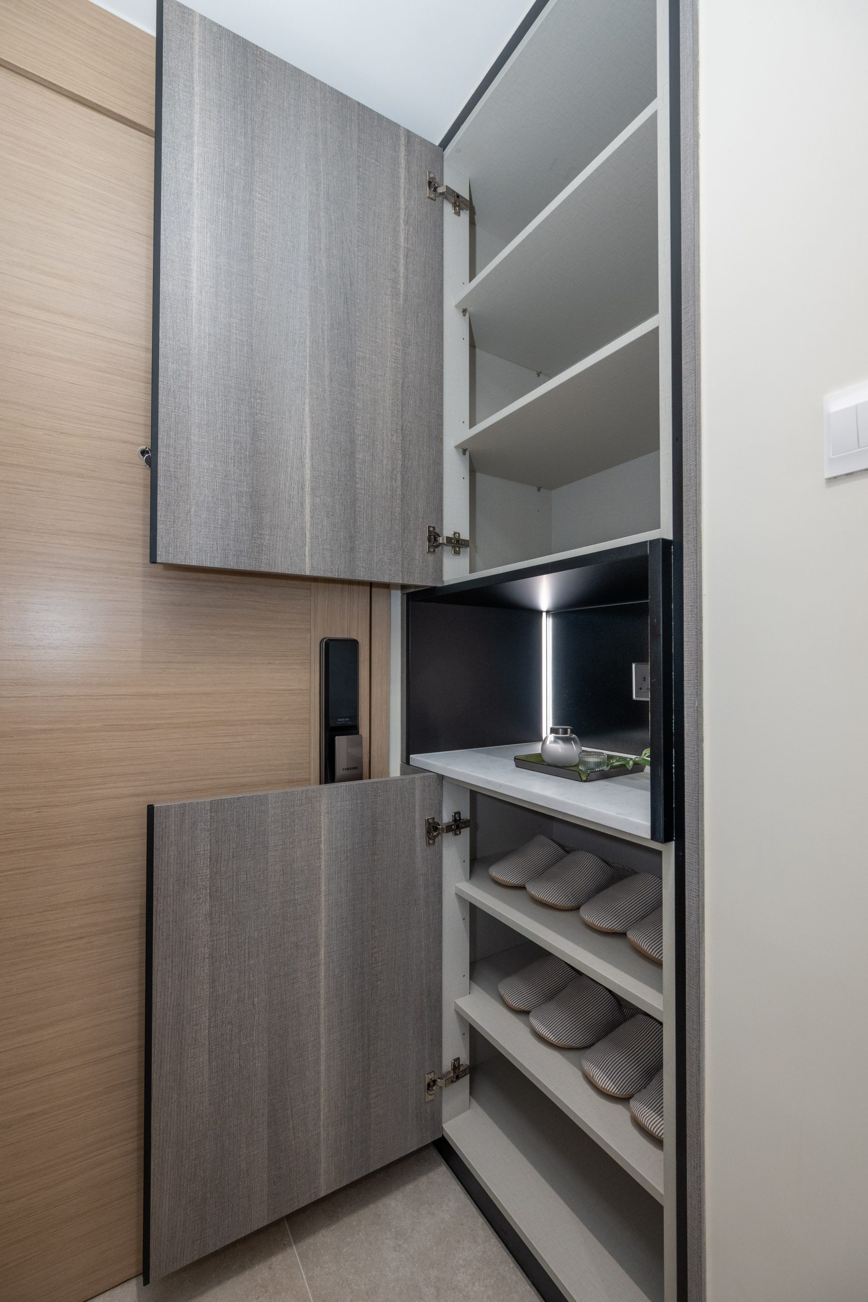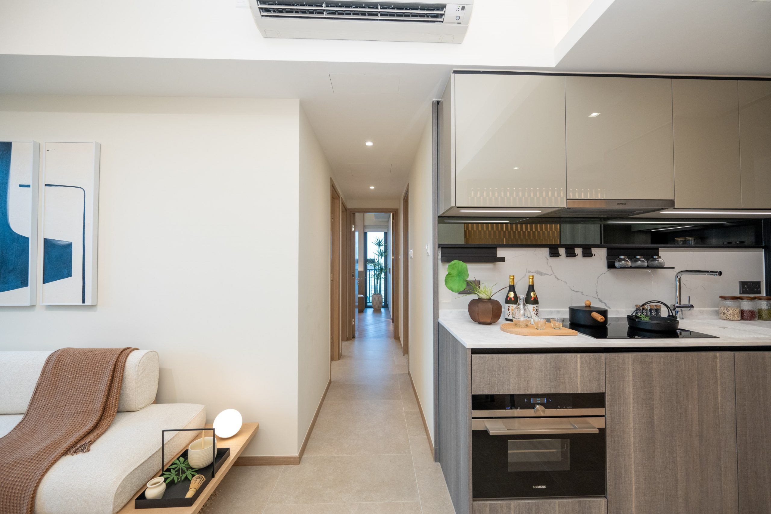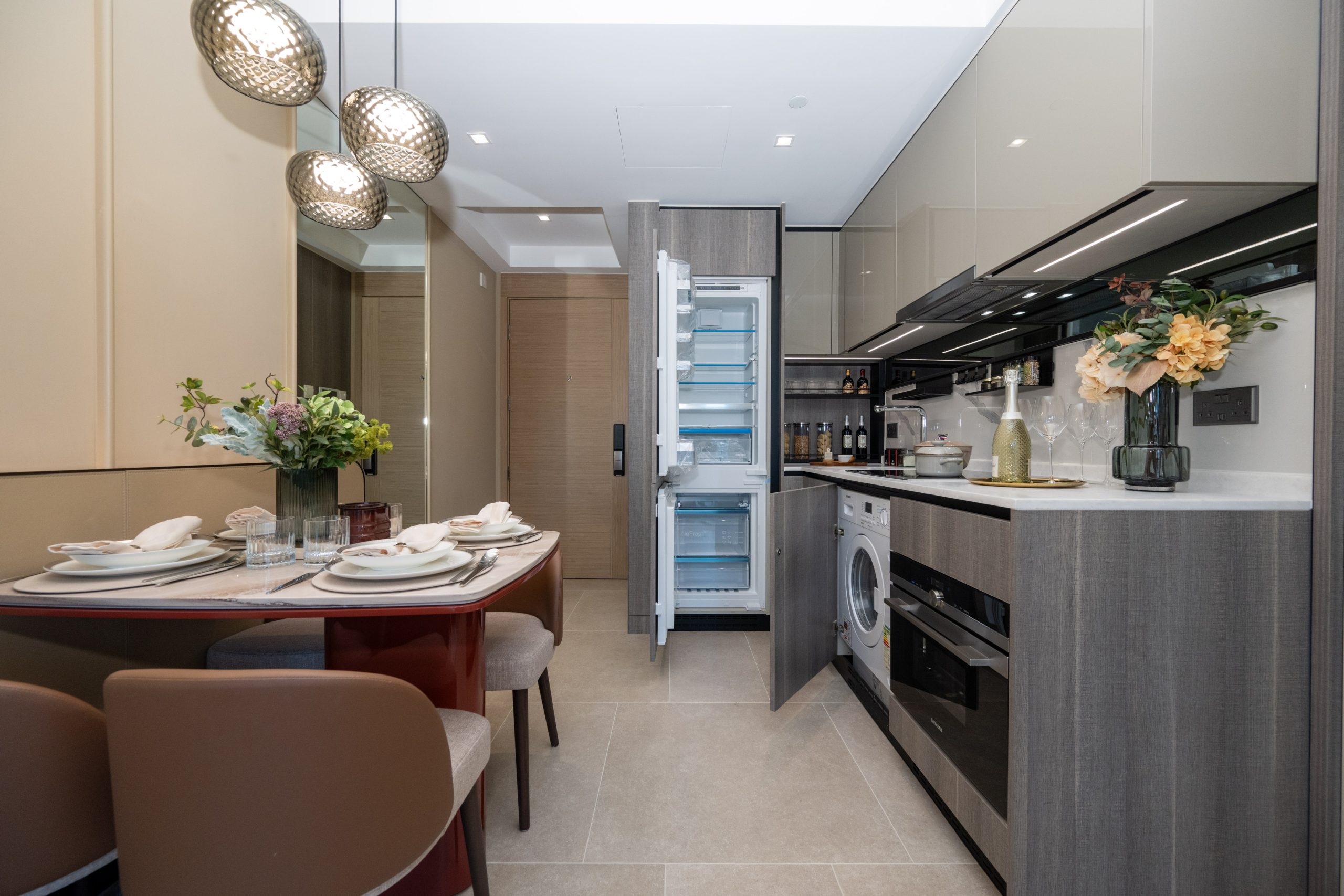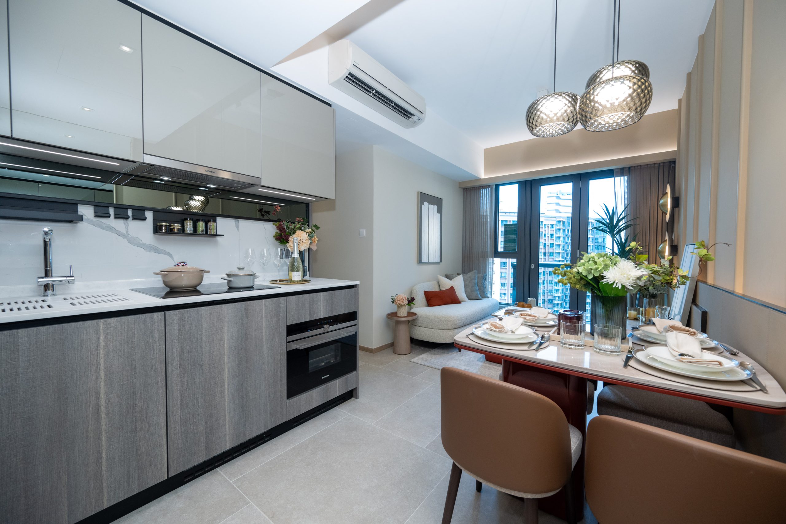 單位採用開放式廚房設計,灰色亮飾面拼深木紋廚櫃與象牙白色雲石工作檯面互相映襯,提供充裕的收納空間。廚房設備一律選用德國品牌Siemens品牌家電組合,設備齊全,更同時被整合到廚櫃之中,節省空間之餘又顯整潔歸一。