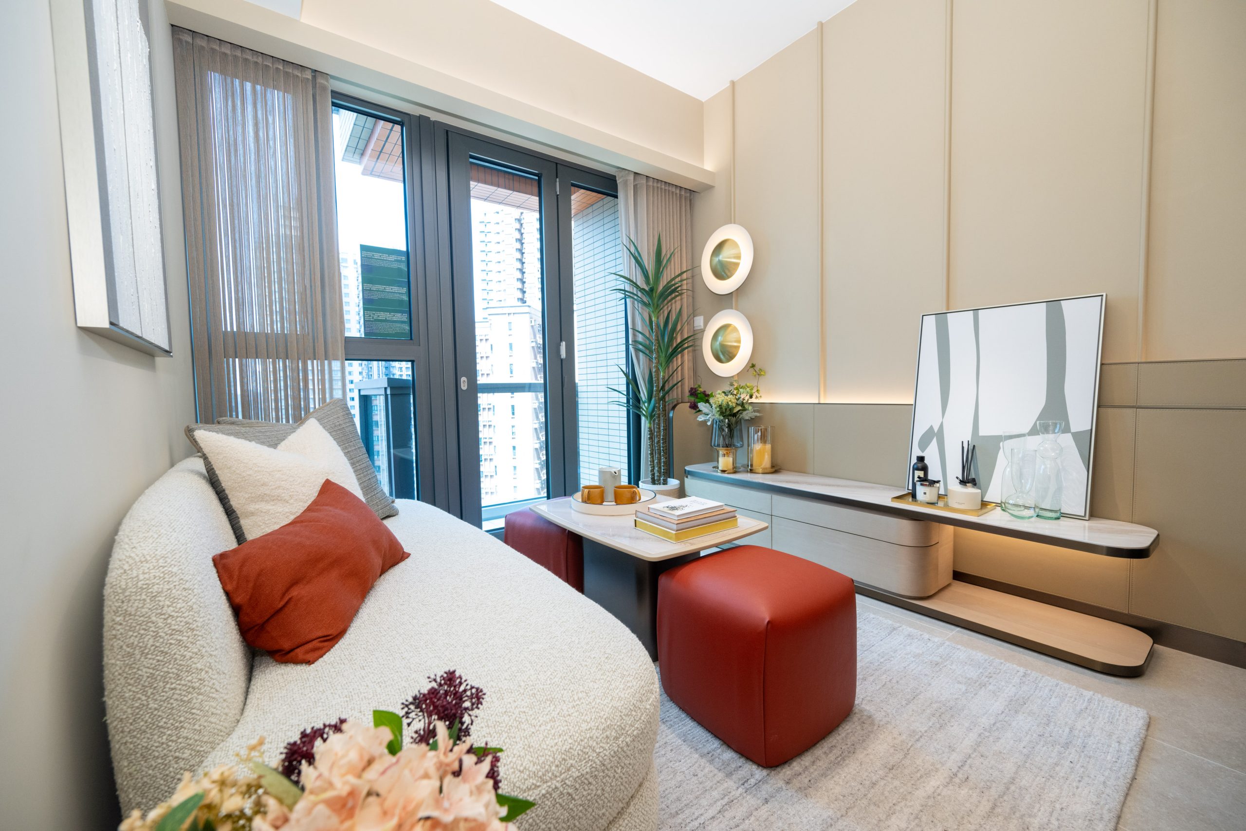 另外,8座30樓C室,實用面積534方呎,三房開放式廚房間隔,包括一個22方呎的露台。樓層與樓層之間的高度為3米,空間感十足。單位一室布置以杏色為主調,選用大量皮製及雲石家具,配合一系列深淺不一的啡紅色調家品點綴各空間,顏色配搭高雅脫俗,更配以部分金色擺設,凸顯充滿品味格調的時尚生活。