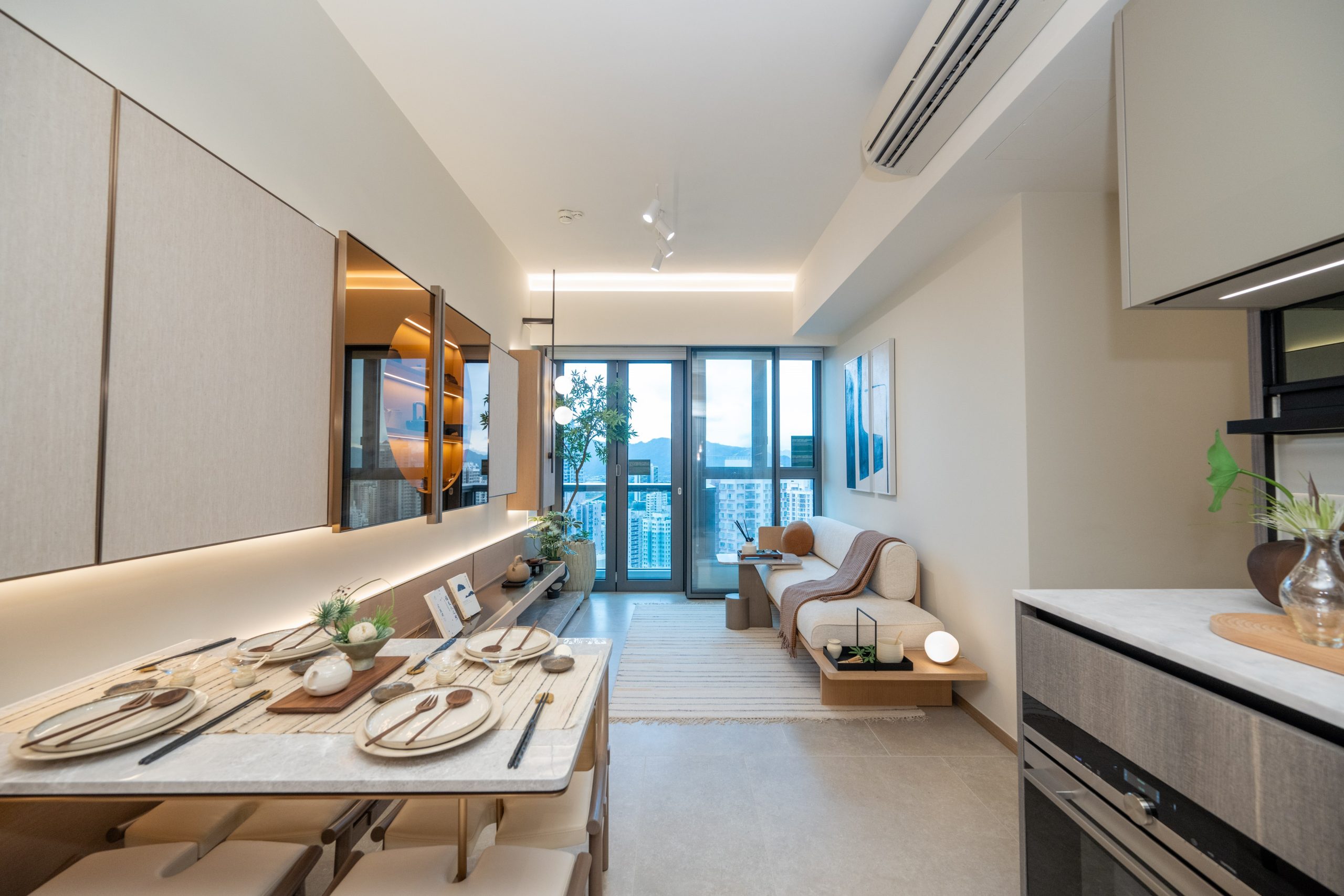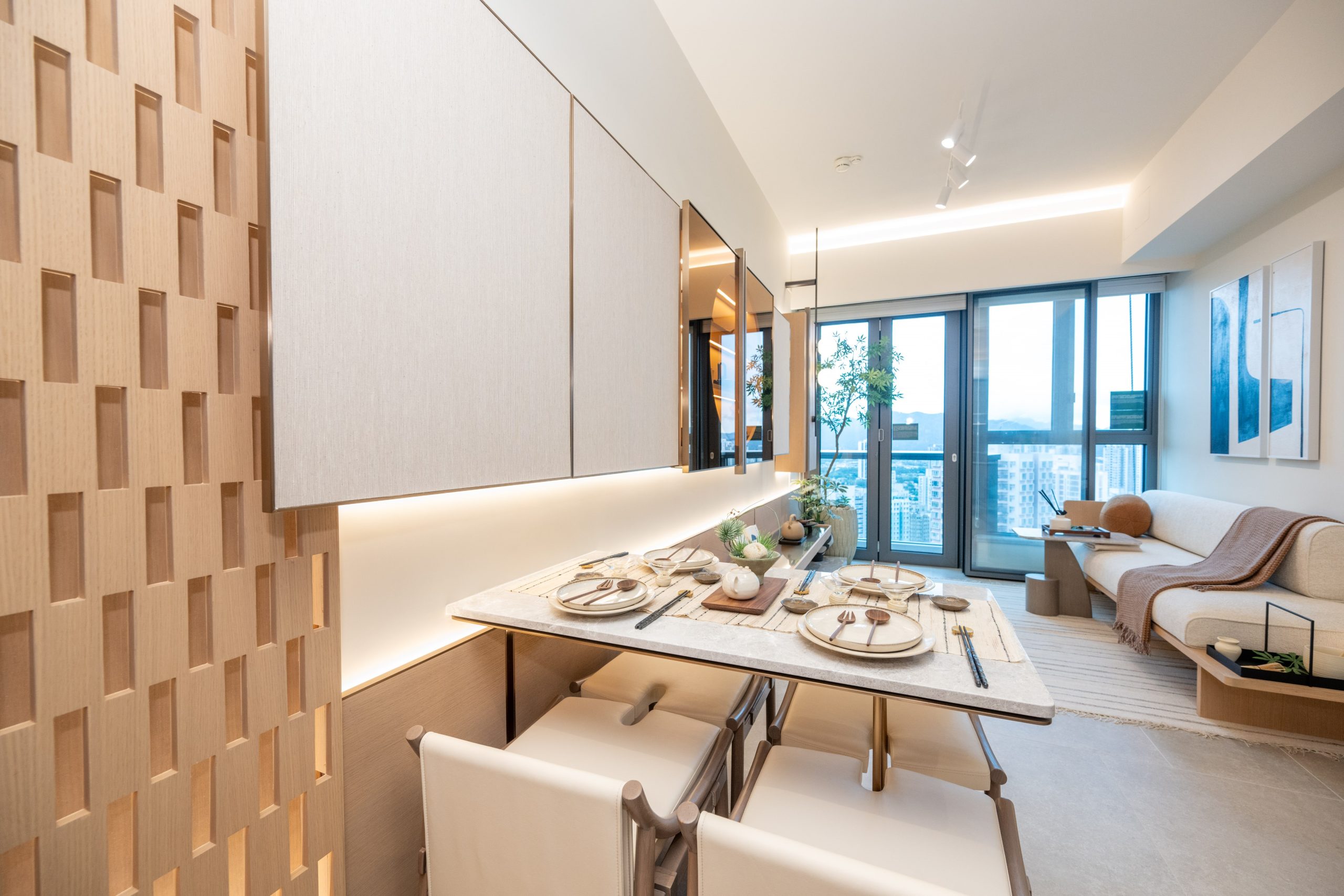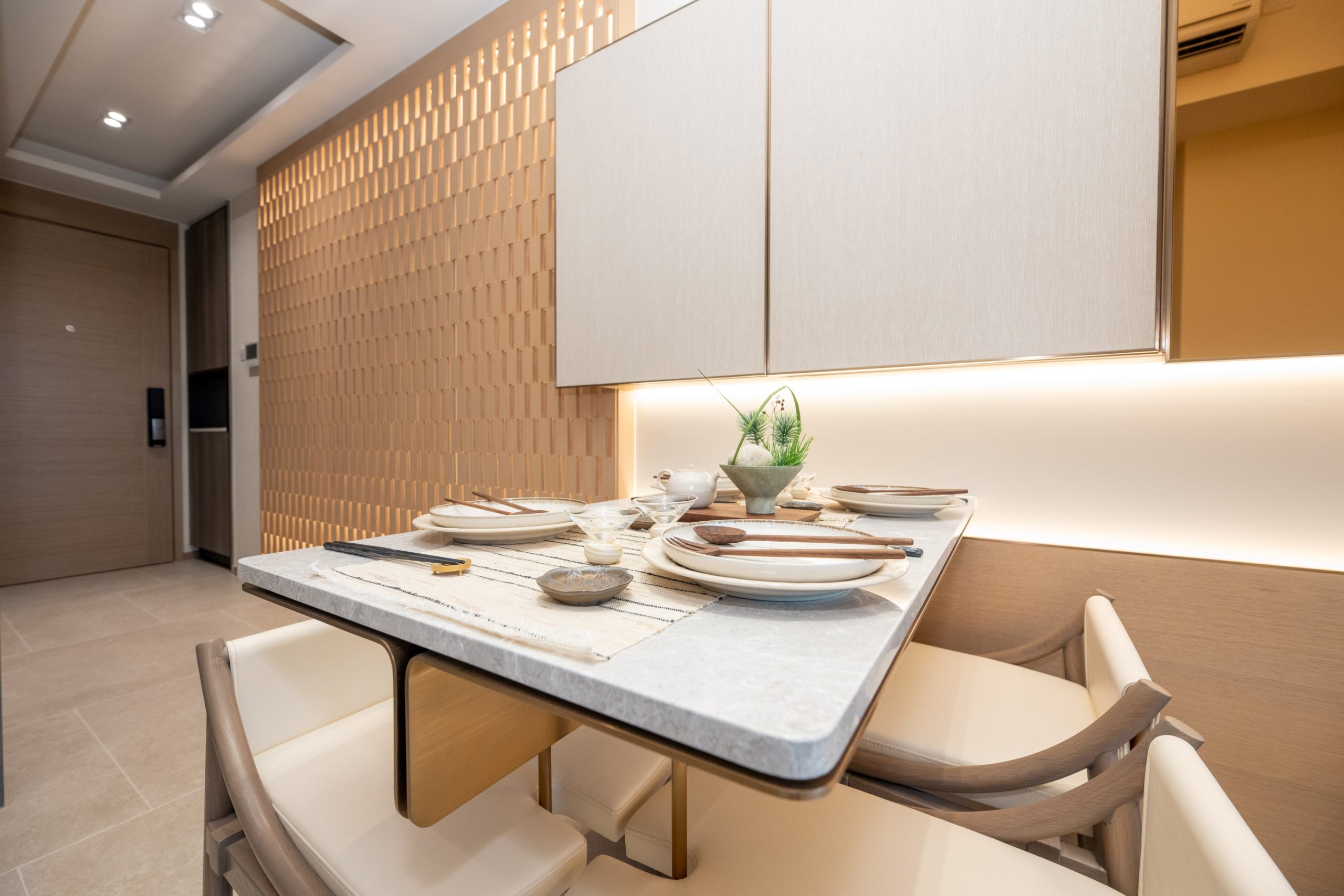 客飯廳地板採用淺灰色的雲石紋地磚鋪砌,襯托屋內暖色調的設計及木製家品,更以不同植物及藝術擺設點綴各個空間,玄關兩旁牆身分別以木製的格紋透光設計及深色鏡面設計。客飯廳呈長方形,客廳以落地玻璃折疊門設計連接露台,廣納自然光線。淺灰色雲石紋飾面的茶几以及梳化旁以不同種類的日式茶具為裝飾,貫徹全屋主題,牆身掛上黑白色掛畫點綴整個空間。客飯廳另一則設有掛牆的深色鏡面展示櫃,櫃門採用圓形玻璃設計,展示各款日式茶具,下方設有金屬飾面的木製地櫃及淺灰色雲石展示架,放置不同書籍、茶具擺設及特色盆栽,豐富客廳的藝術感。飯廳放置淺灰色雲石4人餐桌,配上深色原木拼白色皮革餐椅,桌上擺放杏色及木製餐具,再以淡雅的小盆栽及茶具作點綴。餐桌旁的牆身設有金屬邊灰色木紋掛櫃,為客飯廳提供充裕的收納空間。