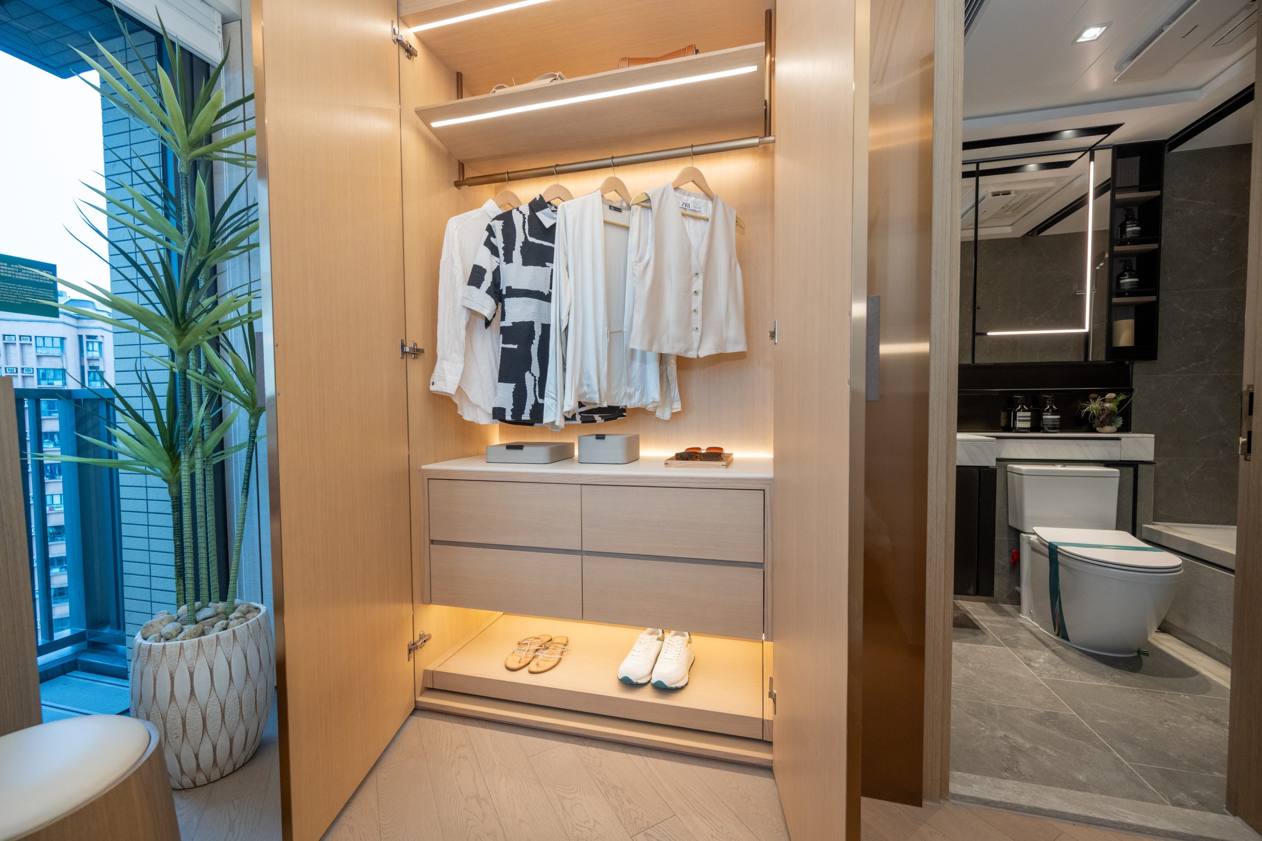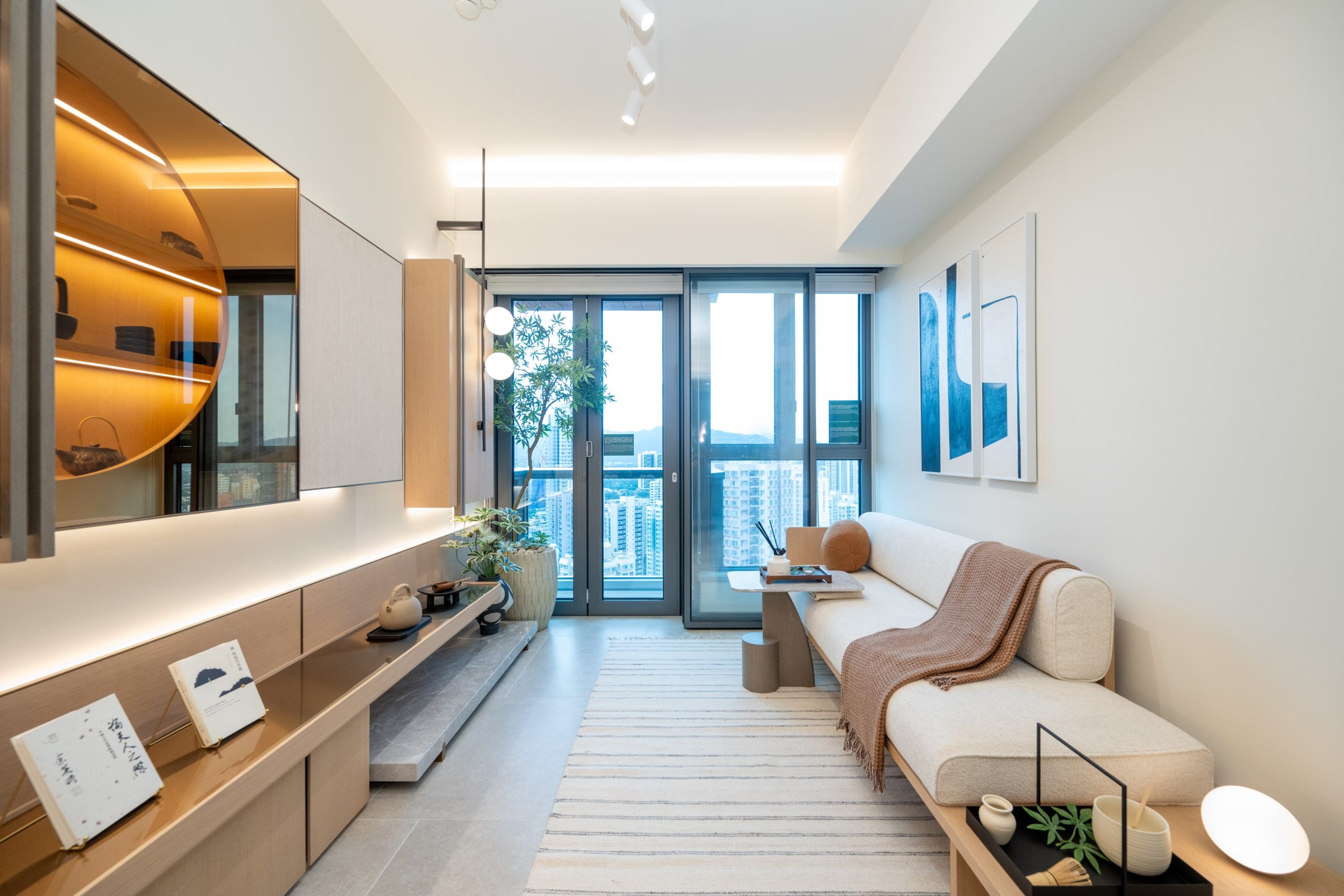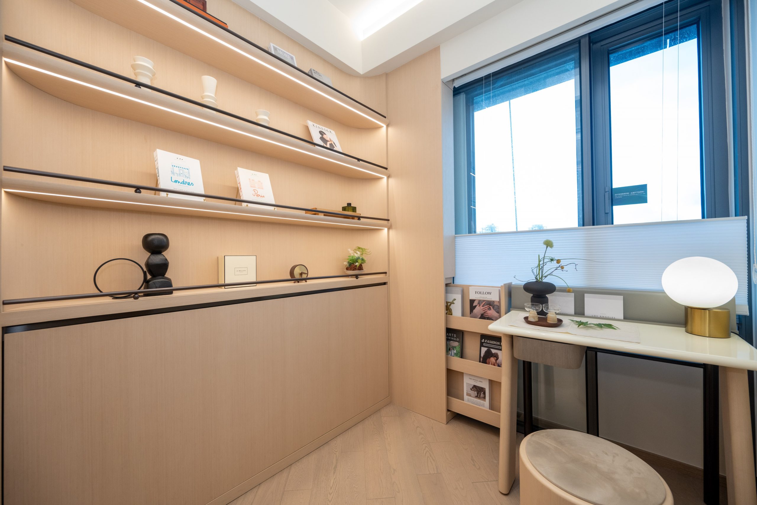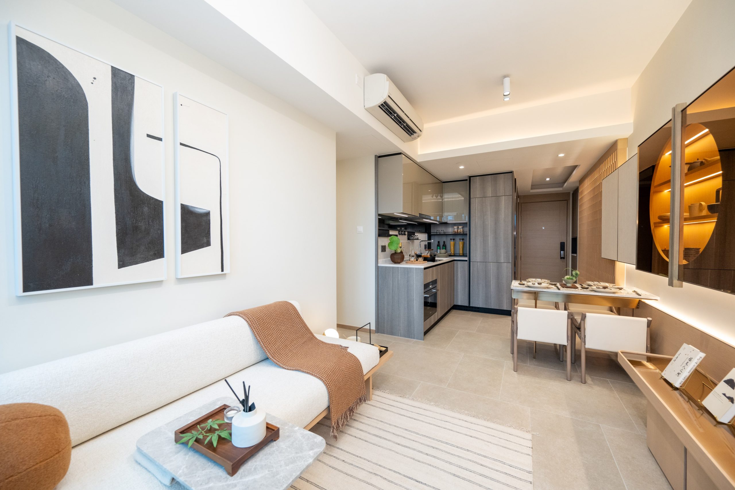 新鴻基地產旗下港鐵元朗站物業發展項目The YOHO Hub第C期「The YOHO Hub II」設有4個連裝修及家具示範單位,涵蓋兩房及三房戶型;其中8座30樓J室,實用面積639方呎,三房一套房連開放式廚房間隔,包括一個23方呎的露台及16方呎的工作平台。單位整體的布置以日式為主題,用上大量暖色調裝潢以及木製家品連貫各空間,營造溫馨舒適又別具和式風雅的品味生活空間。單位大門側設有一組高身深色木紋儲物櫃,為住戶提供儲物空間,更設有充電插座及置物空間,方便住戶放置鎖匙零錢等物品。