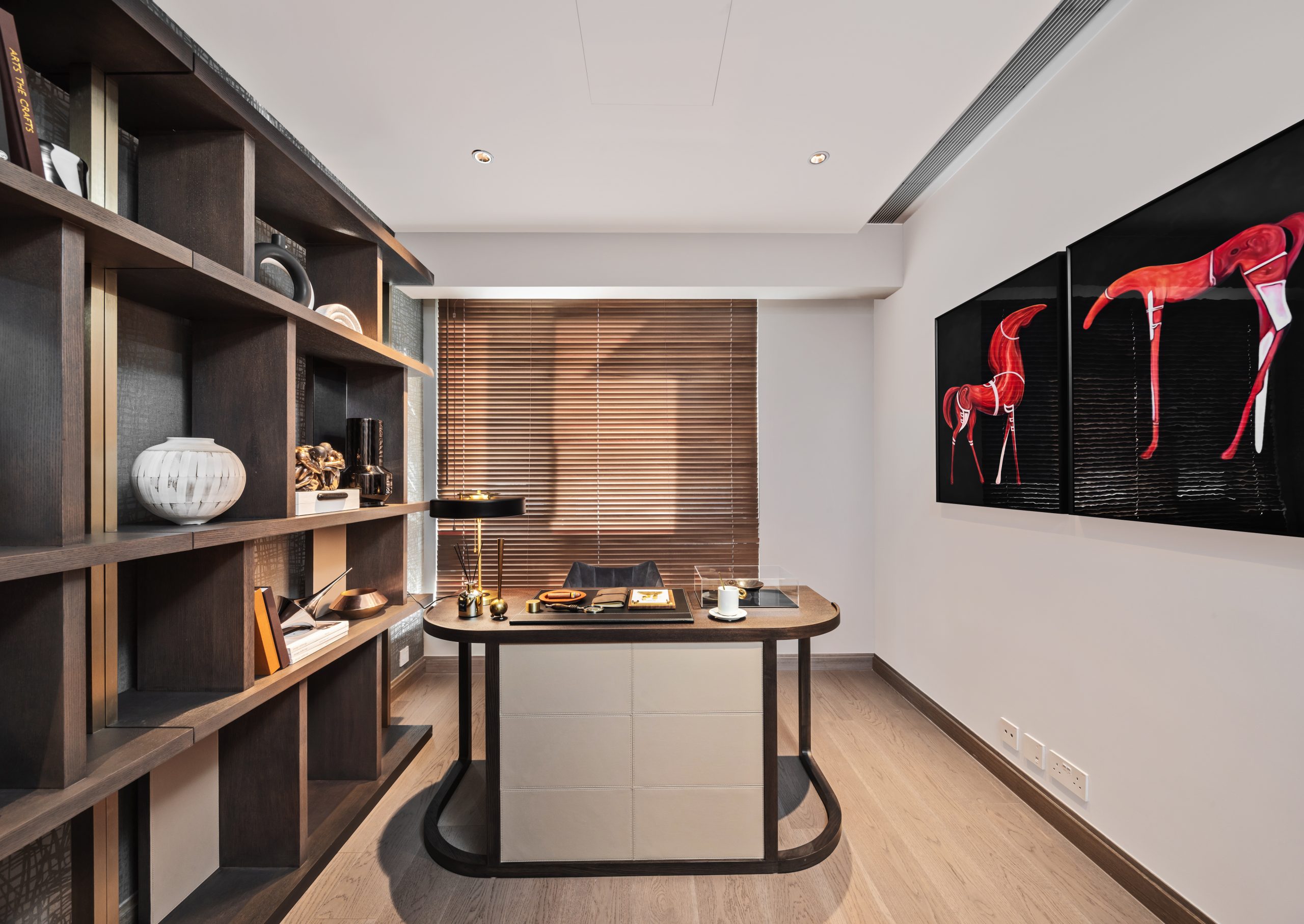 沿樓梯步上一樓是寢室區,包括套房、睡房、書房、工人房和小偏廳。設計師將衣帽室打造成小偏廳,設有一張三座小梳化,供屋主和家人閒談短聚。其中套房以深灰和啡色為主調,配上原木色的地板及家具,於床頭掛有一幅馬匹畫作,作為屋主父母的寢室,風格沉穩成熟亦不失貴氣。女兒房間以淺粉紅色為主題,充滿少女情懷。書房簡潔明亮,靠窗放置了一張深啡色馬鞍型書桌,旁邊擺放了一個與書枱顏色相符的大書櫃,牆上掛了兩幅以馬匹為主題的抽象畫作。書桌前還有足夠空間放置一張圓型單人梳化及小茶几。