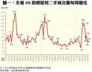 利嘉閣地產研究部主管陳海潮表示,近期新盤攻勢浪接浪,大量搶去市場焦點,二手業主對後市相對樂觀,在無太大意欲降價遷就下,造成二手交投表現十分緩慢,連周在撤辣後的低位窄幅上落。綜合利嘉閣地產分行數據所得,全港50個指標屋苑於上周(29/4—5/5)共錄76宗買賣個案,較前周(22/4—28/4)的69宗增加10%,終止兩周跌勢,但仍為自樓市撤辣起十個星期以來次低。