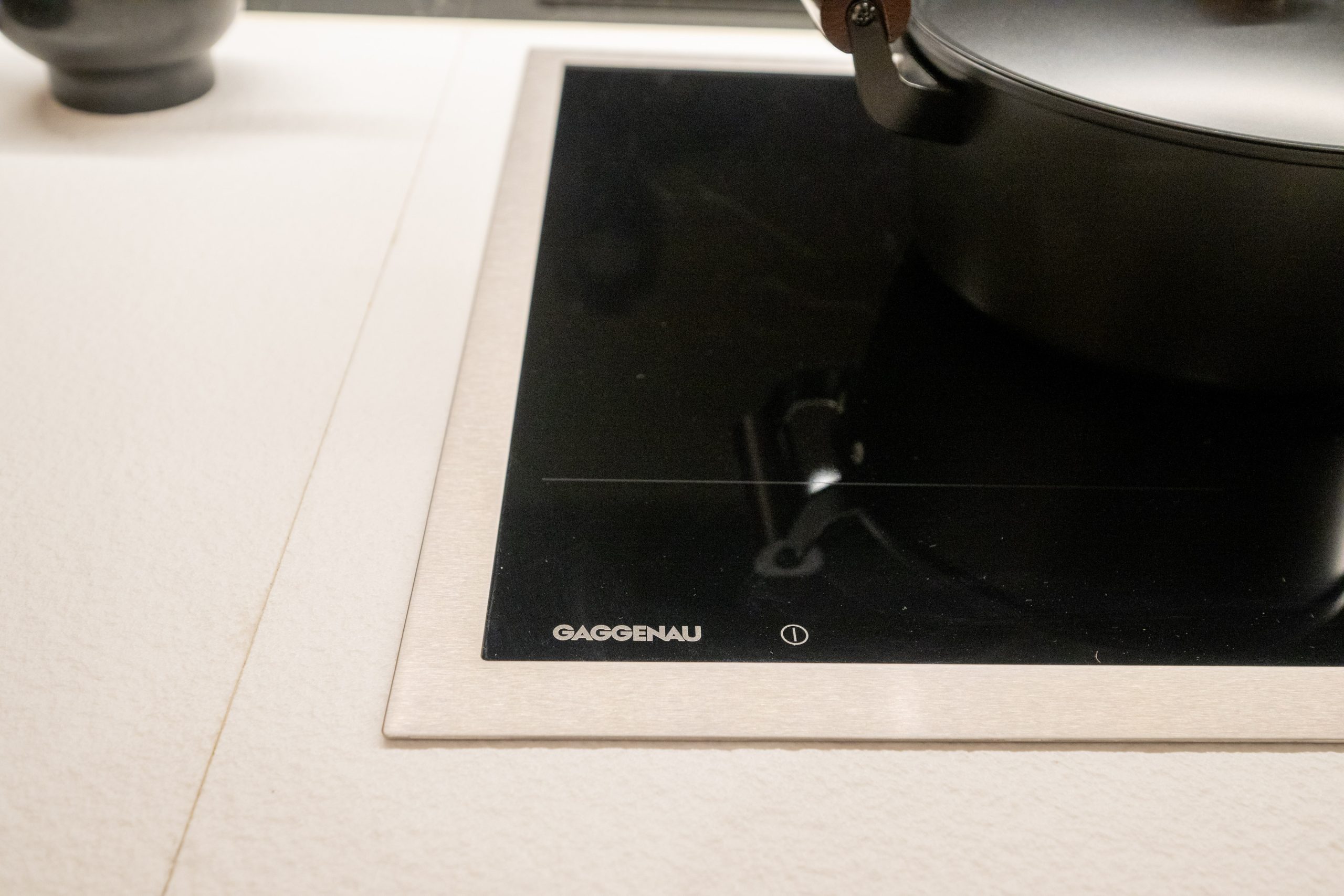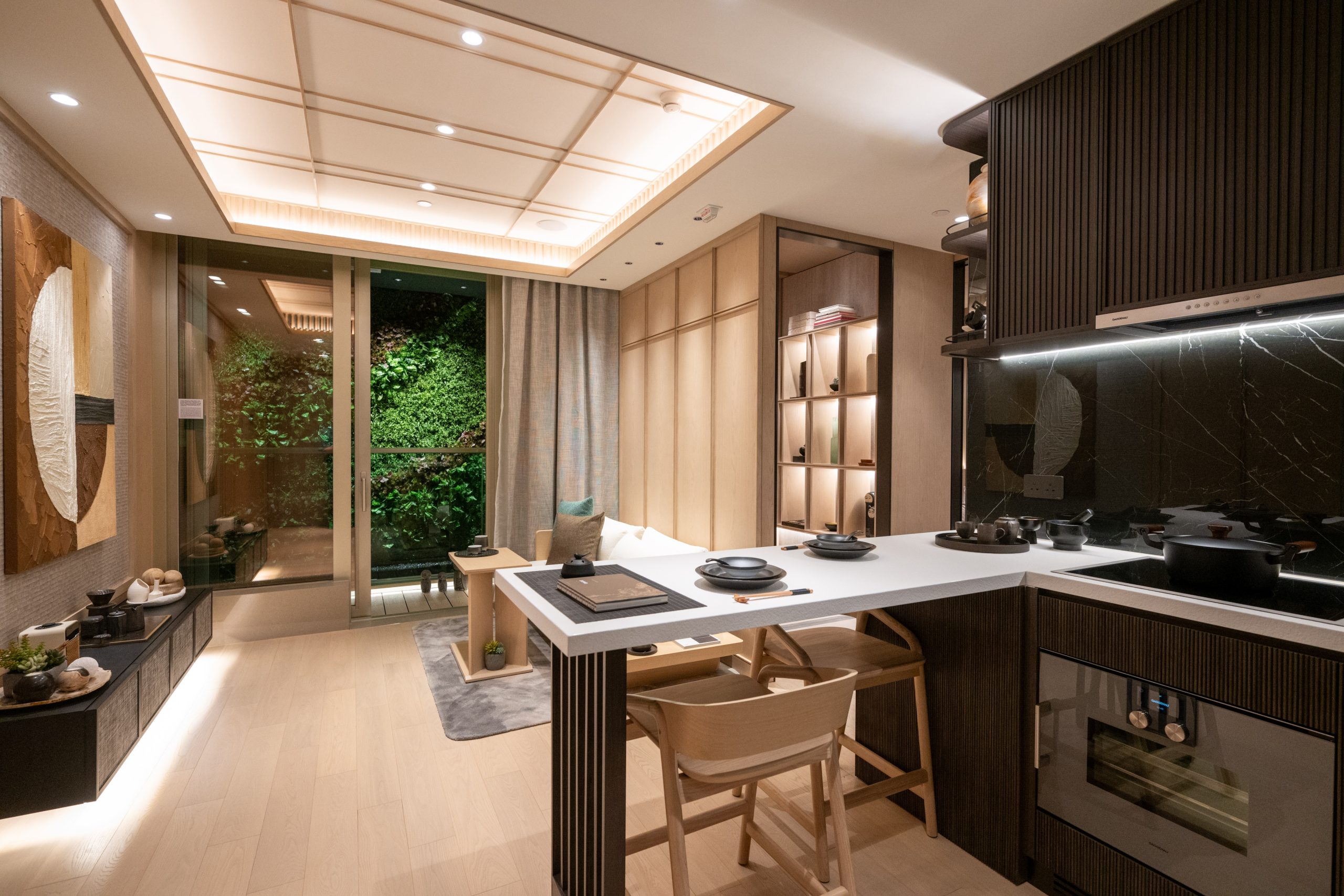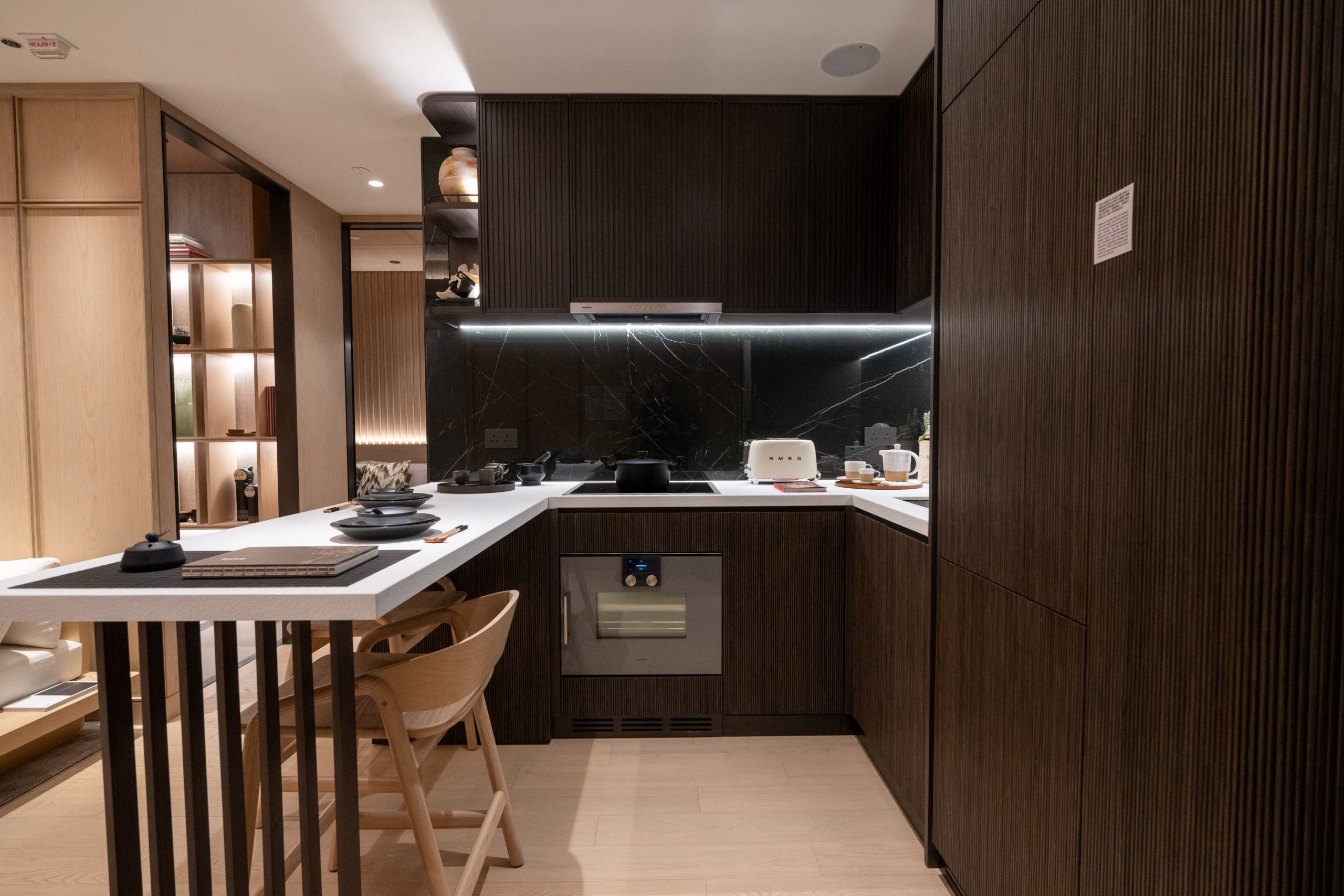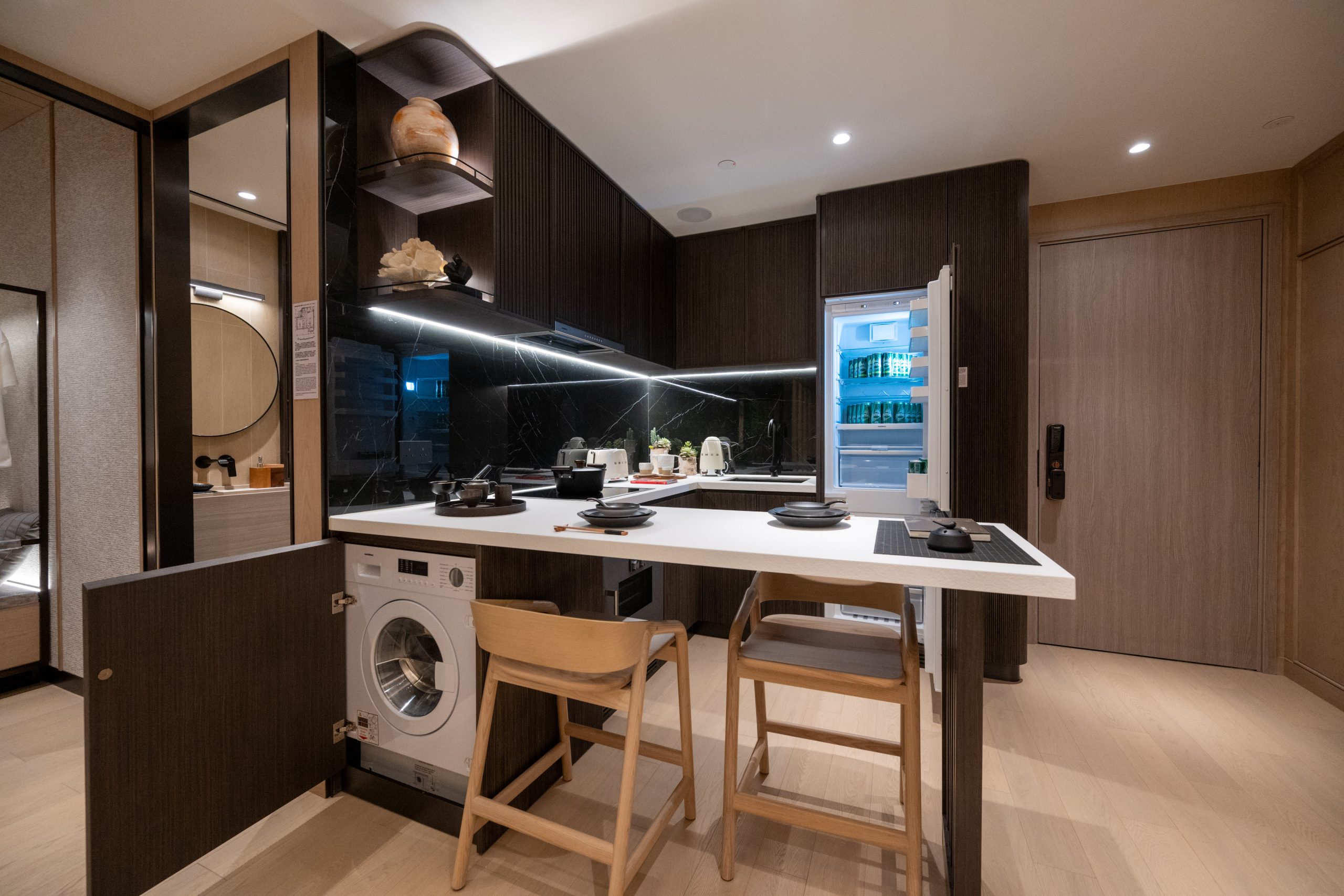 另外,單位廚房採用開放式設計,設計師將吧枱和開放式廚房連接起來,除方便用餐更提升空間實用性。開放式廚房使用深啡色隱藏式櫃門設置多個吊櫃,避免凌亂的感覺之餘,提供大量儲物空間。檯面選用白色天然石材料,並搭配搭深色系碟具,增添藝術簡約氣氛之餘,帶出簡潔日式元素。