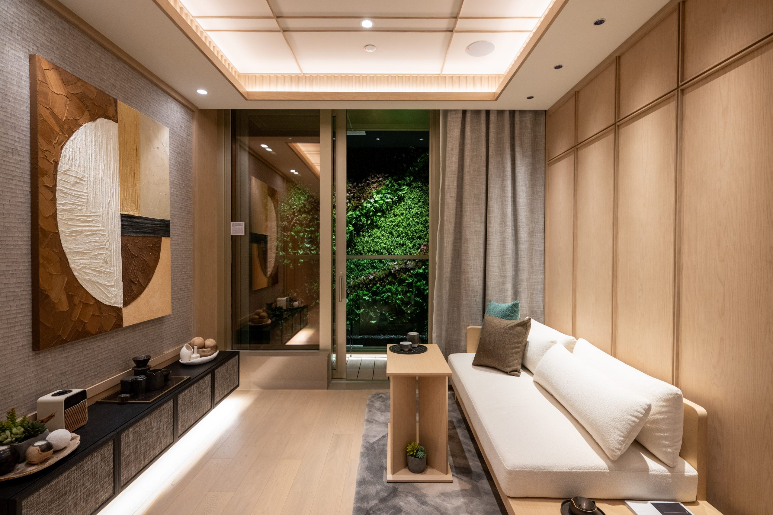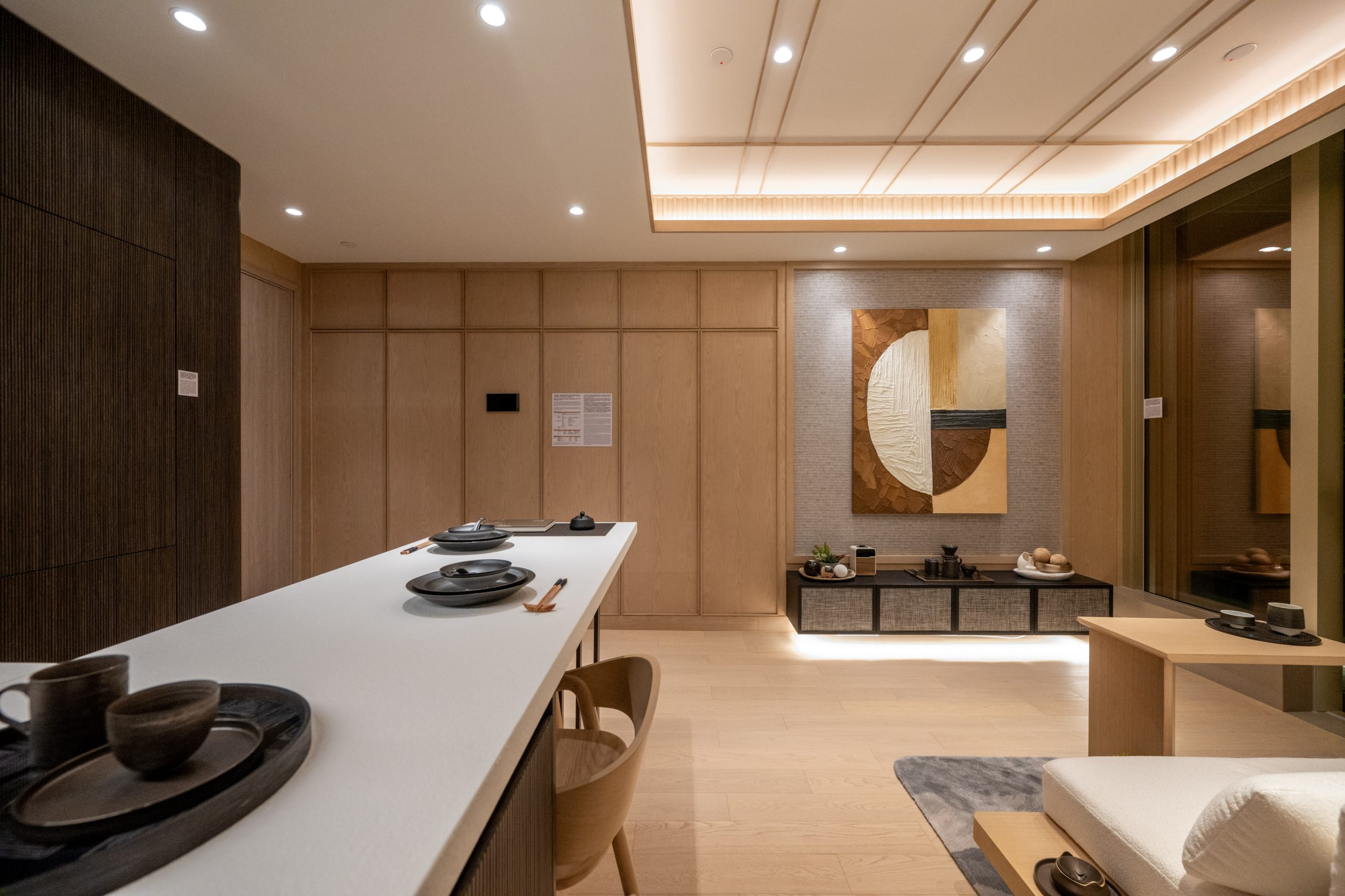 單位特別採用米色木紋地板鋪砌,整體利用柔和大地色配上簡潔綫條作襯托,客廳以淺色原木作主調,打造日系簡樸舒適的氛圍。客飯廳放置簡約米白色的玄木梳化連茶几,前面放置淺木色C型架空茶几。牆身以淺原木色和米灰色暗紋為設計,配上不規則圓形的簡單綫條掛畫。牆下架空黑色電視櫃配上隱藏燈槽,可擺放日式茶具或陶瓷作裝飾。客飯廳連接戶外露台,採用落地大玻璃趟門設計飽覽翠綠渣甸山巒,提高客飯廳的採光度之餘,如同延申並置身大自然之中,營造「禪」的寧靜氣氛。