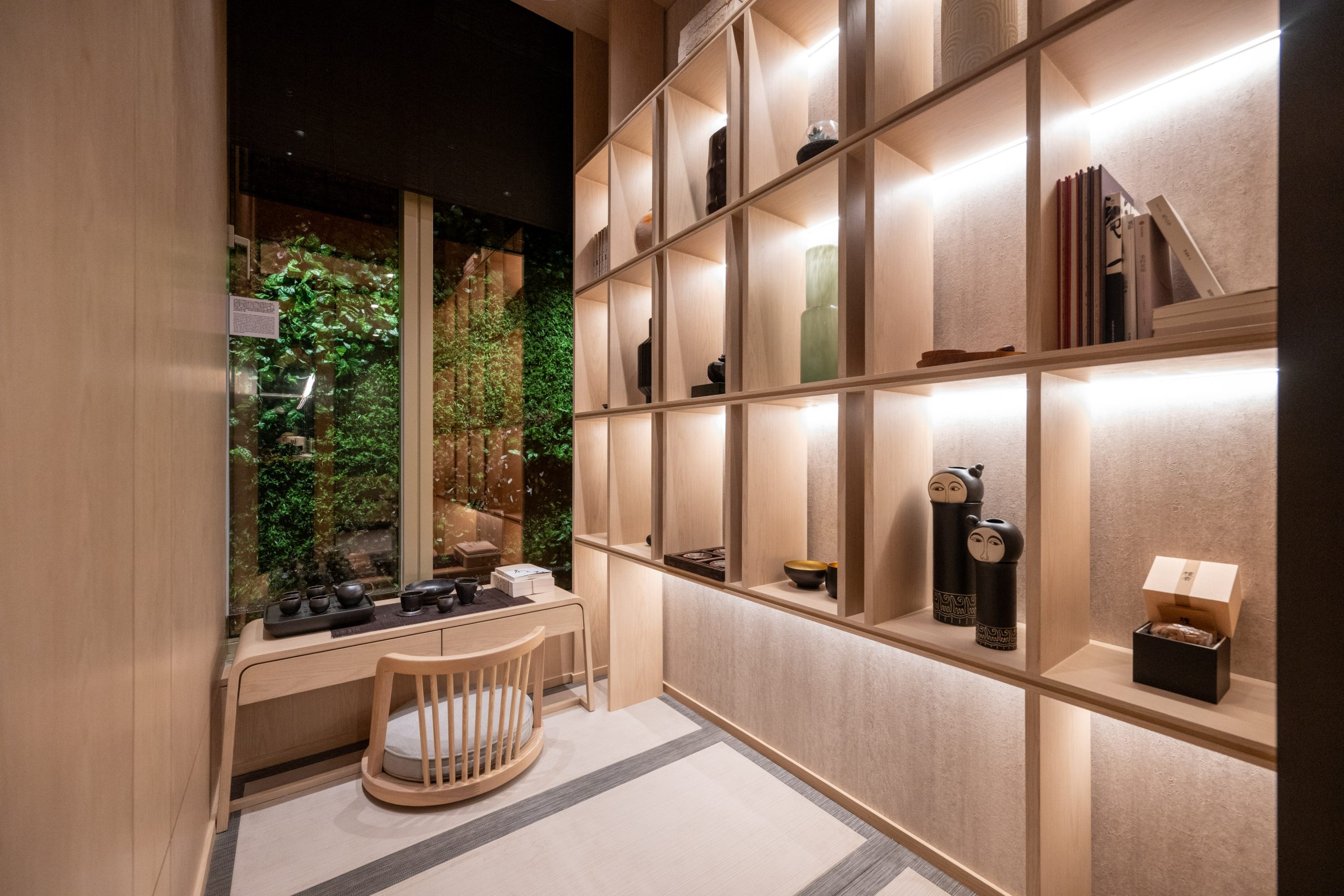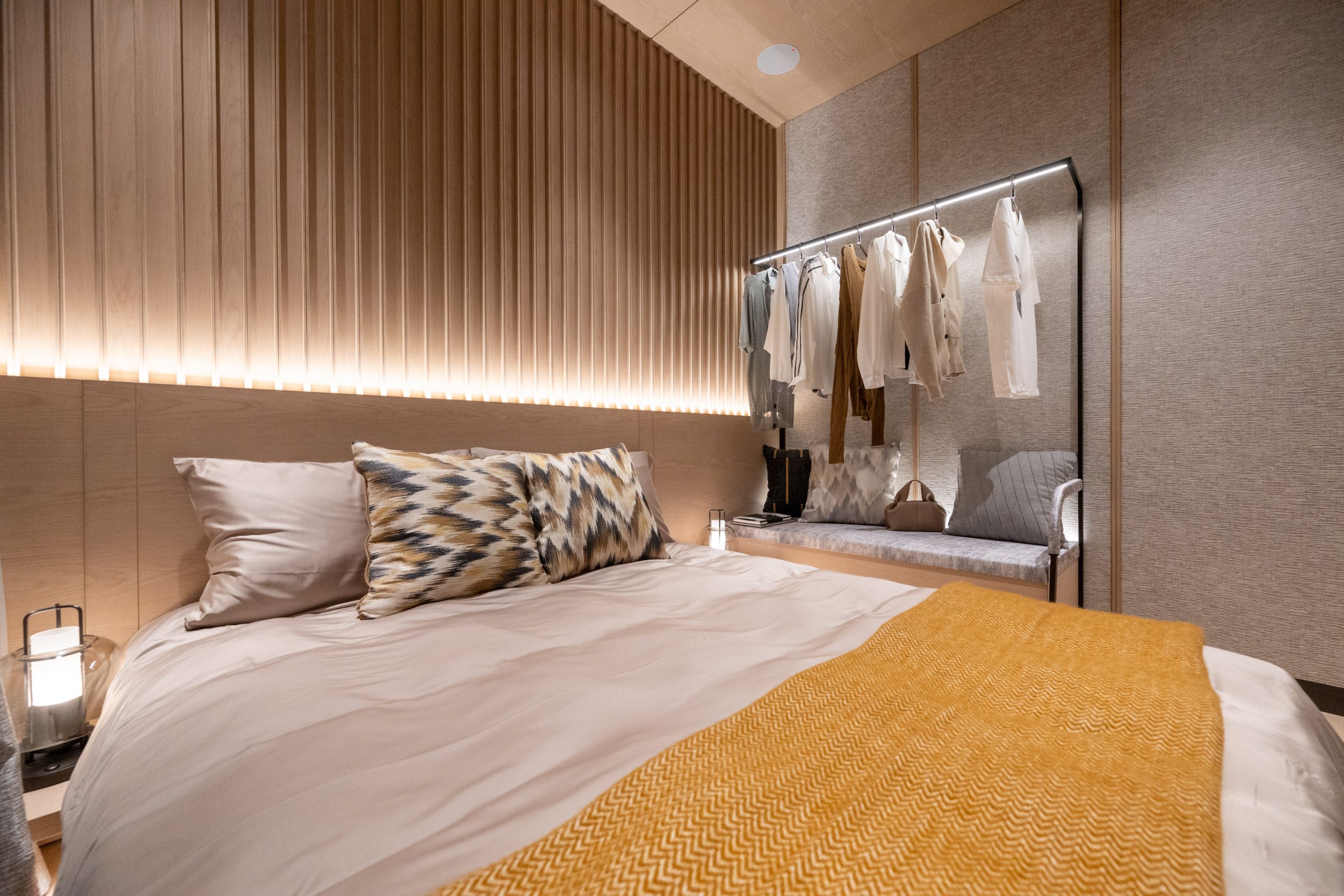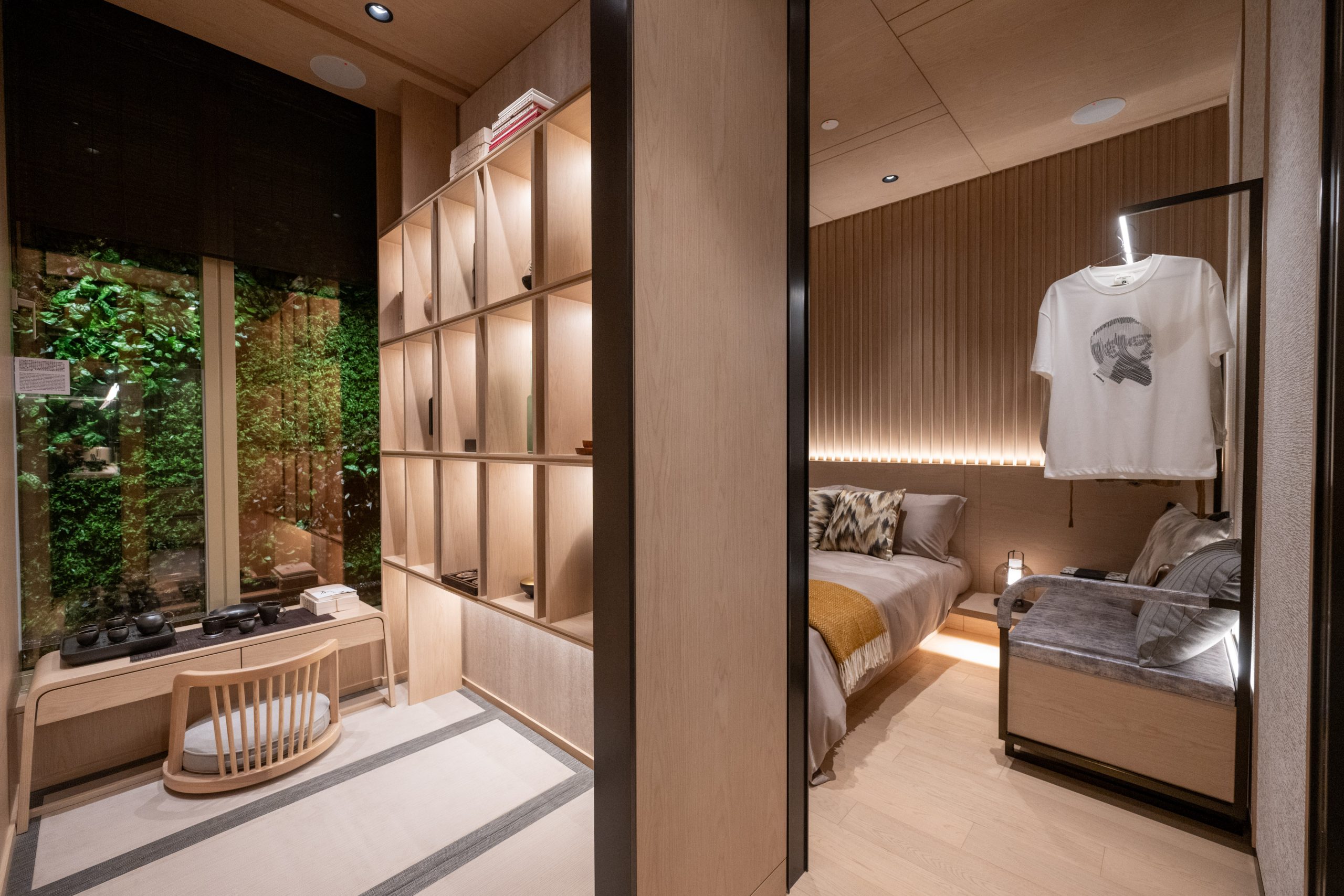 設計師在規劃睡房1時按照建築師的設計原意,將帶窗戶的儲物室打造成收藏室,房間設有落地大玻璃窗;另特別選用榻榻米鋪砌地板,牆邊實木層架放置充滿禪意美學和東方元素的家具及生活擺設。窗前擺放同色系實木和室椅桌,可供住戶靜靜地呷一口茗茶,猶如置身於日式美學的自然環境之中。主人睡房空間方正寬敞,落地玻璃窗將自然光線與四周綠意引入室內。胡桃木條牆身營造溫馨舒適的臥室環境,雙人大床的另一側擺放一體式梳化連開放式高身衣櫃。