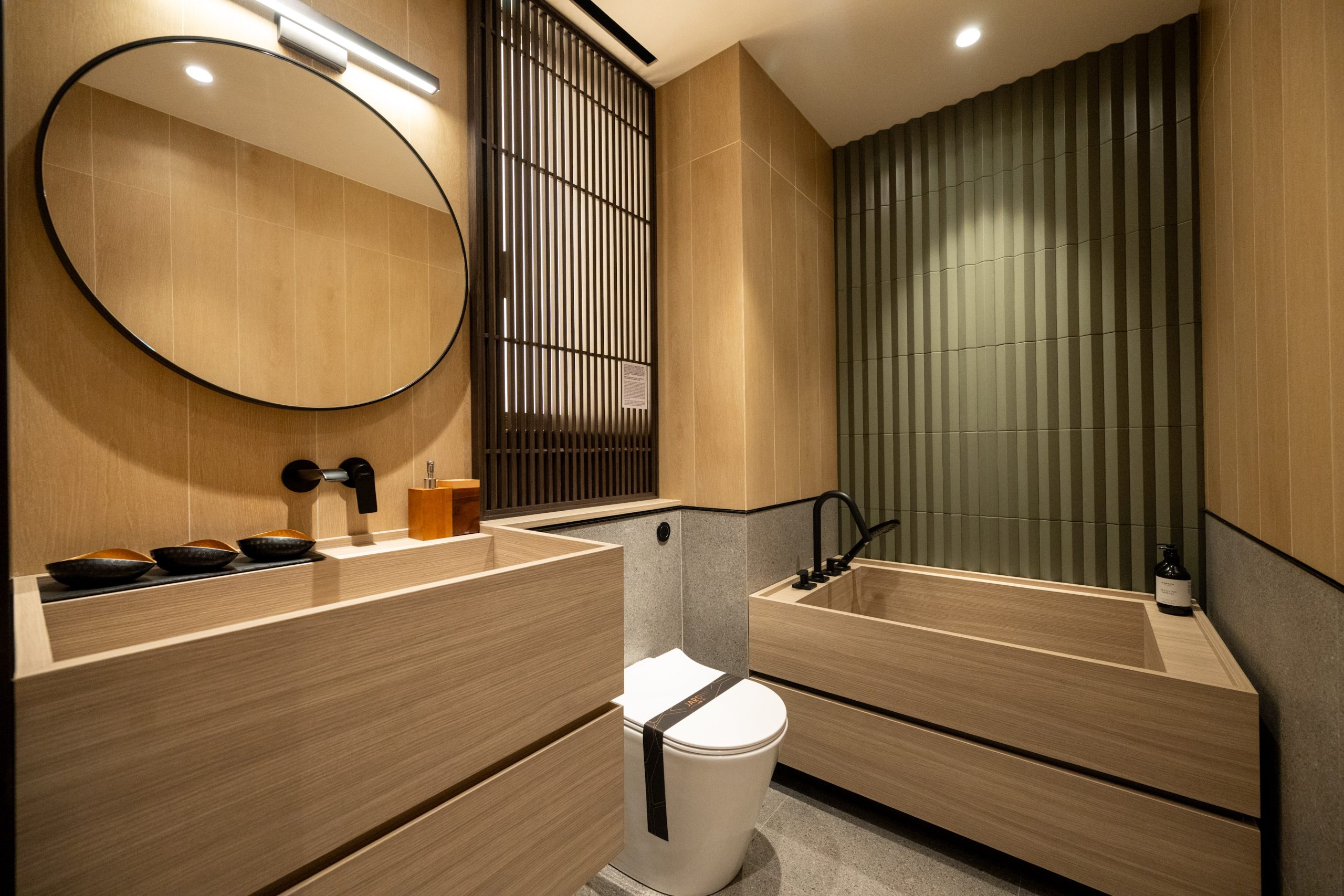 浴室貫徹全屋日式設計,設計靈感取自日式風呂文化,以淺木色調營造出寧靜和放鬆的氛圍。設計師仿照日本溫泉的設計風格,安裝一個傳統的日式淋浴和浴缸結合的和式浴缸,可供住戶坐著入浴。洗手盆檯面連儲物櫃同樣選用和式浴缸的物料打造而成,配以大圓鏡,為浴室增添獨特的日式韻味。