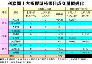 《利嘉閣十大指標屋苑假日二手實況》 新盤低開吸客 息口走勢未明 二手氣氛壓抑 周末十大屋苑錄3宗買賣 按周急挫57%