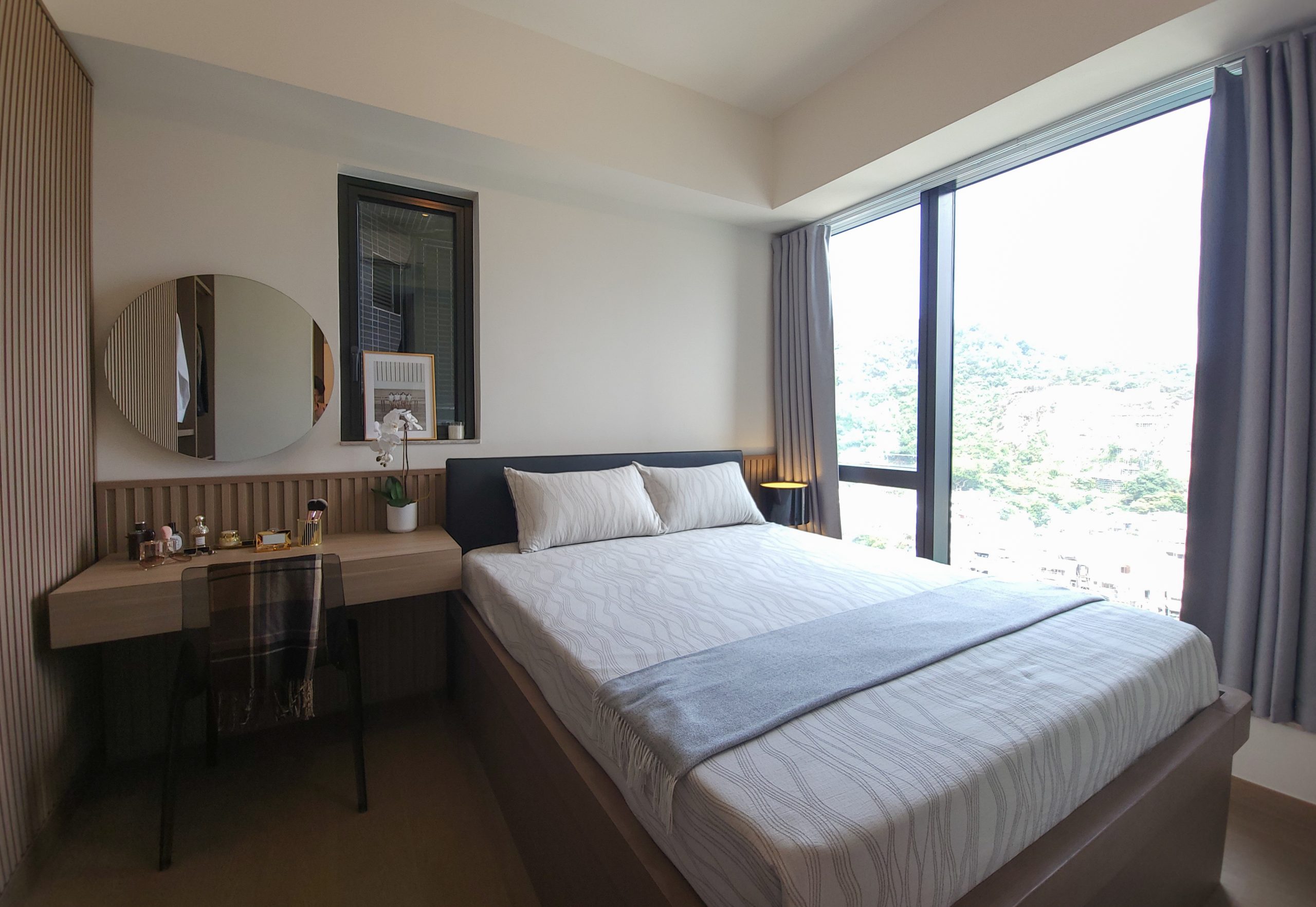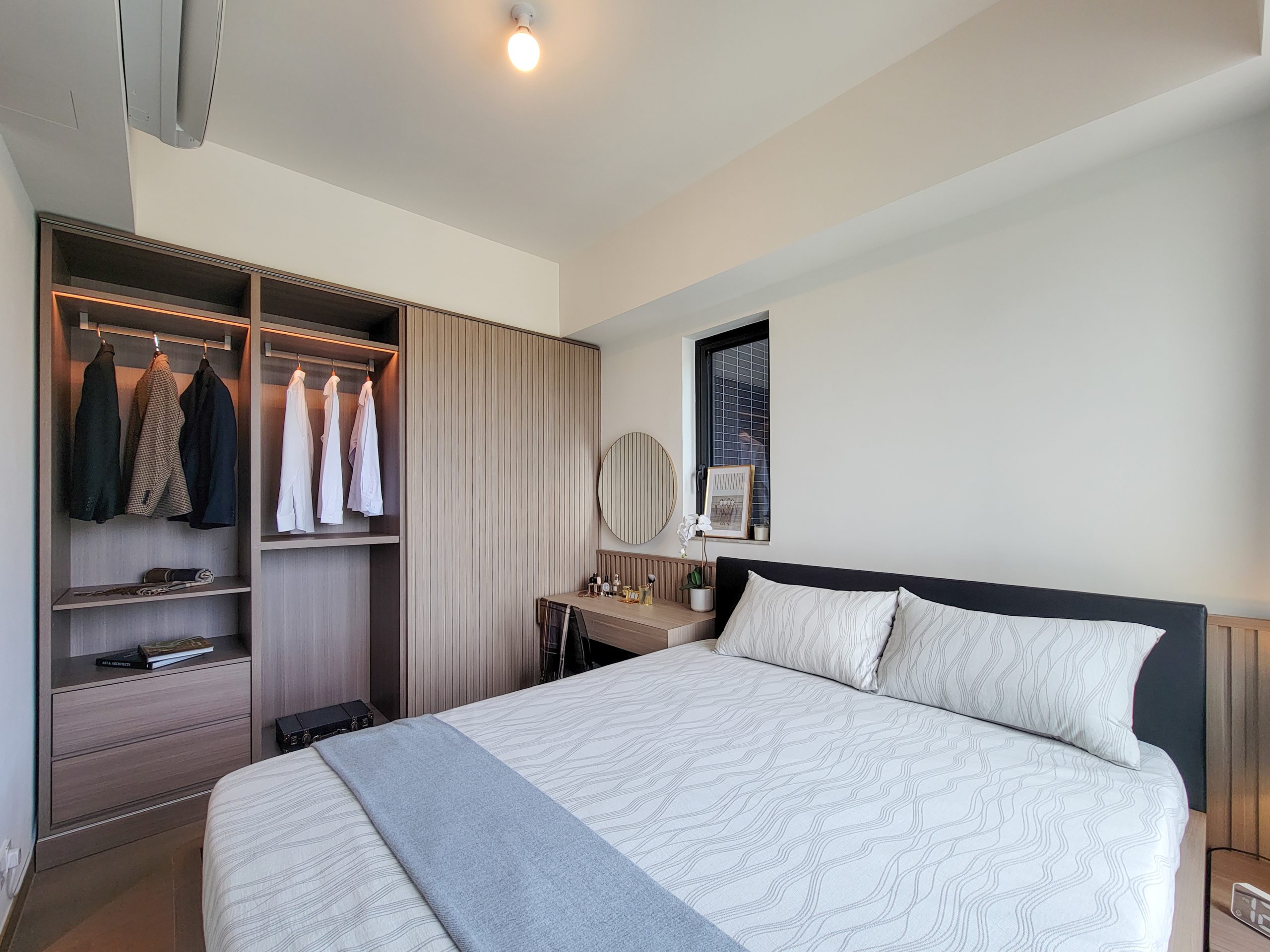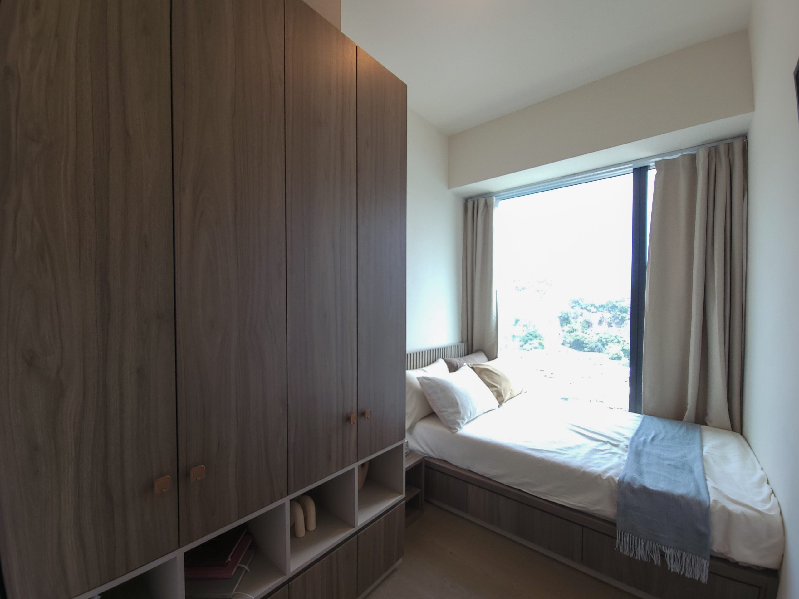 主人套房面向東南方向,設計師特意擺放一套純白雙人床具,床具表面典雅淳樸。大床旁邊放置一張和風木桌,供戶主擺放盆栽等小型裝飾;配上大圓鏡後,整個空間隨即蛻變成時尚典雅的梳妝枱;左方更設有木色系全高衣櫃組合,提高主人房的實用性。睡房1沿用簡約的灰白色調,另配置一組以雙層床設計的傢俬組合。睡房2整體以大地顏色營造日系清新的主調,設計師在簡約純白的單人床旁邊,訂造一個入牆木製組合高櫃,充分利用每吋空間作收納之用。 櫃身設有多個分櫃,功能齊全,戶主亦可按照家庭需求自由組合。