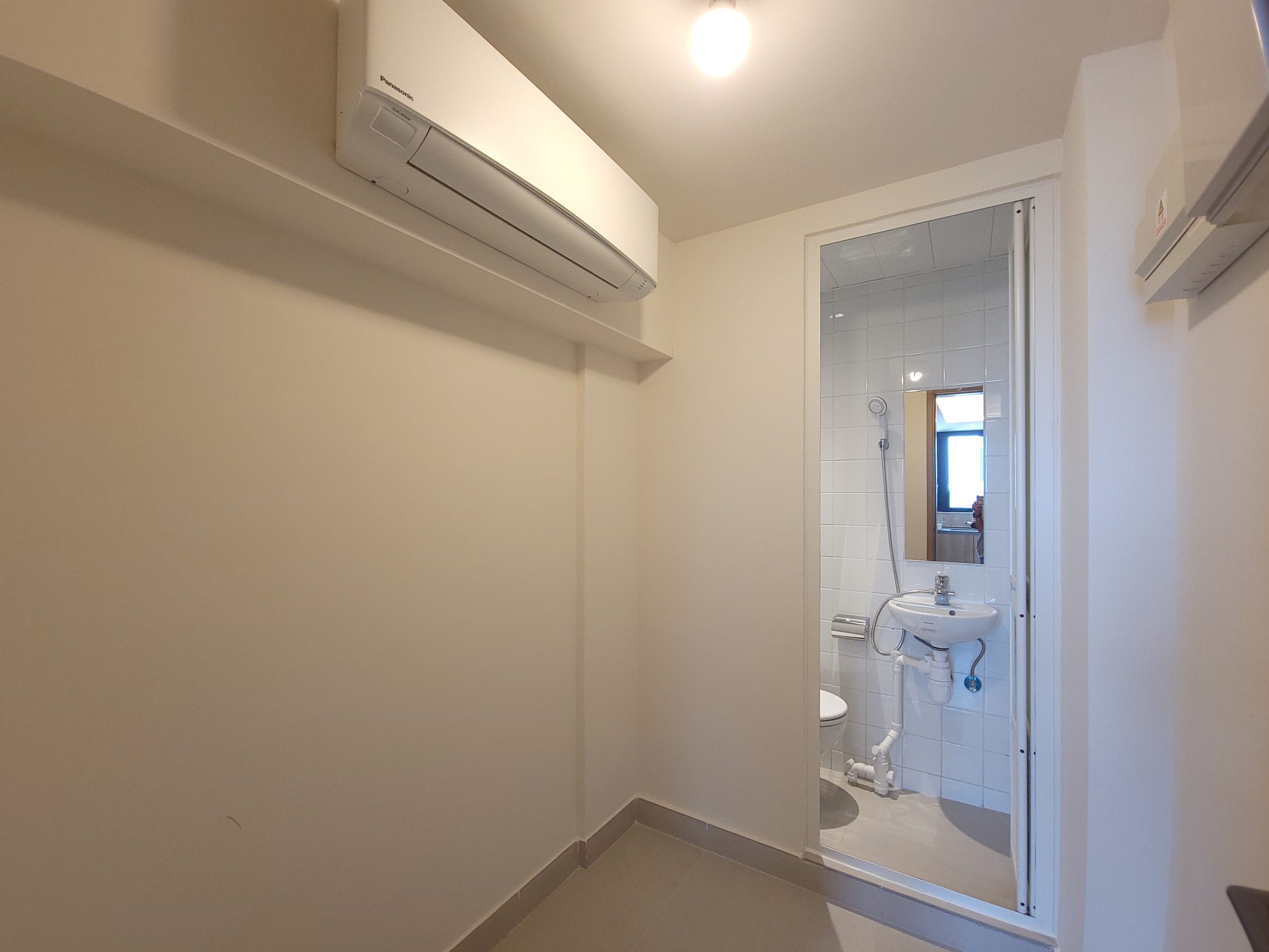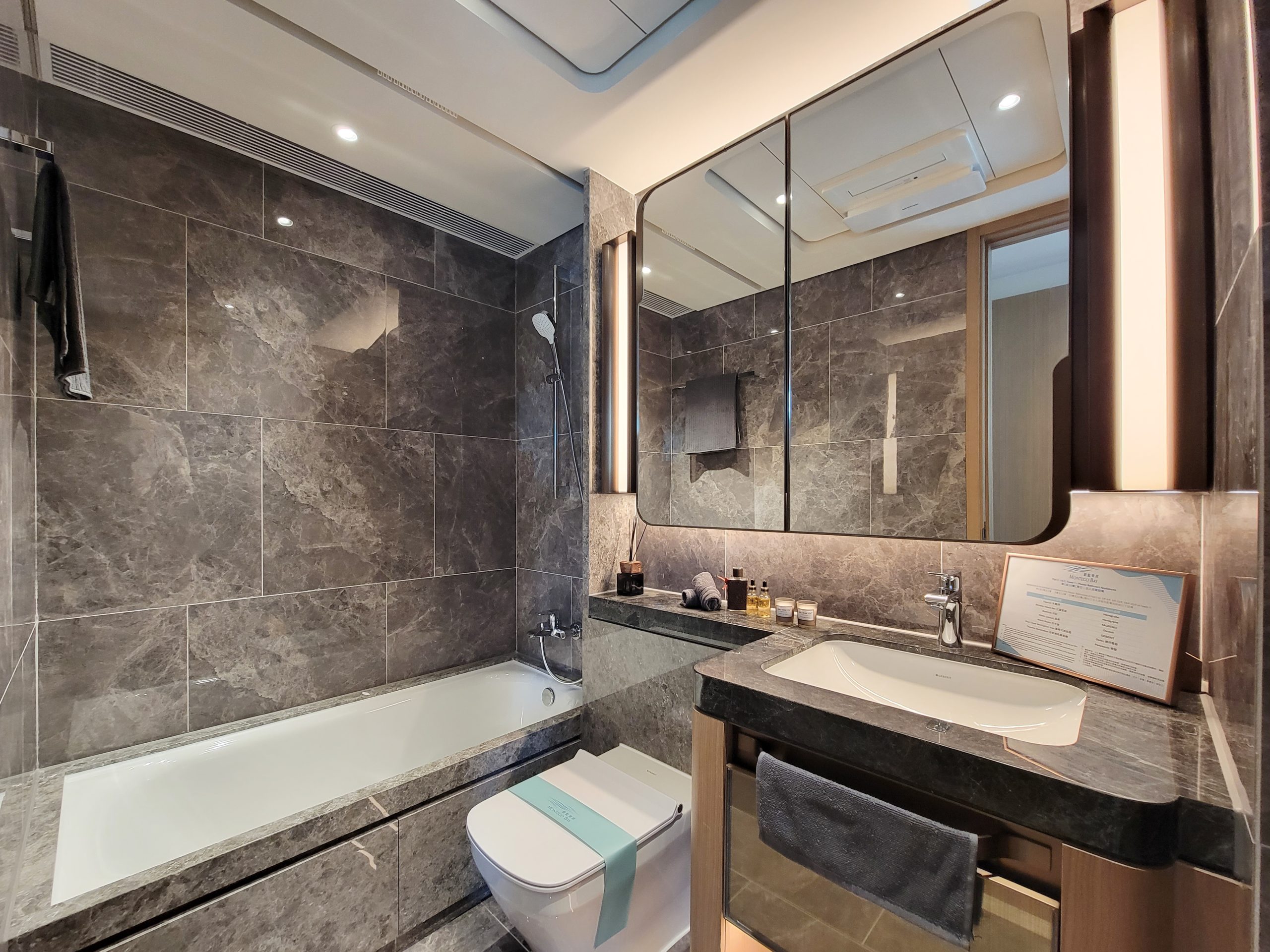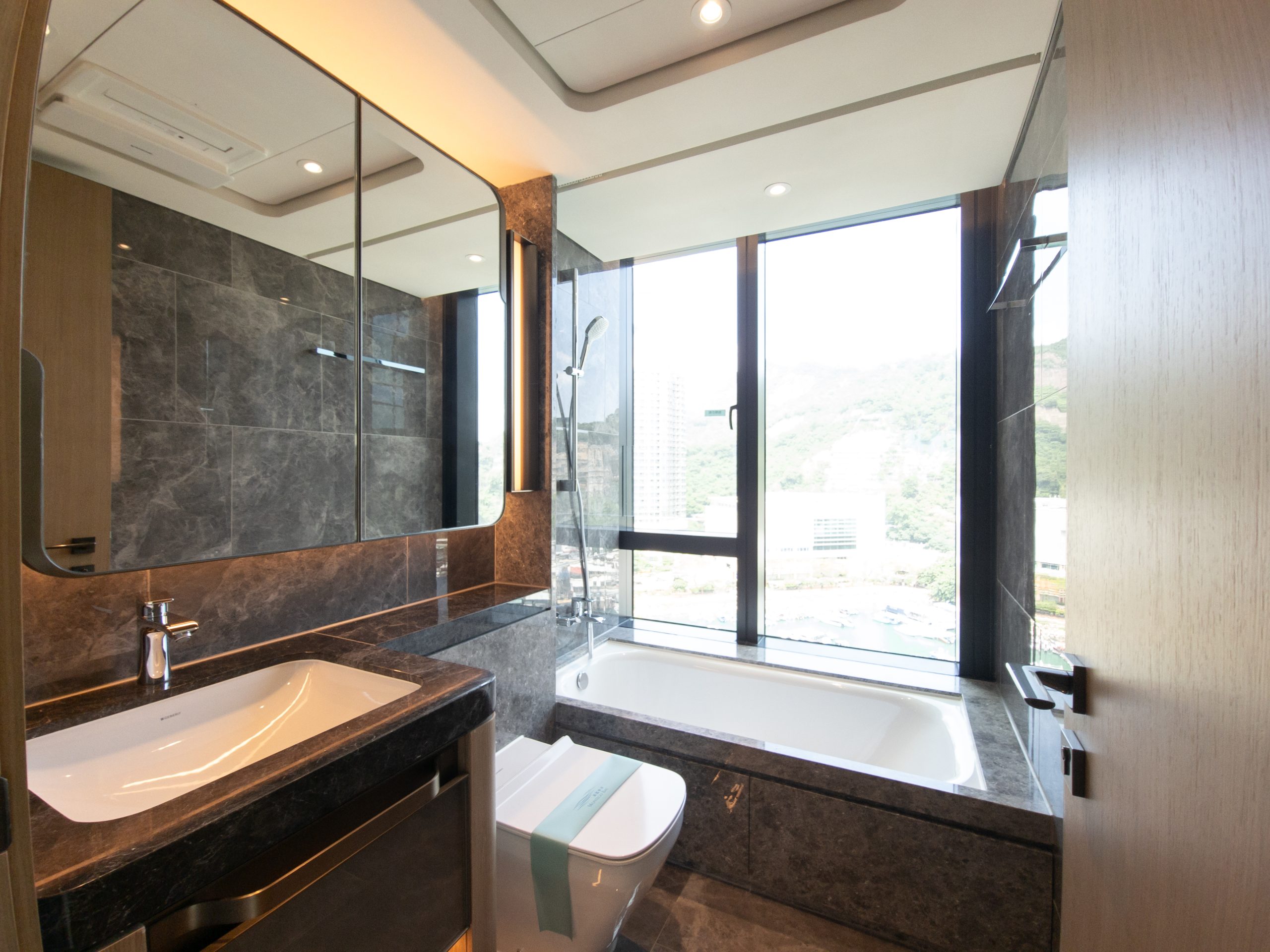 主人套房長約3.15米、闊2.6米,備有足夠空間設置可三邊落床的大床、床頭櫃、衣櫃及梳妝枱;房間與客廳同樣面向南方,加上設有大型曲尺窗,採光度高,將避風塘及藍塘海峽的寧靜舒適景觀飽覽無遺。套房廁所屬明廁設計,可採納鮮風入戶,設備實用與華麗兼備,除了設有浴缸外,浴室櫃亦有充足的儲物空間及電掣位;洗手盆與枱面一體化,下層櫃桶除了可以儲物之外亦有滲光效果;浴室潔具同樣採用德國Hansgrohe及Duravit品牌,為住戶提供優質生活配備。客廁同樣屬於明廁設計,採用酒店式設計風格,黑白灰瓷磚鋪砌的牆身和地面增添典雅氣息。配置一組大型木質鏡櫃和同色系的面盤櫃,增加浴室的收納量,淋浴間旁特設層格放置沐浴用品。