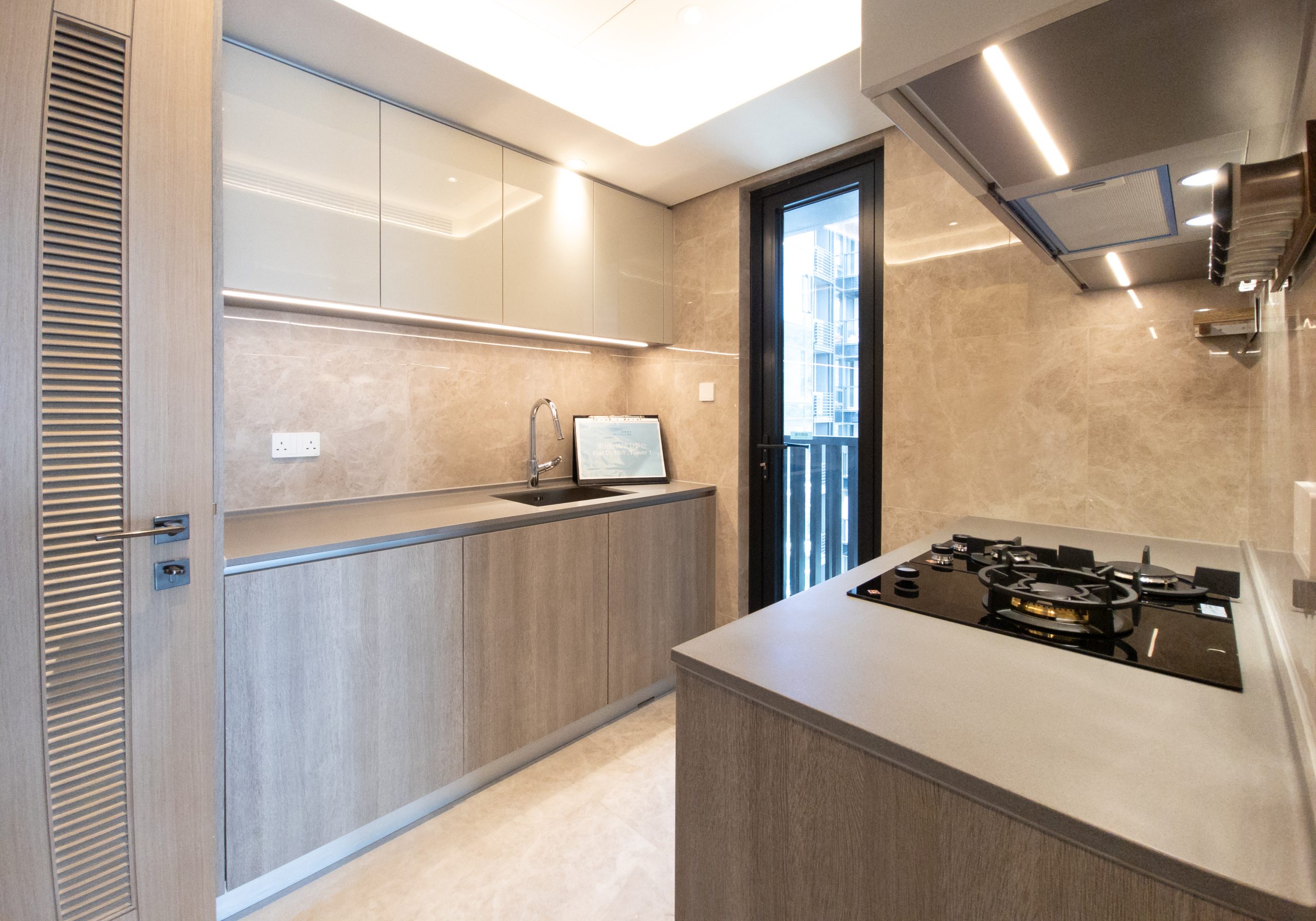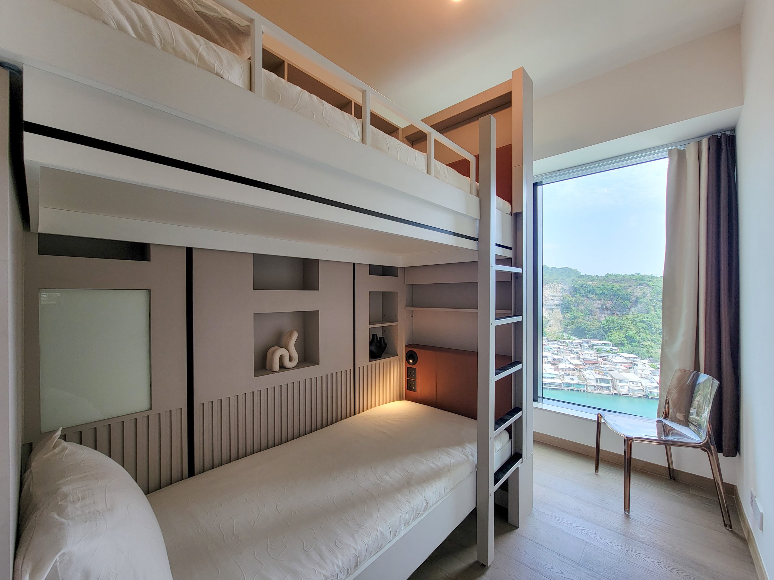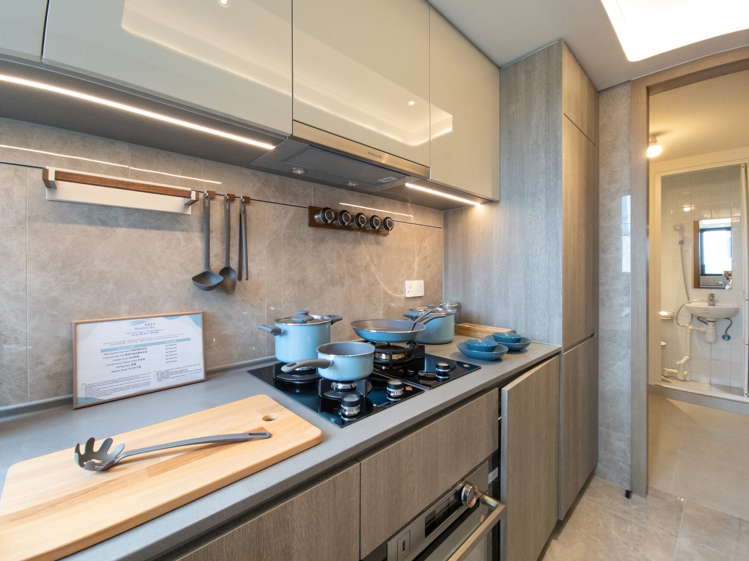 睡房1同樣向南望避風塘及藍塘海峽景,房間長約2.6米,闊約2.2米,間隔實用,可以輕鬆放置不同傢俬。睡房2外望避風塘山海景致,房間長2.2米,闊約2米,空間寬敞。廚房連接17呎工作平台,可以外望景觀之餘亦方便引入鮮風。廚房設有直排長身廚櫃,櫃底設有LED燈帶,入廚時光線充足,牆身設有掛鈎及吊架,櫃內設有內置垃圾桶,布局與細節設計均以用家角度出發。廚房洗碗盆採用罕有可調教水壓及伸縮設計的水龍頭,亦選用法國皇室御用品牌De Dietrich的炒鑊氣體煮食爐、雙頭炒鑊氣體煮食爐、抽油煙機、蒸焗爐、雪櫃及洗衣乾衣機。