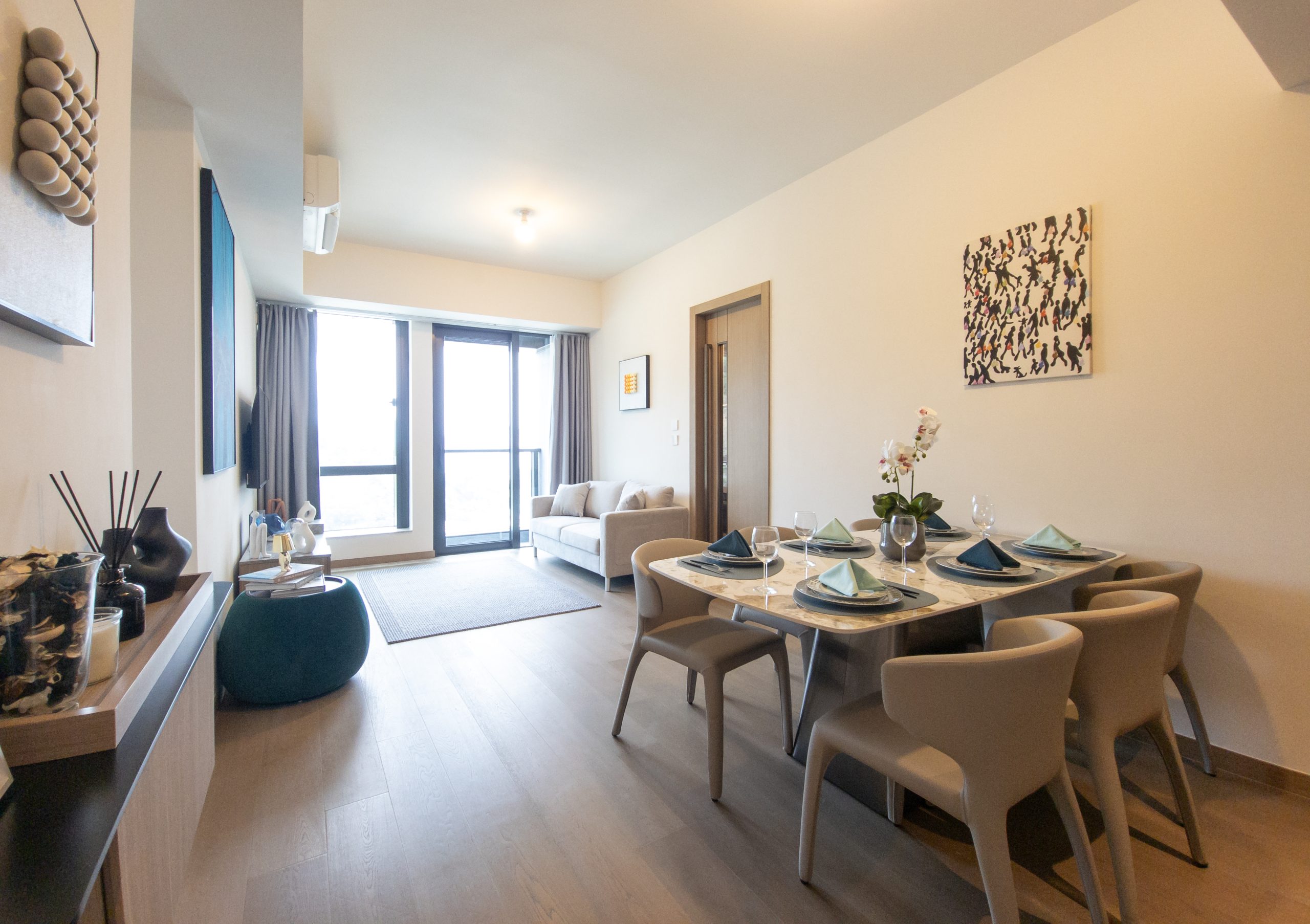 客飯廳長約6.4米,闊3.2米,飯廳放置一張大理石紋的六人餐枱及淺灰色餐椅,深灰梯形柱體餐枱腳突顯時尚感之餘,更令飯廳視覺上更為寬闊。餐枱上放置灰藍色餐墊和琴鍵造型餐碟等家居擺設,配搭灰色瓶身的鮮花綠葉。客廳放置淺灰色梳化,配上橢圓形墨綠色茶几沉穩靜謐,外望蔚藍大海。正對面的掛牆電視機組合,不僅可以節省空間,下方木紋地櫃更可用作擺放小飾物及收納之用,木紋地櫃更以灰色石材作飾面。廚房內設儲物室及洗手間可作多用途使用,煮食相關的家電設備全採用法國品牌De Dietrich的產品,設備一應齊全。三頭明火煮食爐讓住戶可因應爐具尺寸和煮食需要自由使用,另外亦配置抽油煙機,蒸焗爐及雪櫃。同牌子的洗衣乾衣機能一機兩用,節能同時減低衣物損耗,又節省家居空間。
