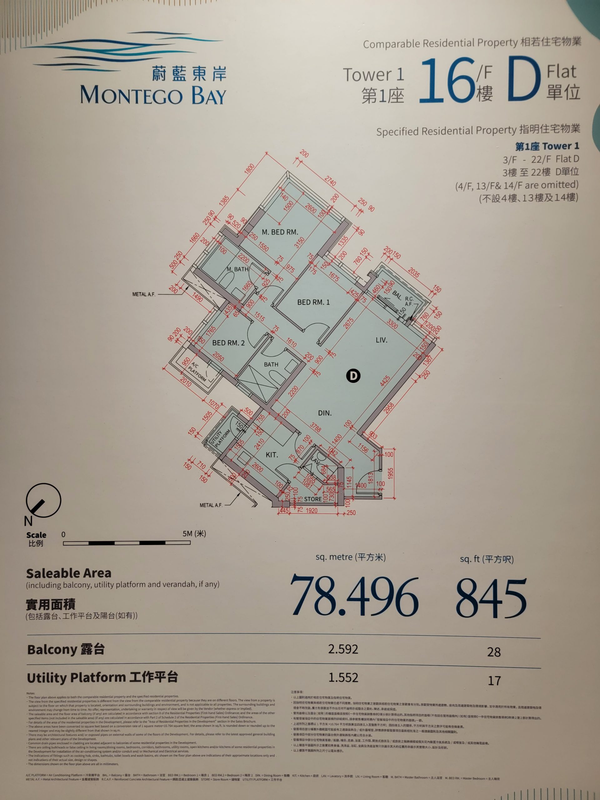 另一無改動交樓標準三房示範單位為第1座16樓D室,實用面積845方呎,連28方呎露台及17方呎工作平台,三房一套連儲物室及洗手間。單位位於前排向南位置,面向三家村避風塘及藍塘海峽美景。長方形客飯廳長約5.9米、闊3.3米,可輕易劃分開客廳區及飯廳區,擺放傢俬後仍有足夠活動空間。層與層之間高度為3.1米,客廳相連露台,加上全幅落地玻璃窗,將室外海景引入屋內,兼採光率高,令室內顯得更為寬敞實用。儲物室設有冷氣機及獨立洗手間,可以靈活使用。