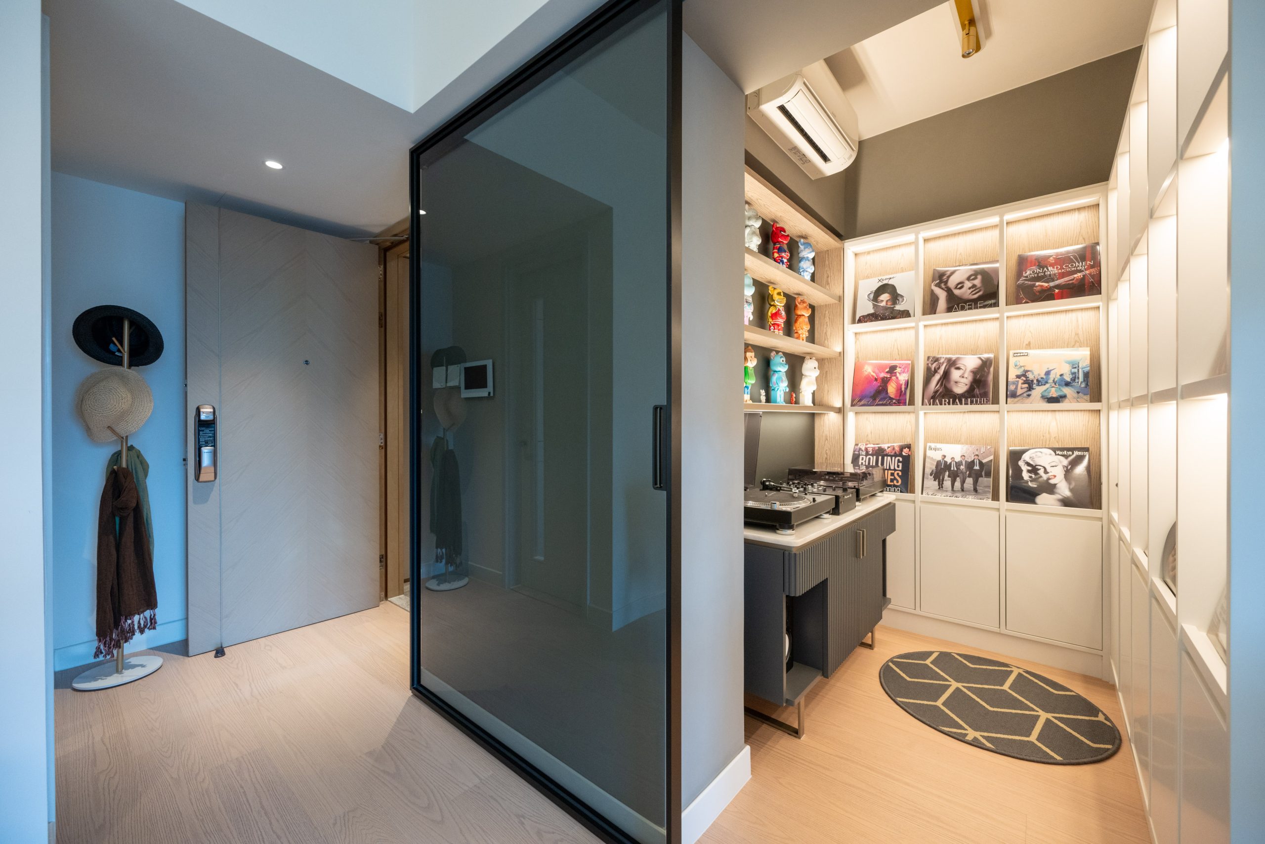 主人房以型格黑灰米色為基調,以跳躍橙色家品作點綴,優雅大氣。大玻璃與室內現代感黑色玻璃入墻衣櫃呼應,通透豁然。雙人大床可三邊落床,旁設法式簡約梳妝台,更望向遊輪碼頭及維港海景,舒適愜意。睡房1連專屬平台,飽覽維港景觀,亦可改造為個人書房。兒童房以湖水綠配明黃色為主色,色彩明媚,配以充滿童趣的藝術畫作,抱枕及公仔等裝飾,活力十足。