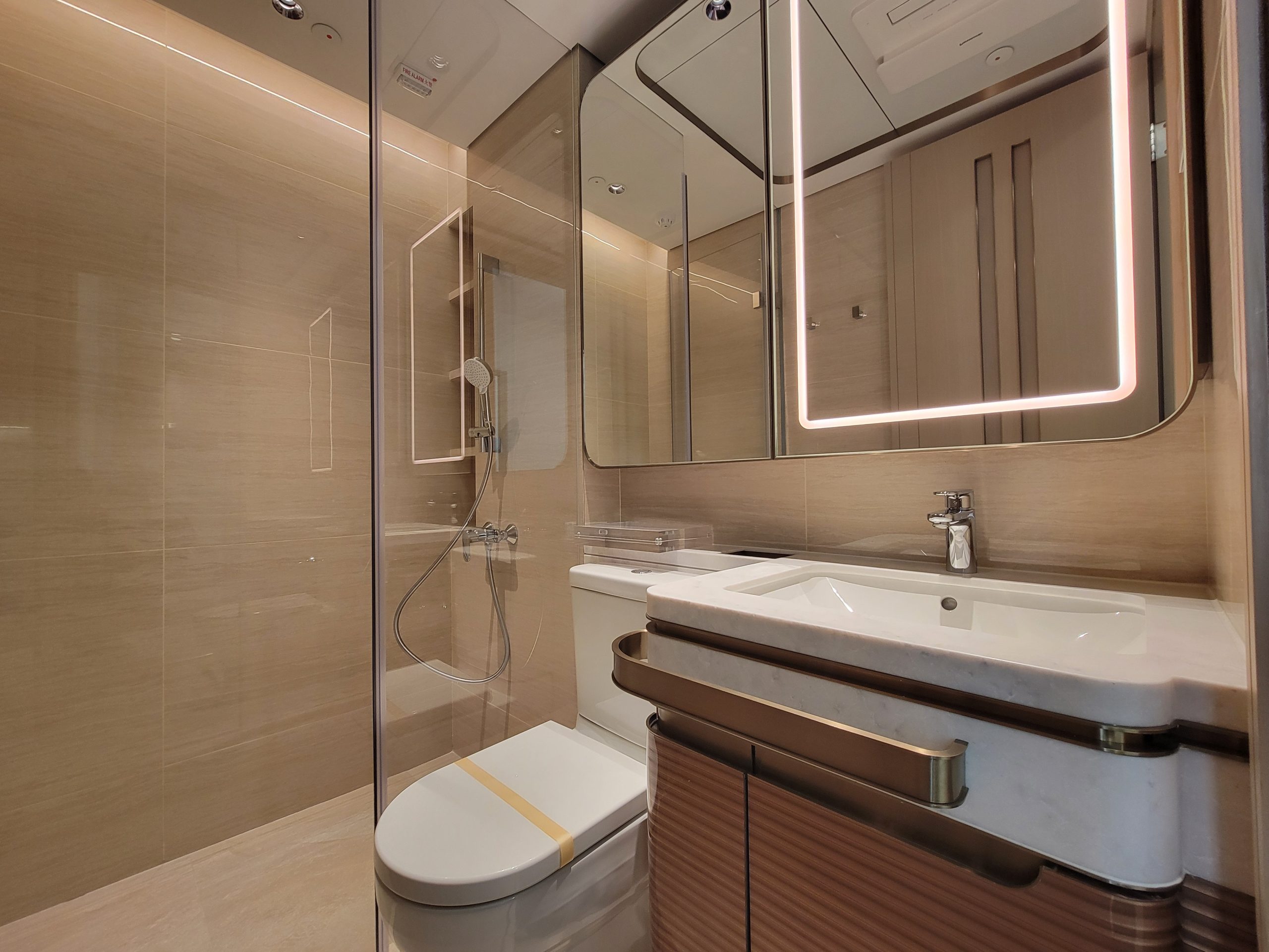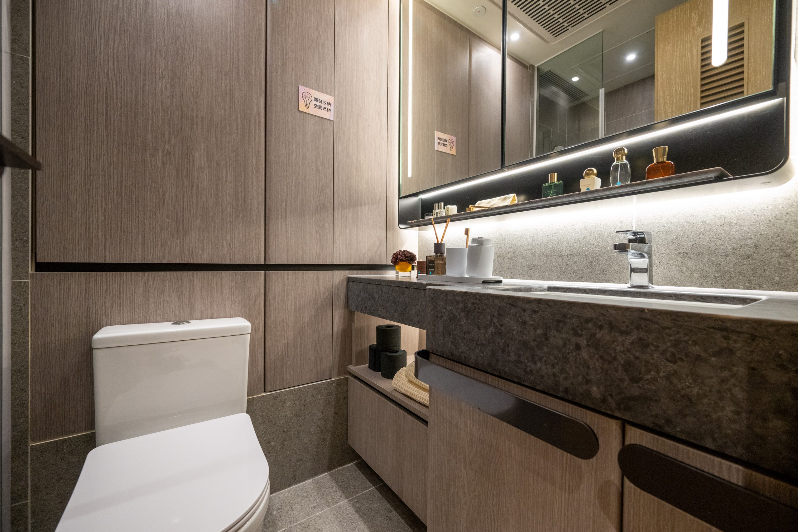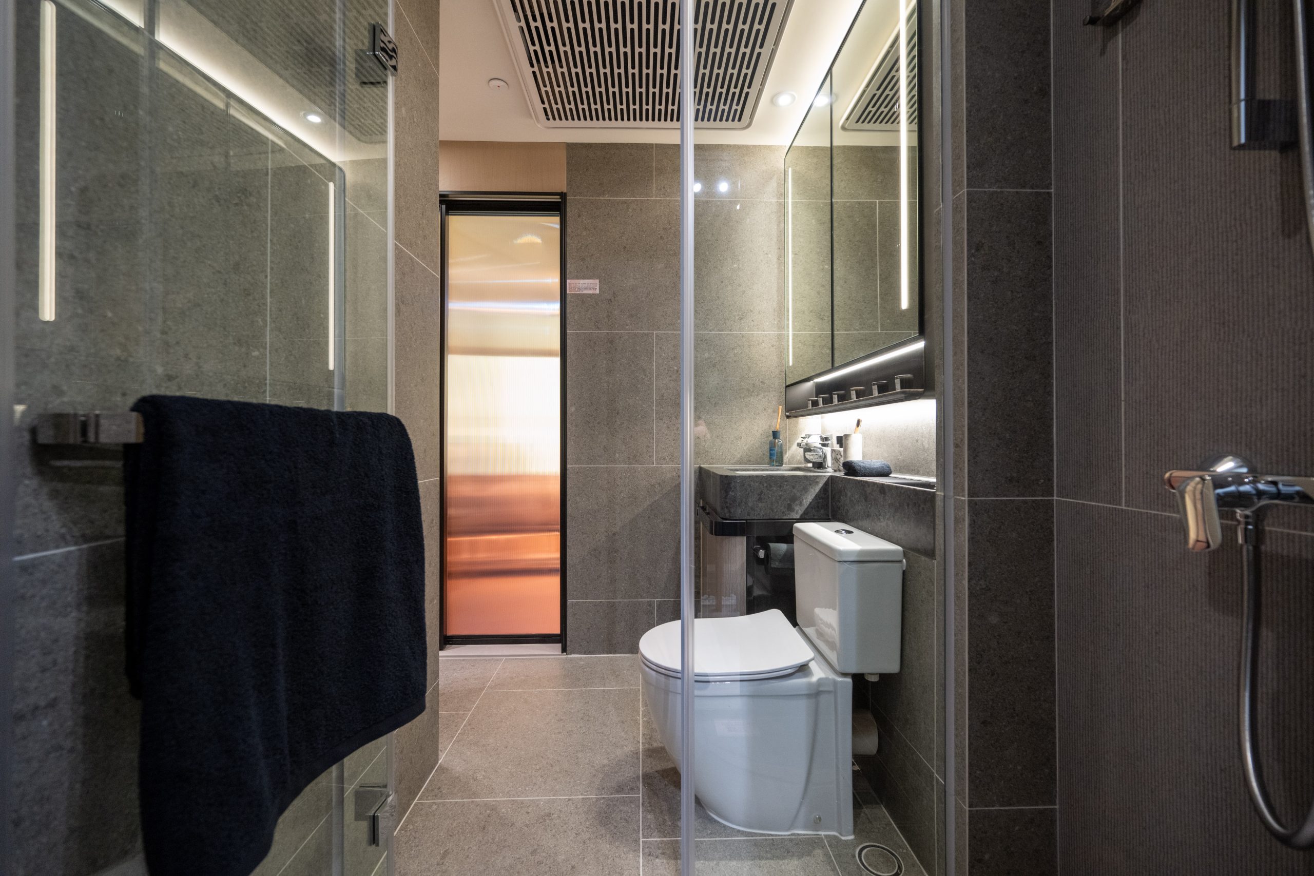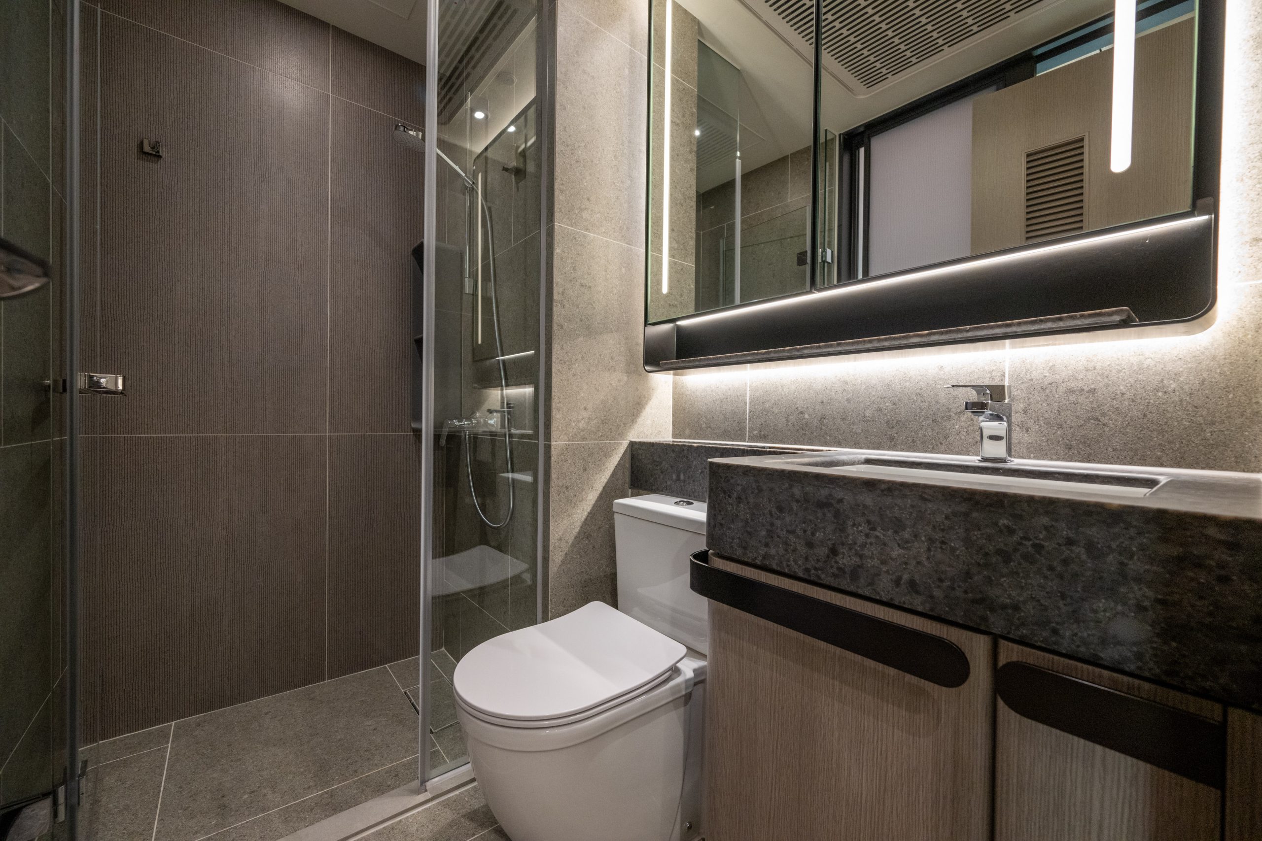 浴室設有玻璃趟門連接主人睡房,讓主人睡房輕鬆變成套房。地板採用色調淡雅的灰色石紋地磚,延伸至牆身,設三件頭浴室配備,包括淋浴間、襯上雲石紋洗手盆及白色坐廁。此外,更配備具有暖風及空氣消毒功能Cold Magic抽濕機、Panasonic抽氣扇及Stiebel Eltron電熱水爐,更細心設計好置物位置,提供洗手盆櫃及鏡櫃。