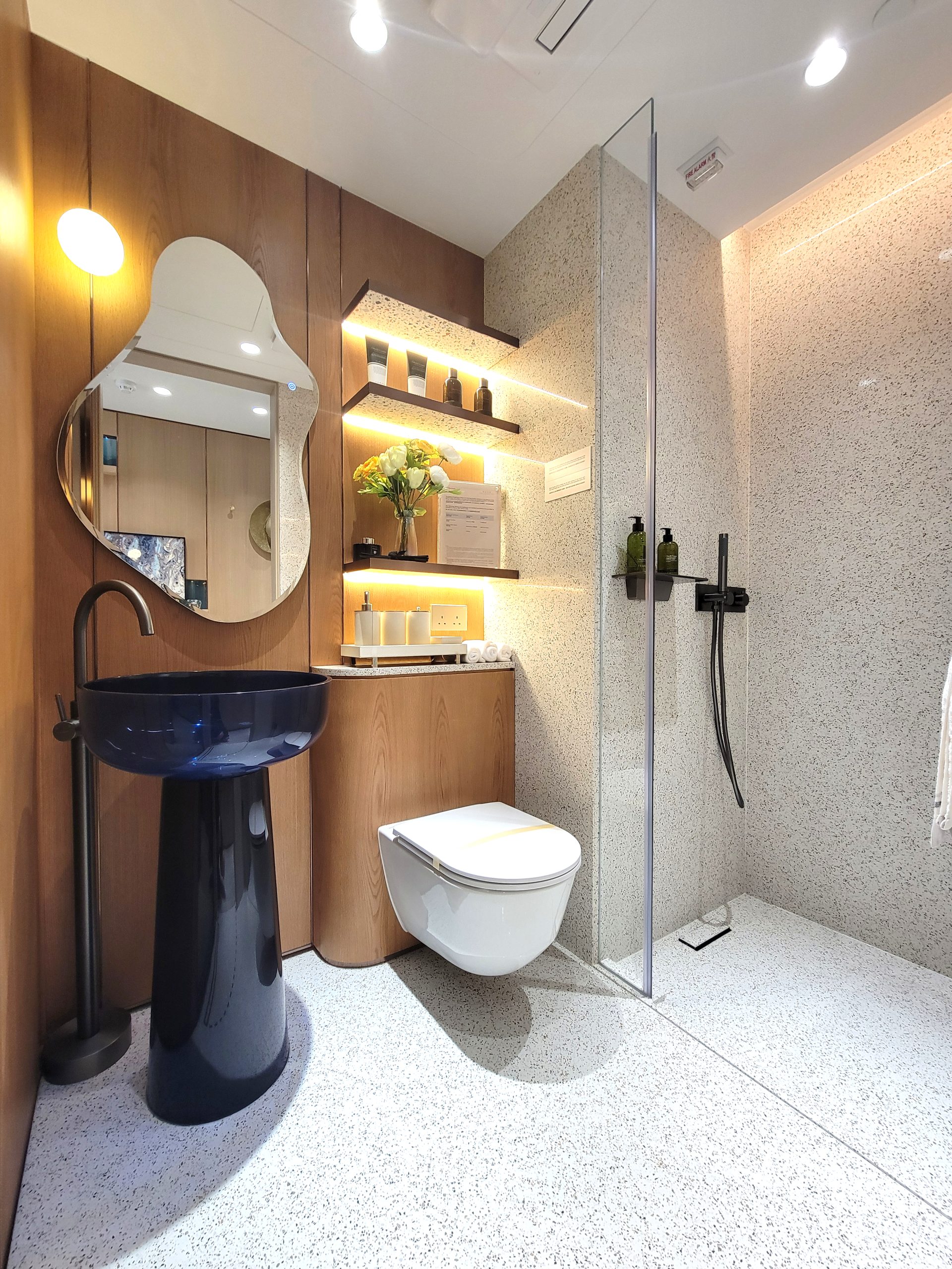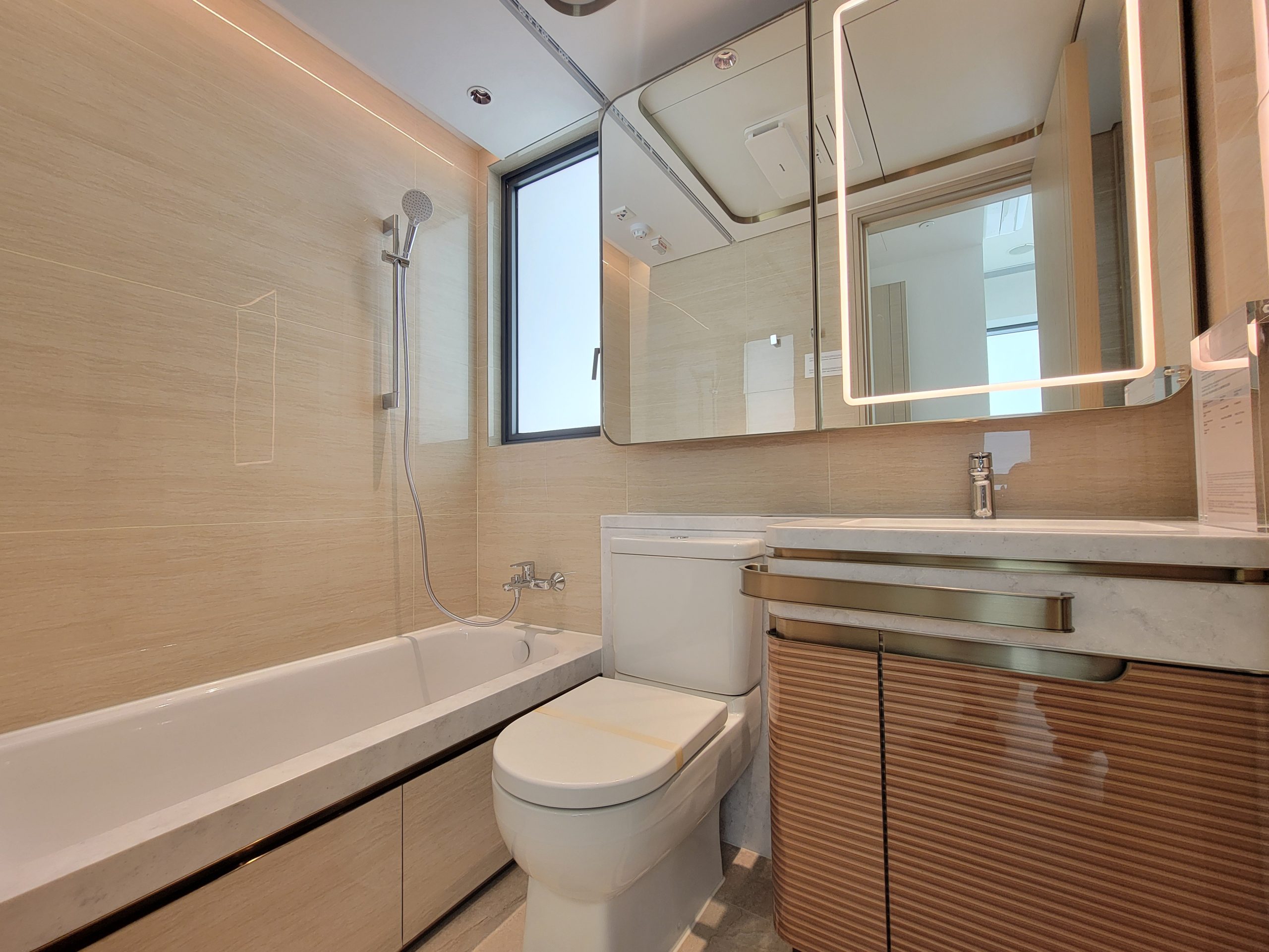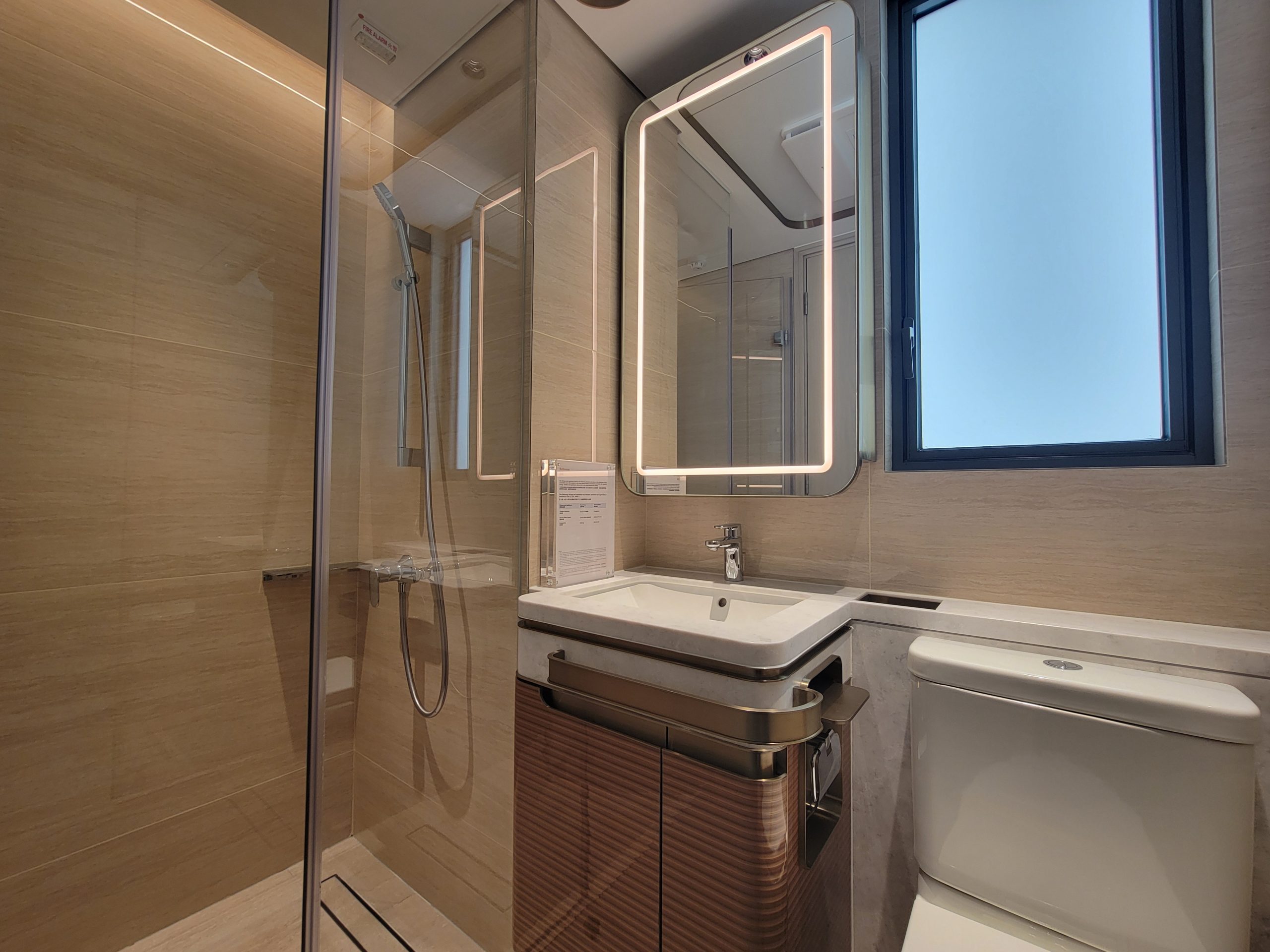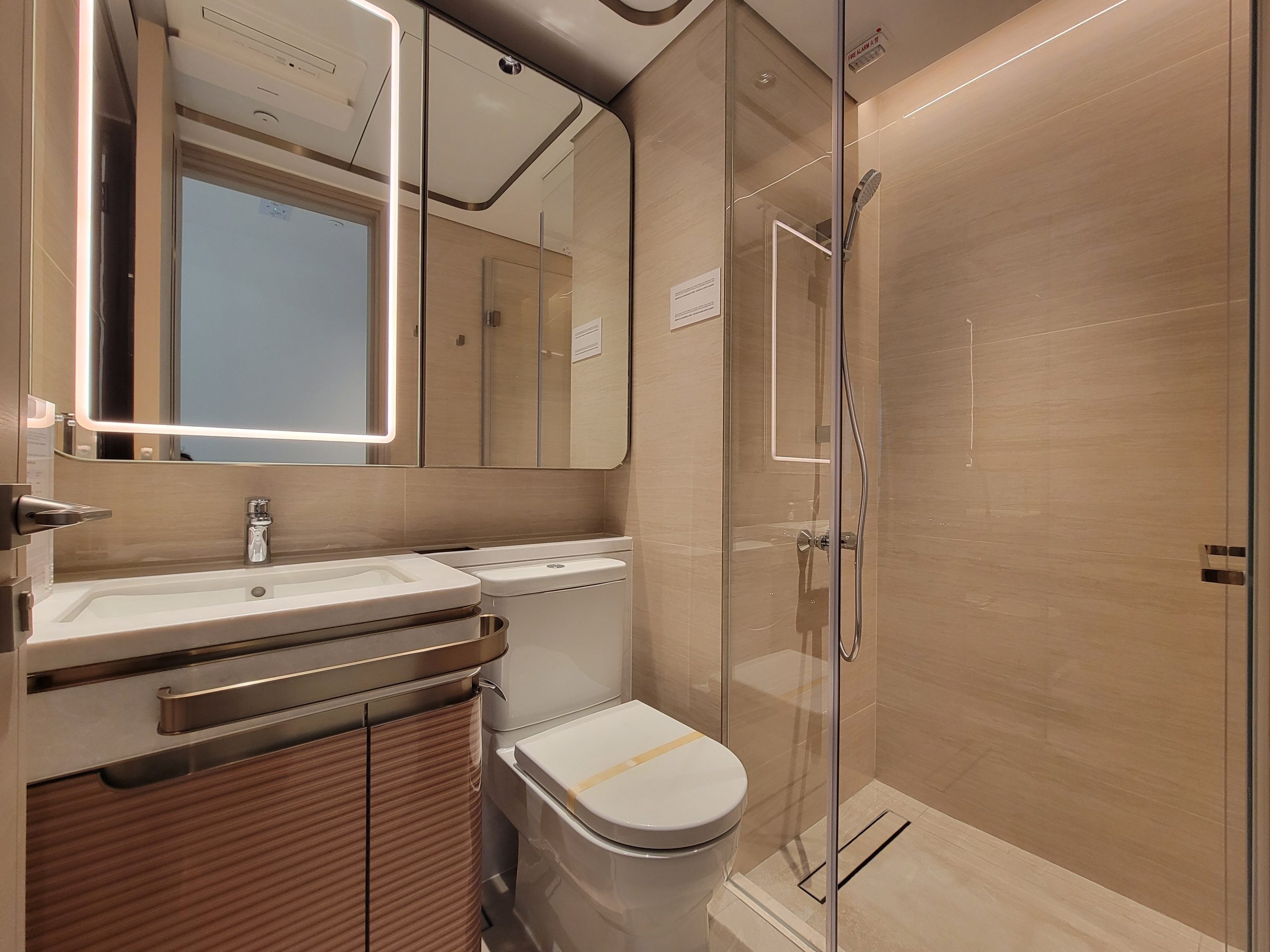 浴室設有玻璃趟門連接主人睡房,讓主人睡房輕鬆變成套房。地板採用色調淡雅的灰色石紋地磚,延伸至牆身,設三件頭浴室配備,包括淋浴間、襯上雲石紋洗手盆及白色坐廁。此外,更配備具有暖風及空氣消毒功能Cold Magic抽濕機、Panasonic抽氣扇及Stiebel Eltron電熱水爐,更細心設計好置物位置,提供洗手盆櫃及鏡櫃。