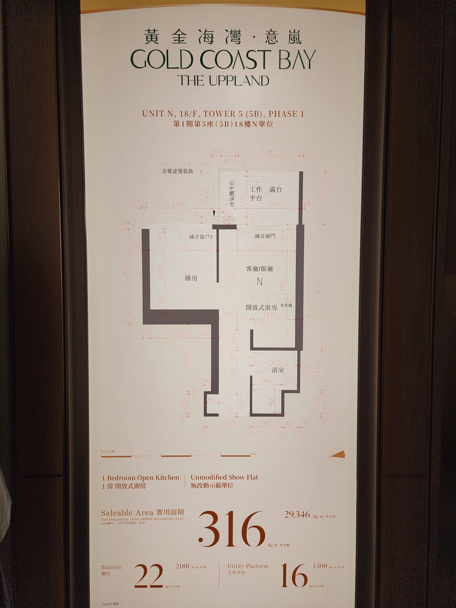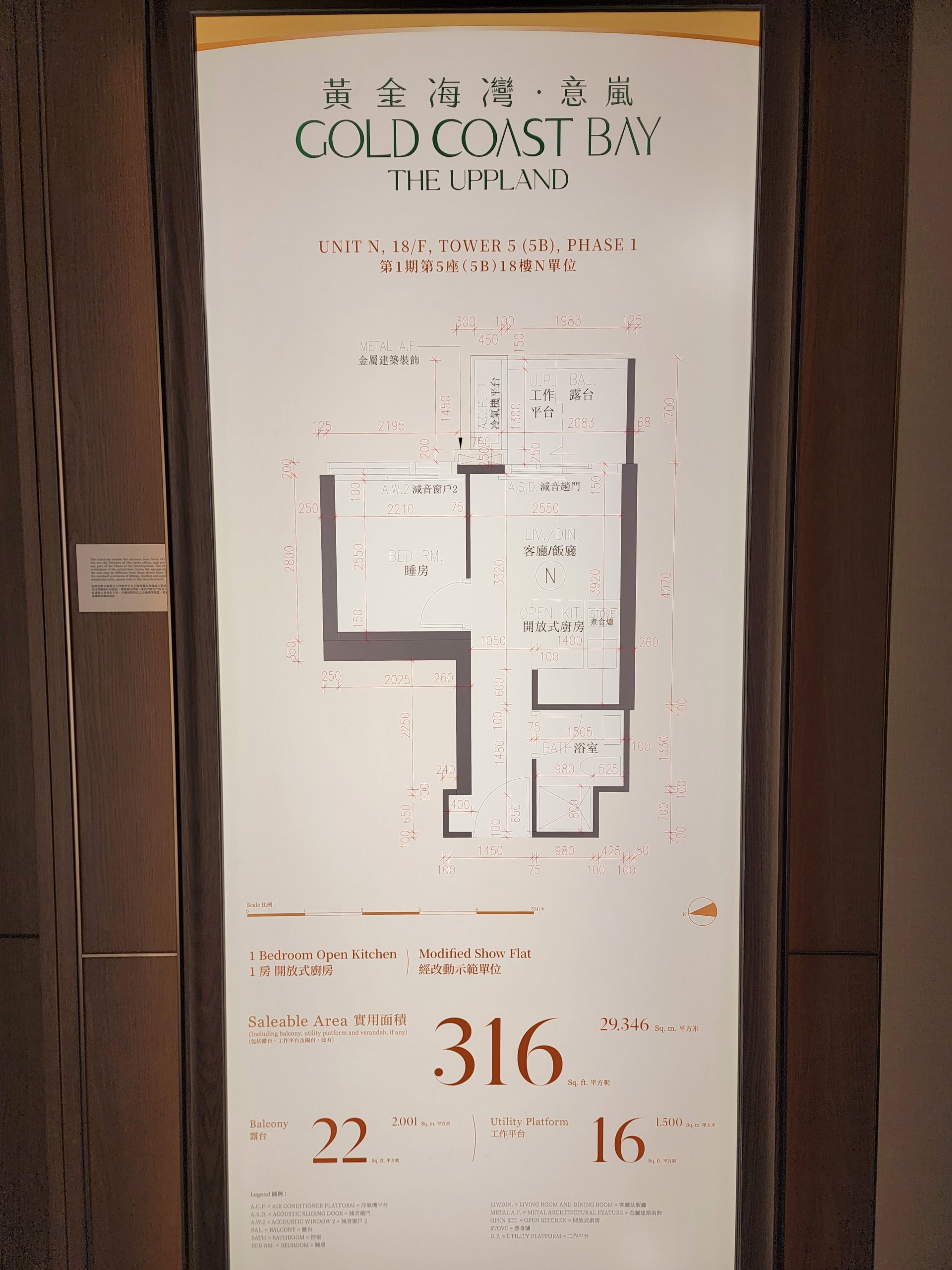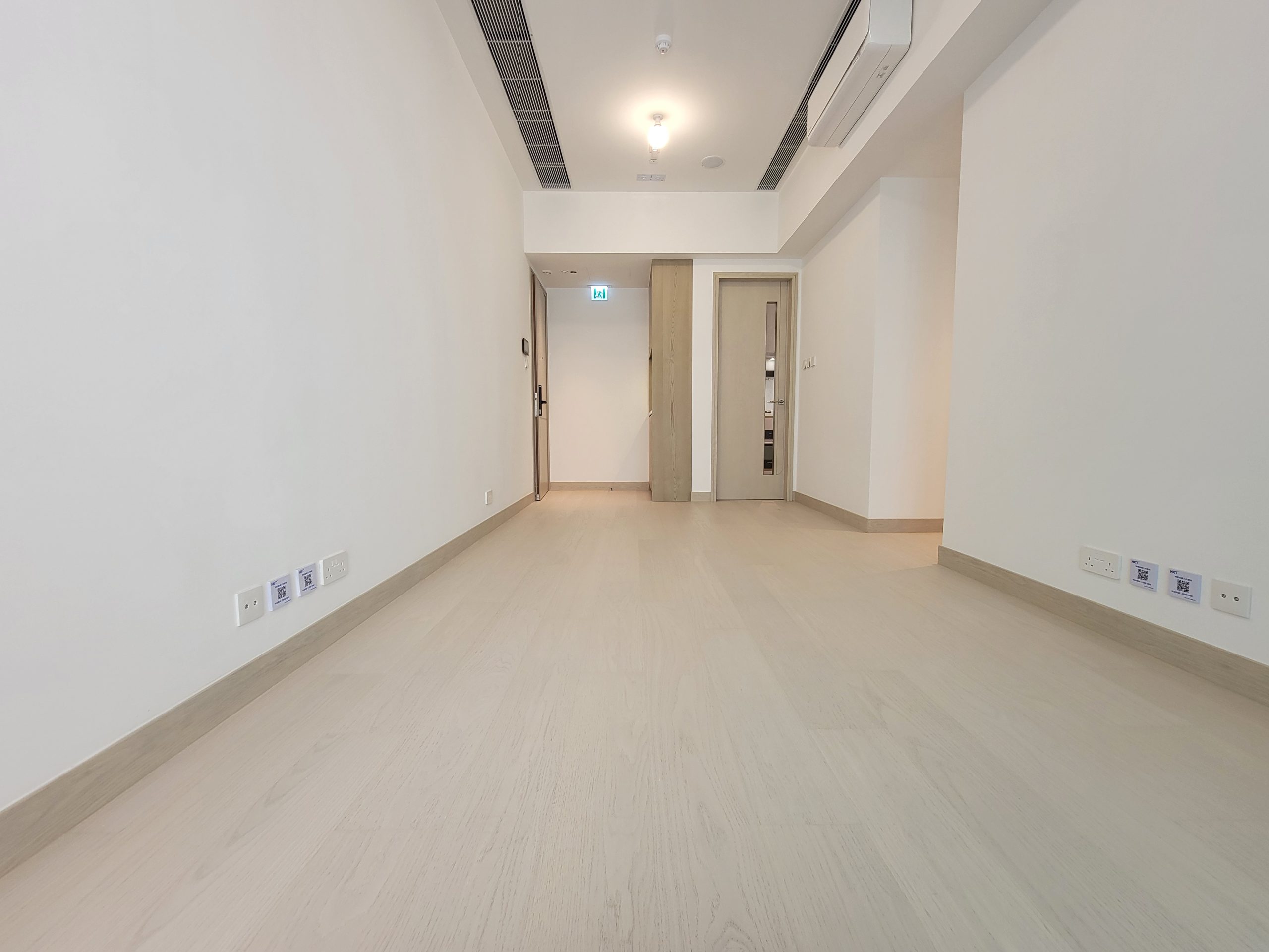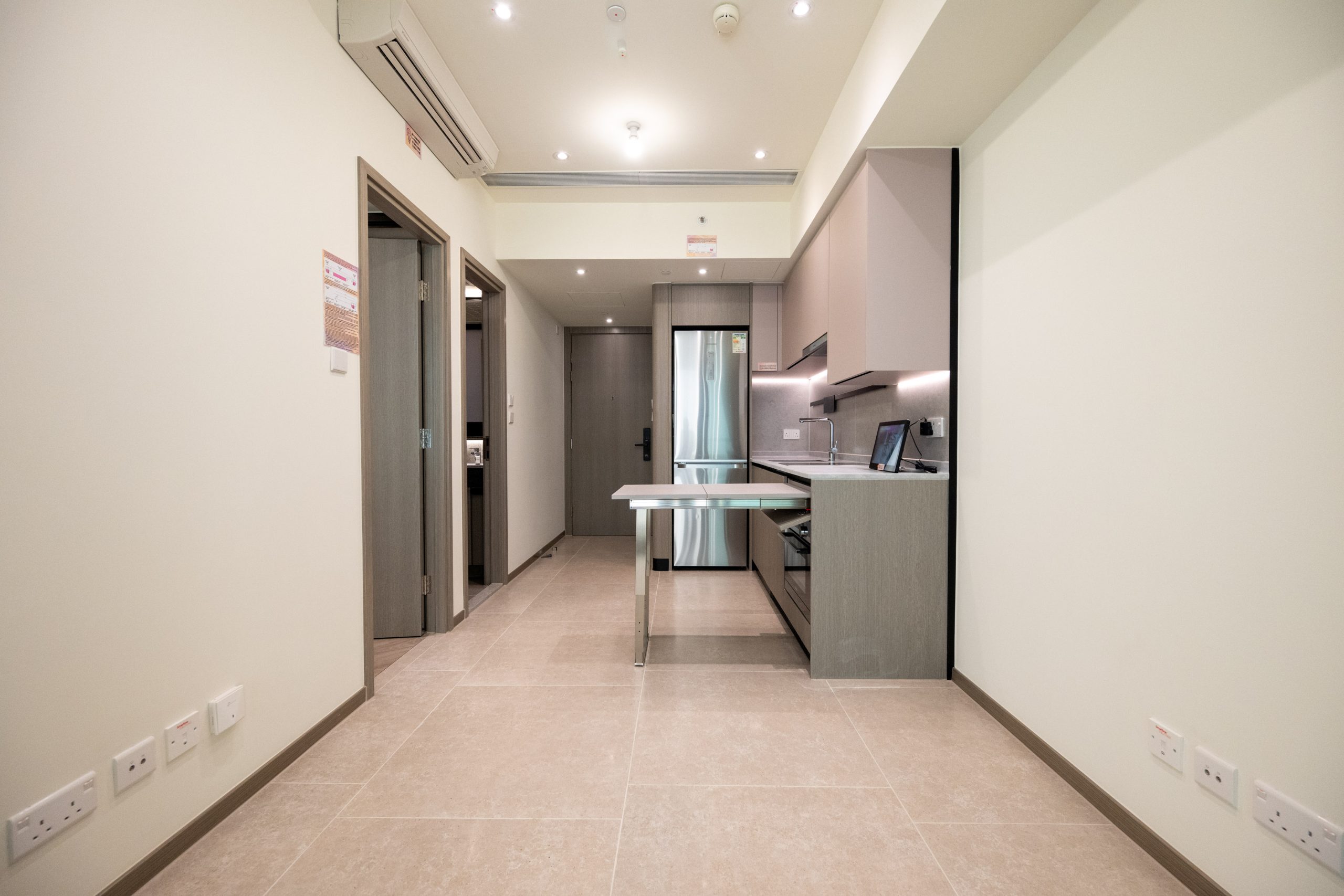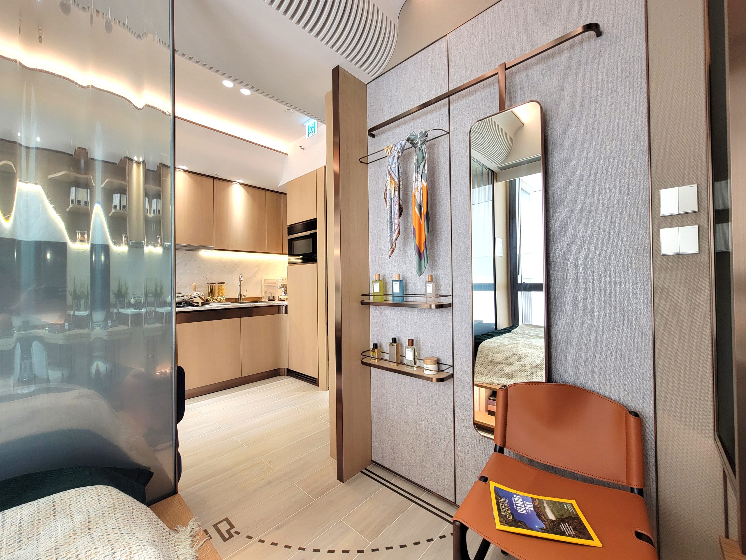 另外,以第1座18樓H室為藍本改造的無改動交樓標準示範單位,兩房間隔,實用面積417方呎,包含一個連接客廳22方呎露台及一個連接主人睡房16方呎工作平台,層與層之間的高度約為2.85米、3.05米及3.15米。單位大門採用防火實心木門設計,配備LOCKLY智能電子門鎖及Comelit視像對講機。大門右側設有一列淺色木紋高身儲物櫃,內置層板,方便住戶放置各式家居物品,櫃身更設有隱藏式磁石告示板。當中設有優雅白色石紋置物檯面空間,可用作展示收藏品,牆上更配有 USB 插頭的電插座。