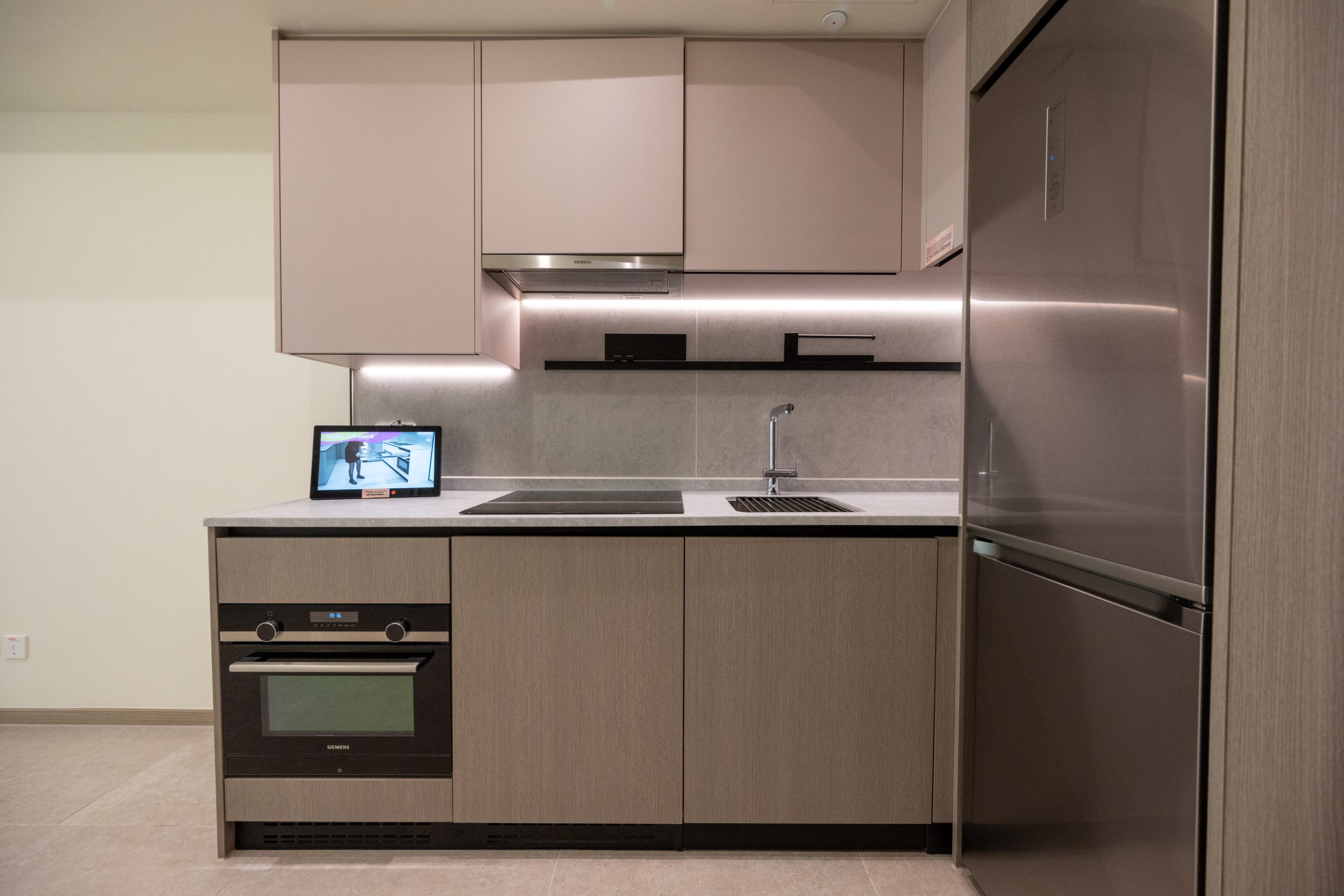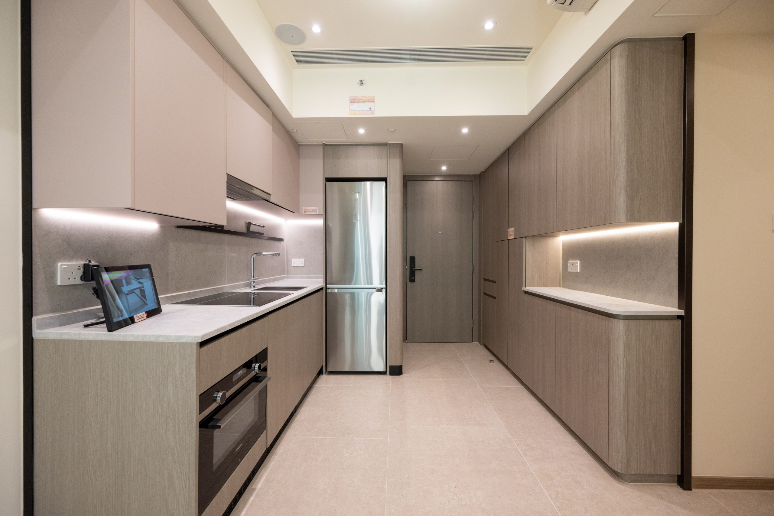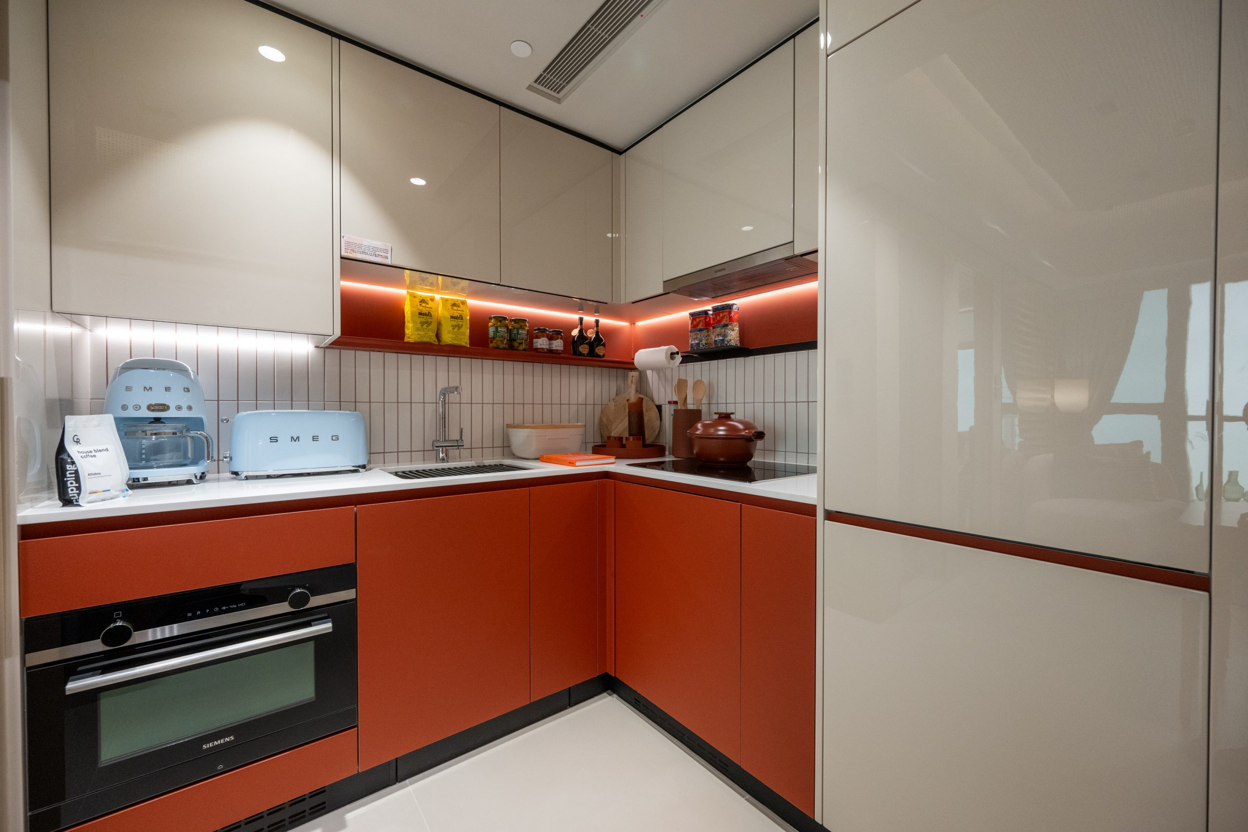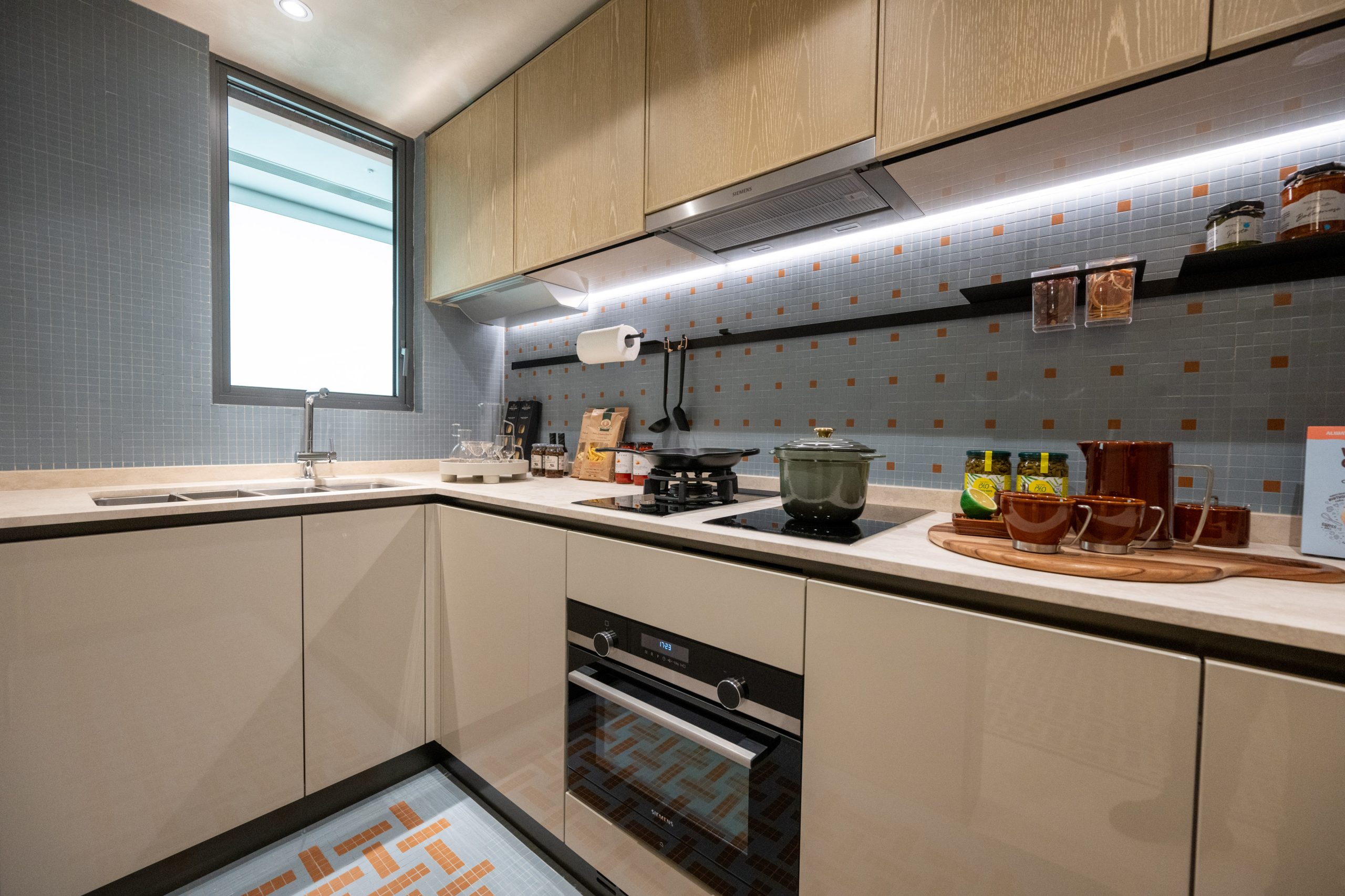 單位採用開放式廚房設計,與客廳營造輕鬆餐廚互動空間。廚房呈L形設計,廚櫃分別以紅白兩色為主調,配以白色人造石工作檯面;洗滌盤配備疏水卷軸,並設有完善的廚房設備,包括一系列Siemens七合一微蒸烤焗爐、雪櫃、抽油煙機及電磁爐、以及Whirlpool洗衣乾衣機。更設置有TP-LINK 路由器以及LifeSmart智慧中心,預設智能家居平台。