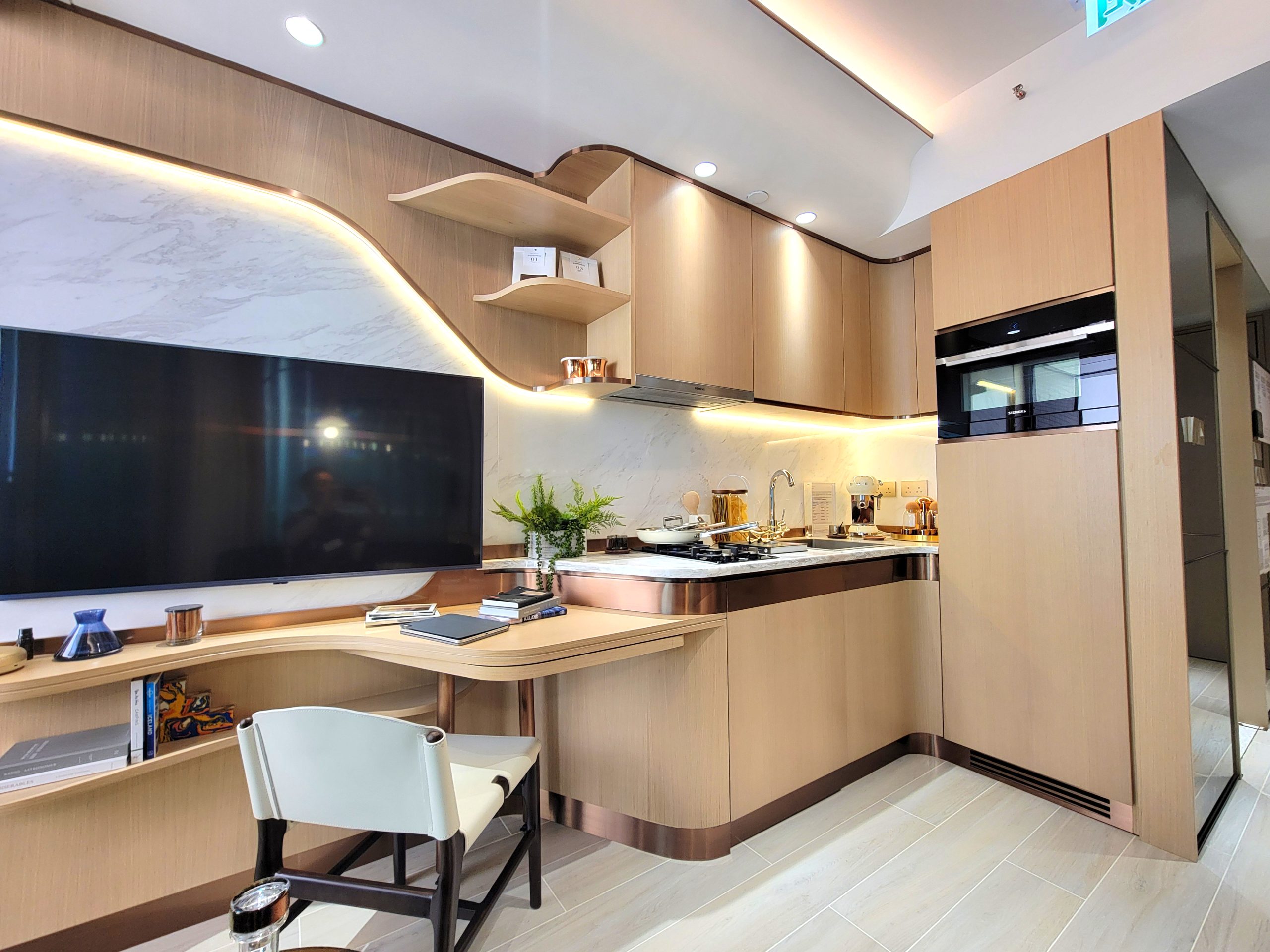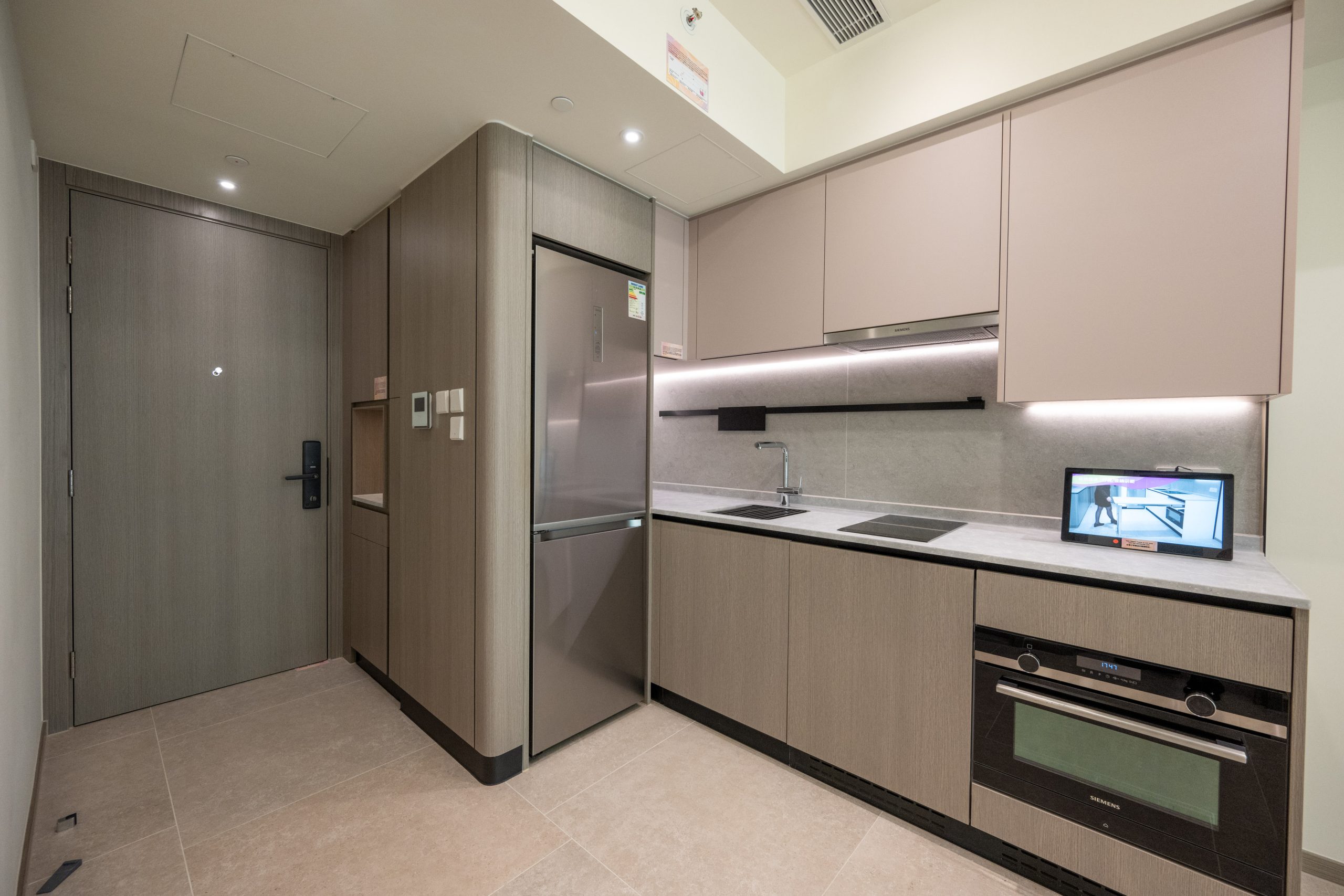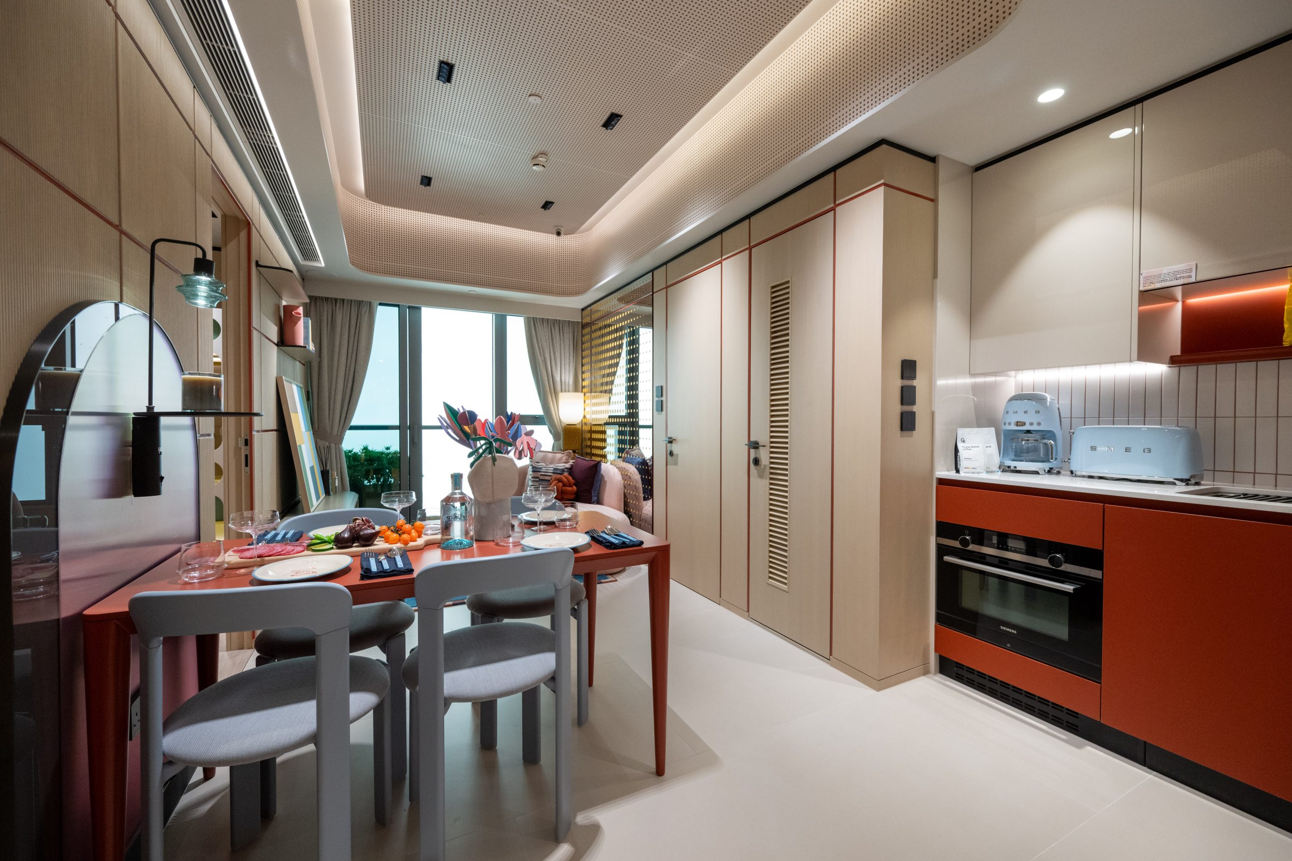 單位採用開放式廚房設計,與客廳營造輕鬆餐廚互動空間。廚房呈L形設計,廚櫃分別以紅白兩色為主調,配以白色人造石工作檯面;洗滌盤配備疏水卷軸,並設有完善的廚房設備,包括一系列Siemens七合一微蒸烤焗爐、雪櫃、抽油煙機及電磁爐、以及Whirlpool洗衣乾衣機。更設置有TP-LINK 路由器以及LifeSmart智慧中心,預設智能家居平台。
