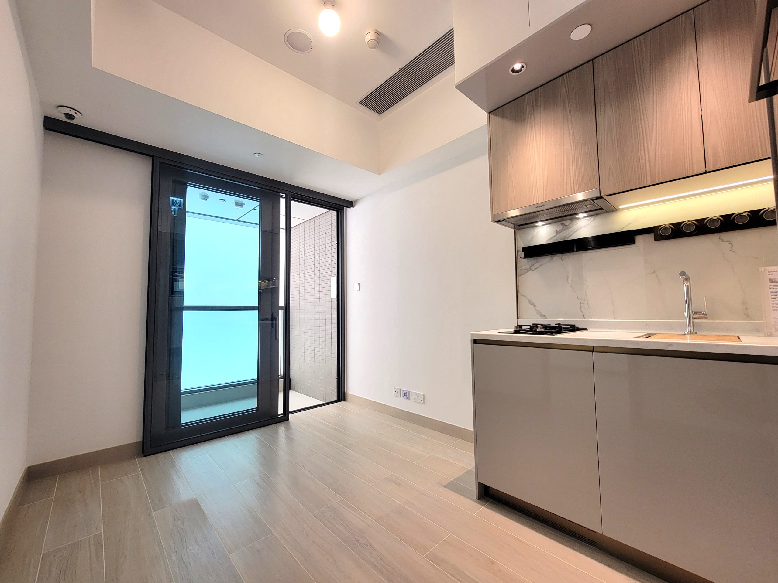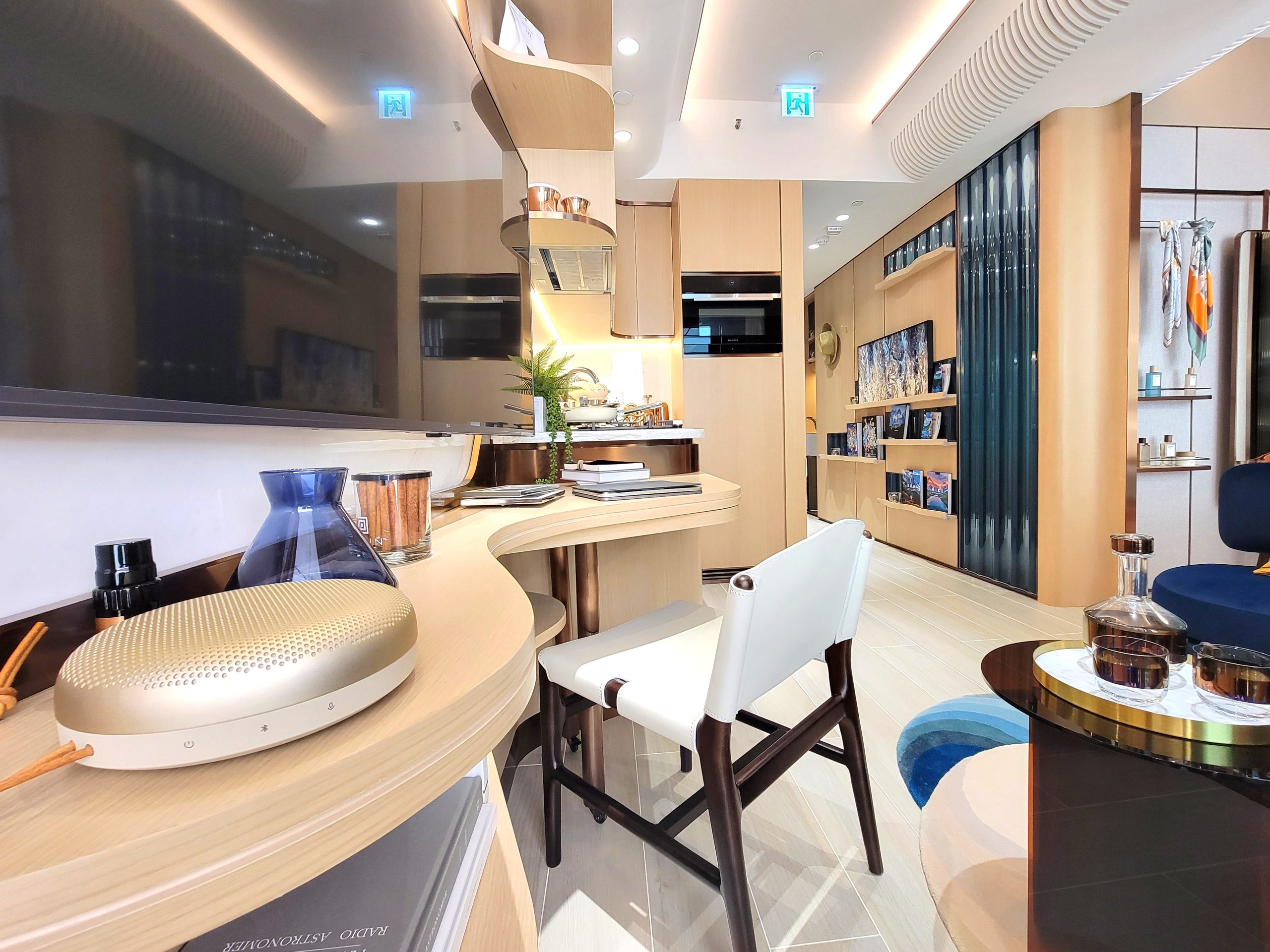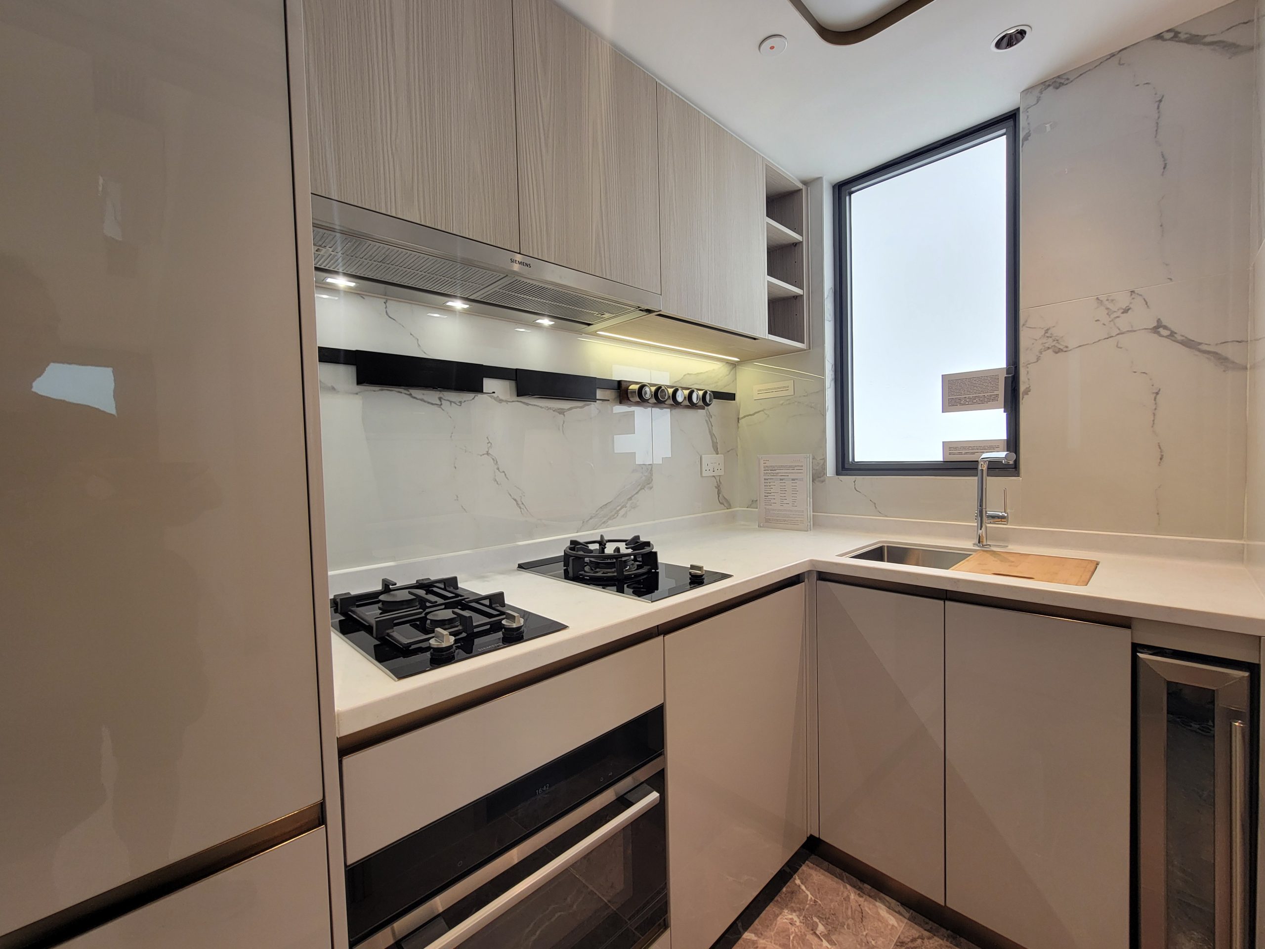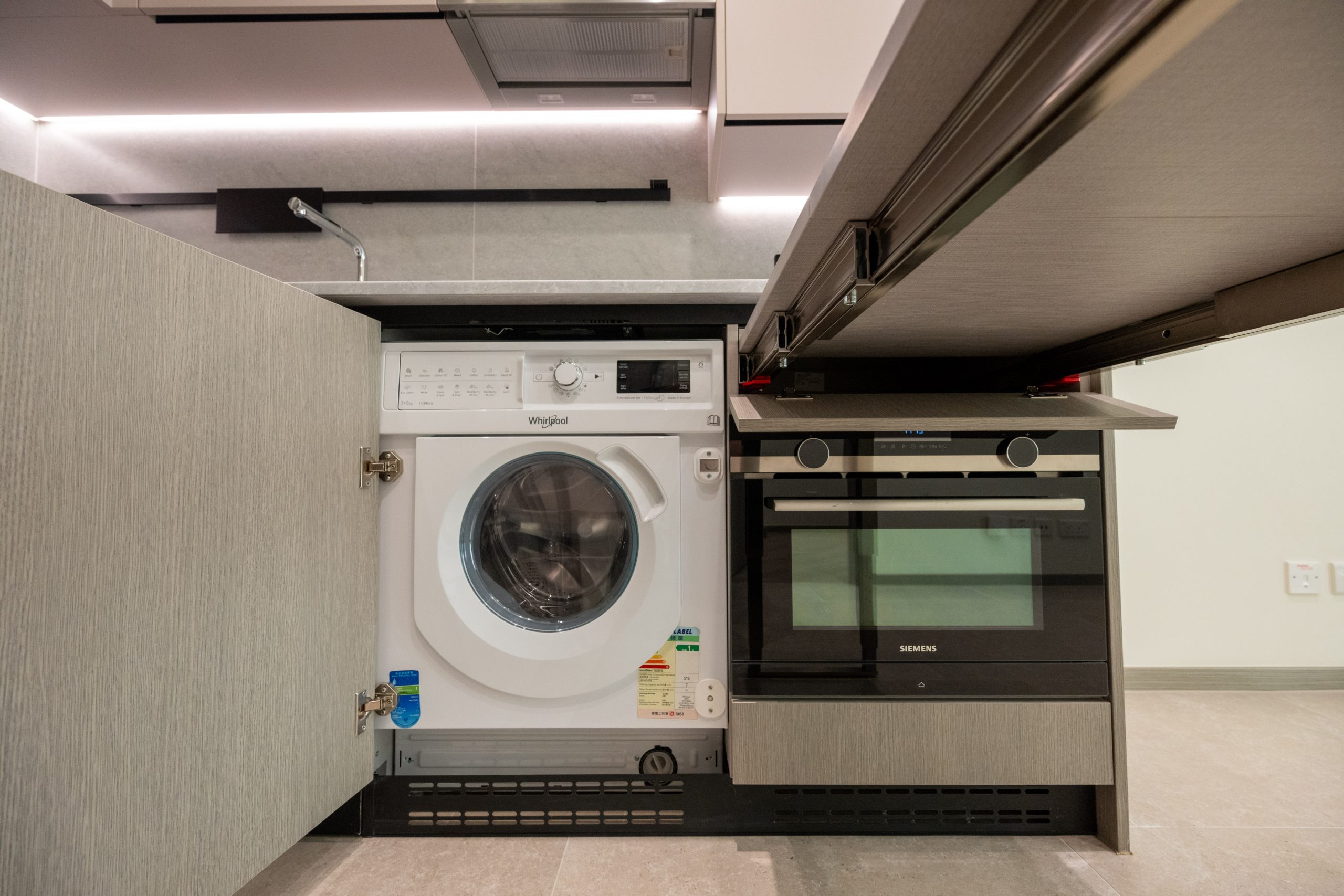 單位採用開放式廚房設計,與客廳營造輕鬆餐廚互動空間。廚房呈L形設計,廚櫃分別以紅白兩色為主調,配以白色人造石工作檯面;洗滌盤配備疏水卷軸,並設有完善的廚房設備,包括一系列Siemens七合一微蒸烤焗爐、雪櫃、抽油煙機及電磁爐、以及Whirlpool洗衣乾衣機。更設置有TP-LINK 路由器以及LifeSmart智慧中心,預設智能家居平台。