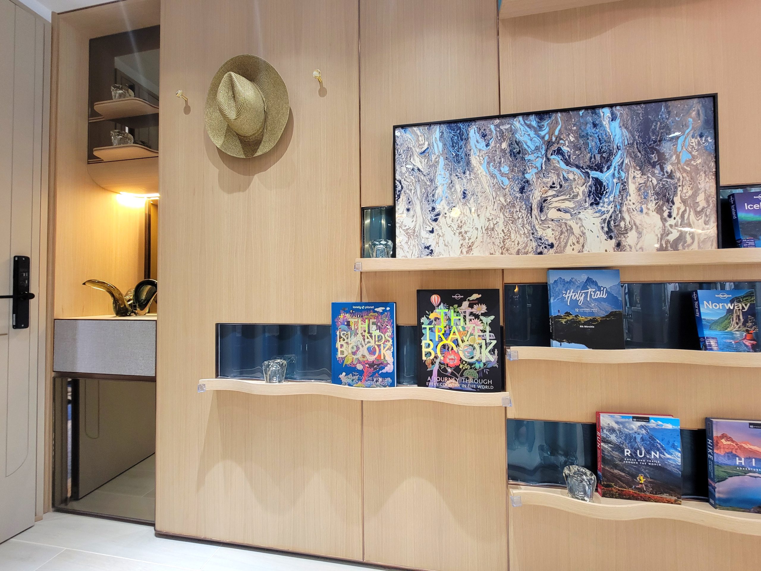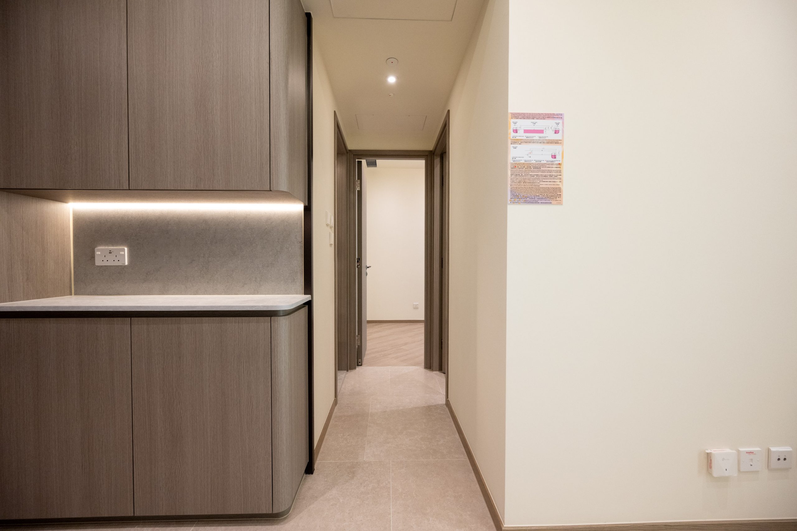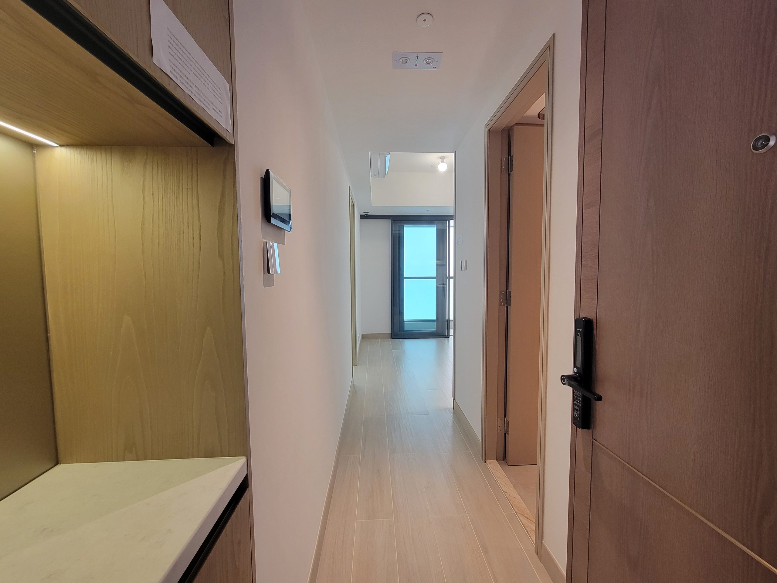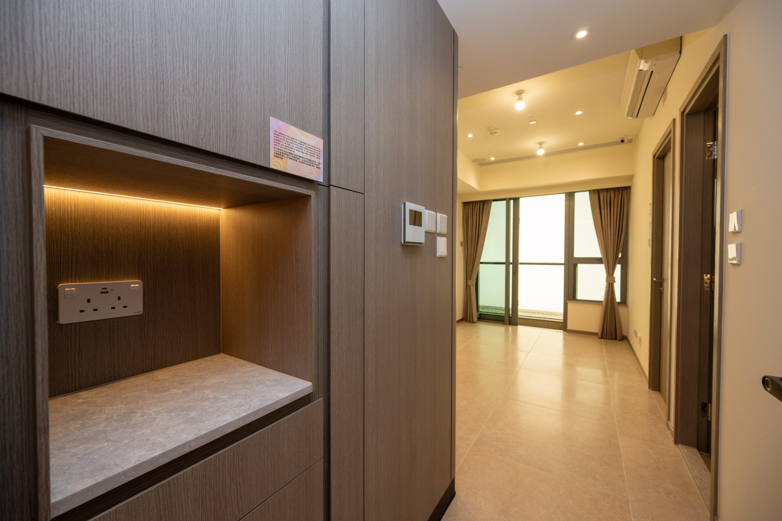 單位內客飯廳及各房間配備複合窗簾,優化採光及遮光效能,單位間隔寬敞實用,大門採用防火實心木門設計,配備 LOCKLY 智能電子門鎖,設有多種開鎖方式。大門側旁設有高身儲物櫃,附設多個層板,提供收納空間,住戶可放置鞋履及各式家居物品,更設有充電插座及置物空間,大門另一側配備了嵌入式Siemens雪櫃。