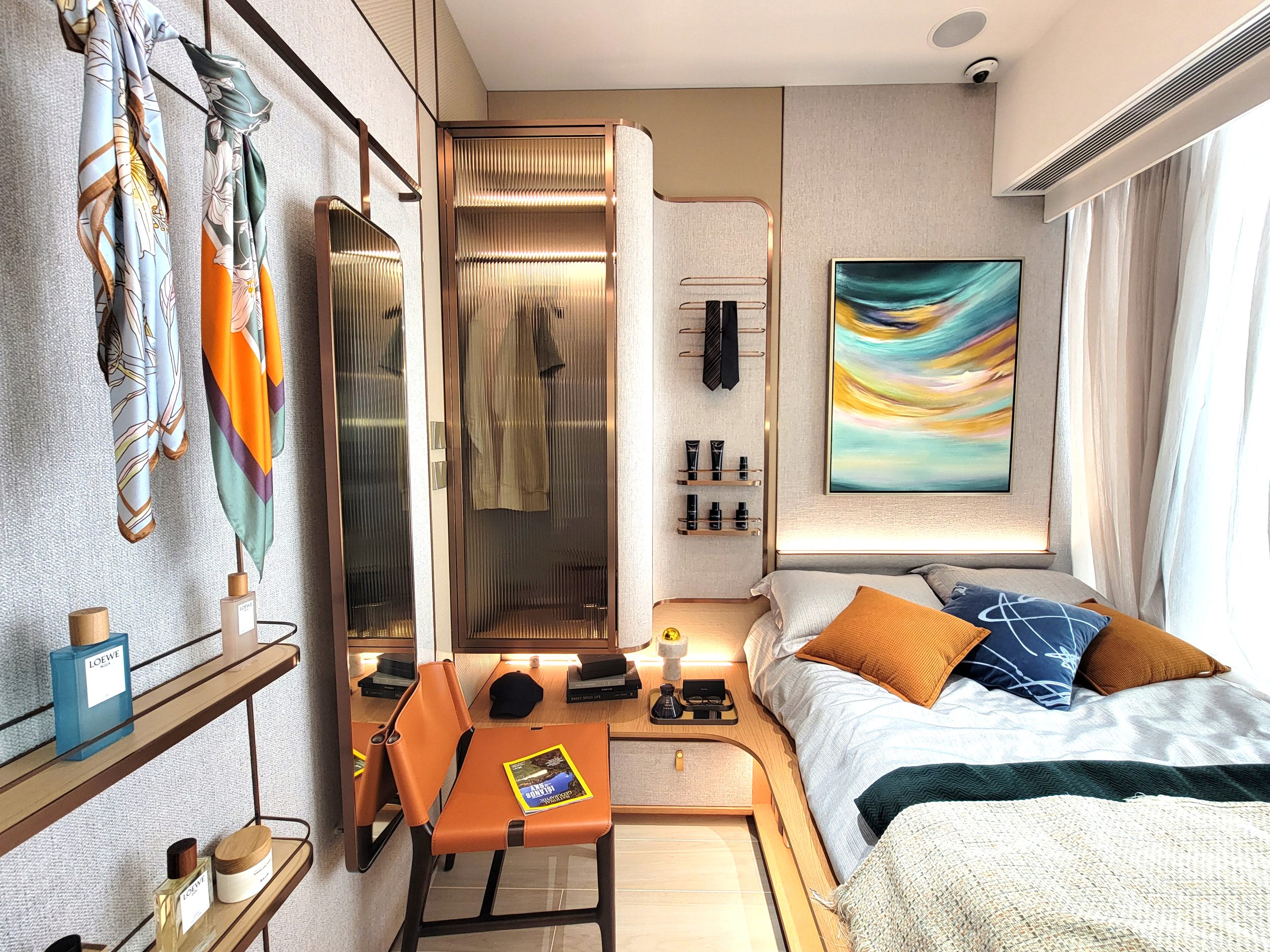 單位兩間房間配備窗簾,優化採光及遮光效能,打造舒適休息空間。睡房地台以木紋防潮地板鋪砌,洋溢溫暖明亮氛圍。睡房1設計方正,室內空間靈活實用,易於建造安逸閒適空間。主人睡房貼心設計與工作平台相連,迎納自然光線,加強睡房空間感,打造舒適優越的休憩環境。房內更預留有衣櫃位置,牆上更配有USB插頭的電插座。浴室配備三件頭浴室配備,包括淋浴間、洗手盆及坐廁,設備齊全,更裝設備有暖風及殺菌功能的抽濕機。浴室置物空間充裕,設有洗手盆櫃及鏡櫃,供住戶放置洗滌用品,更配備酒店式可伸縮晾衣繩。