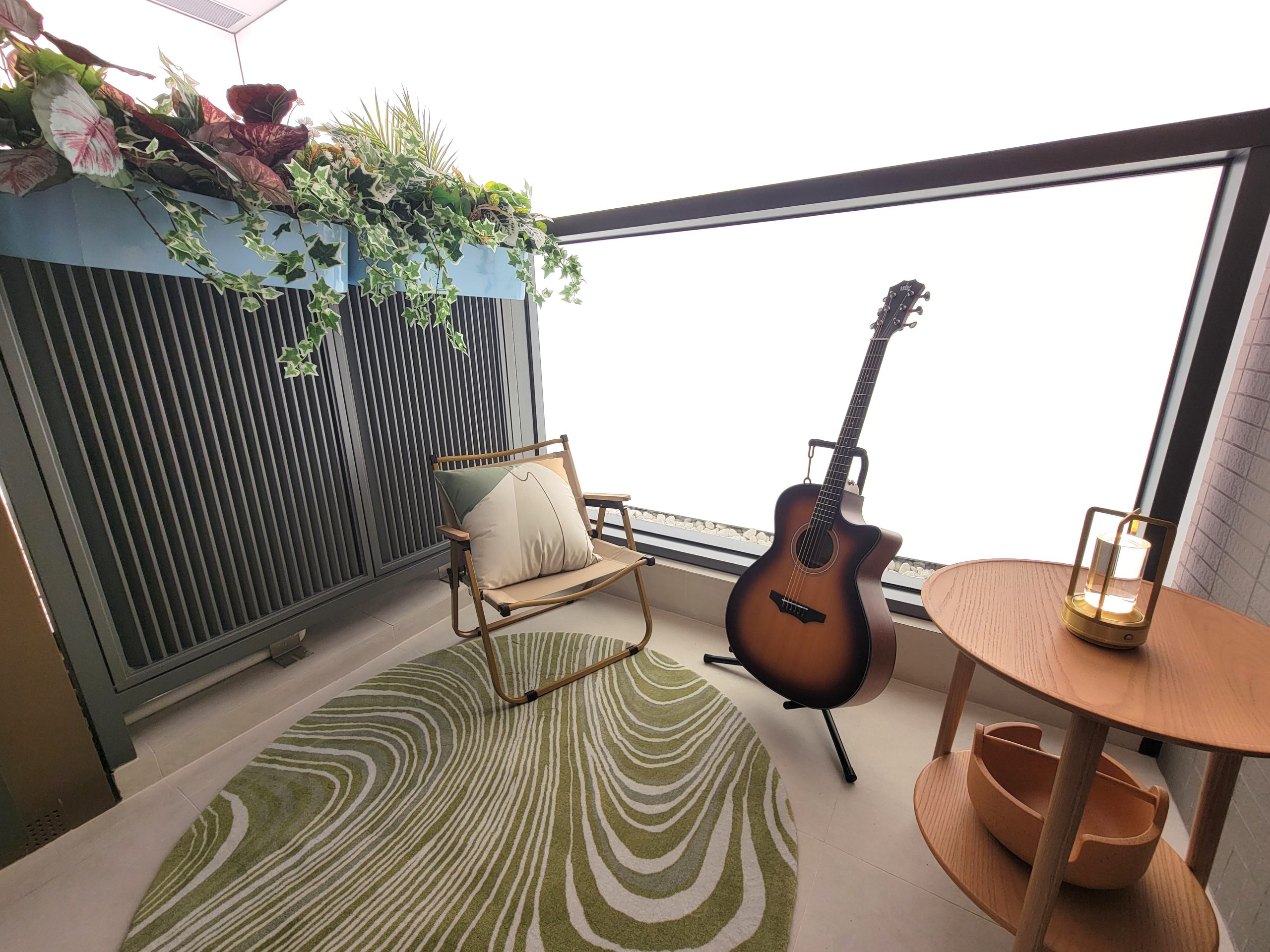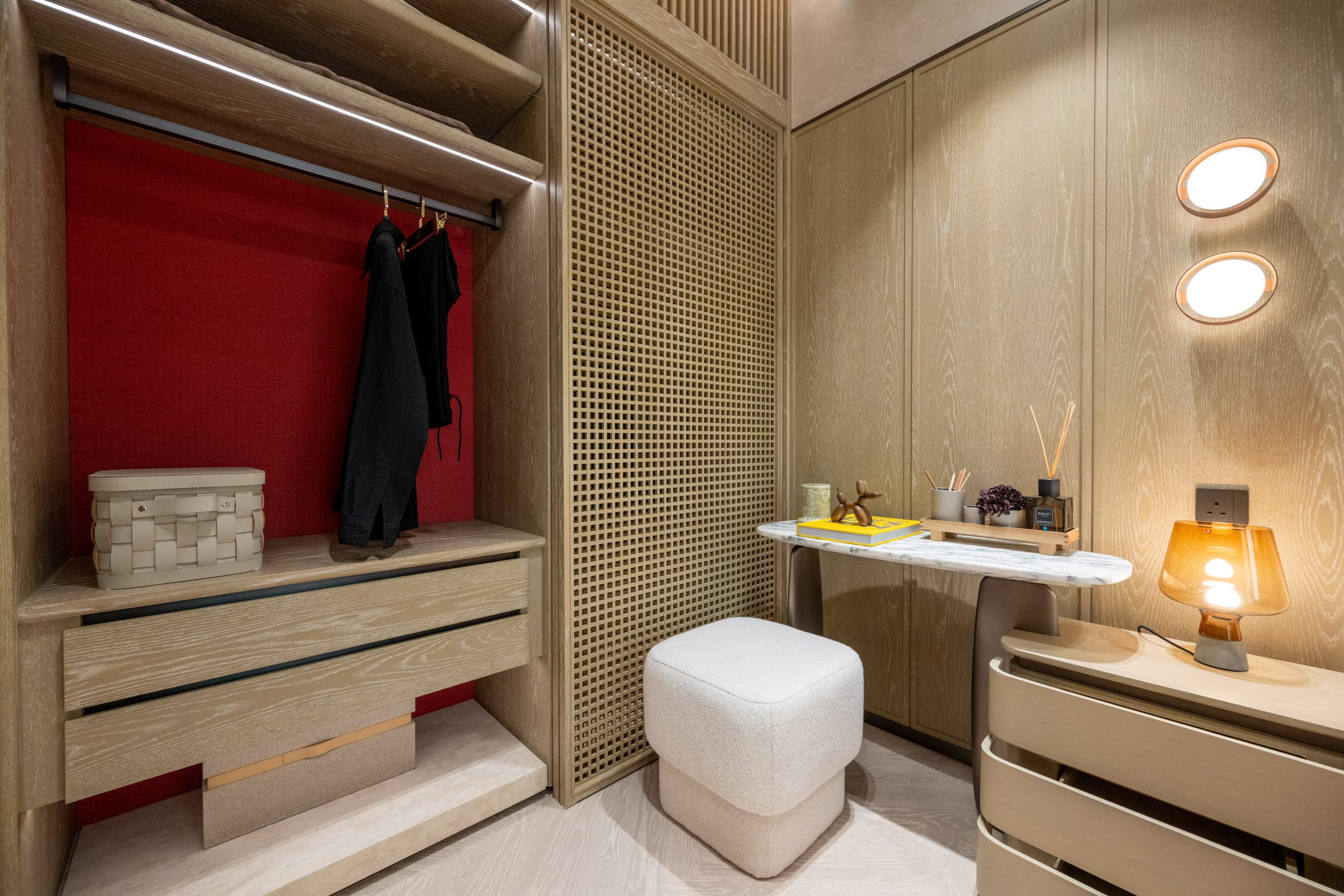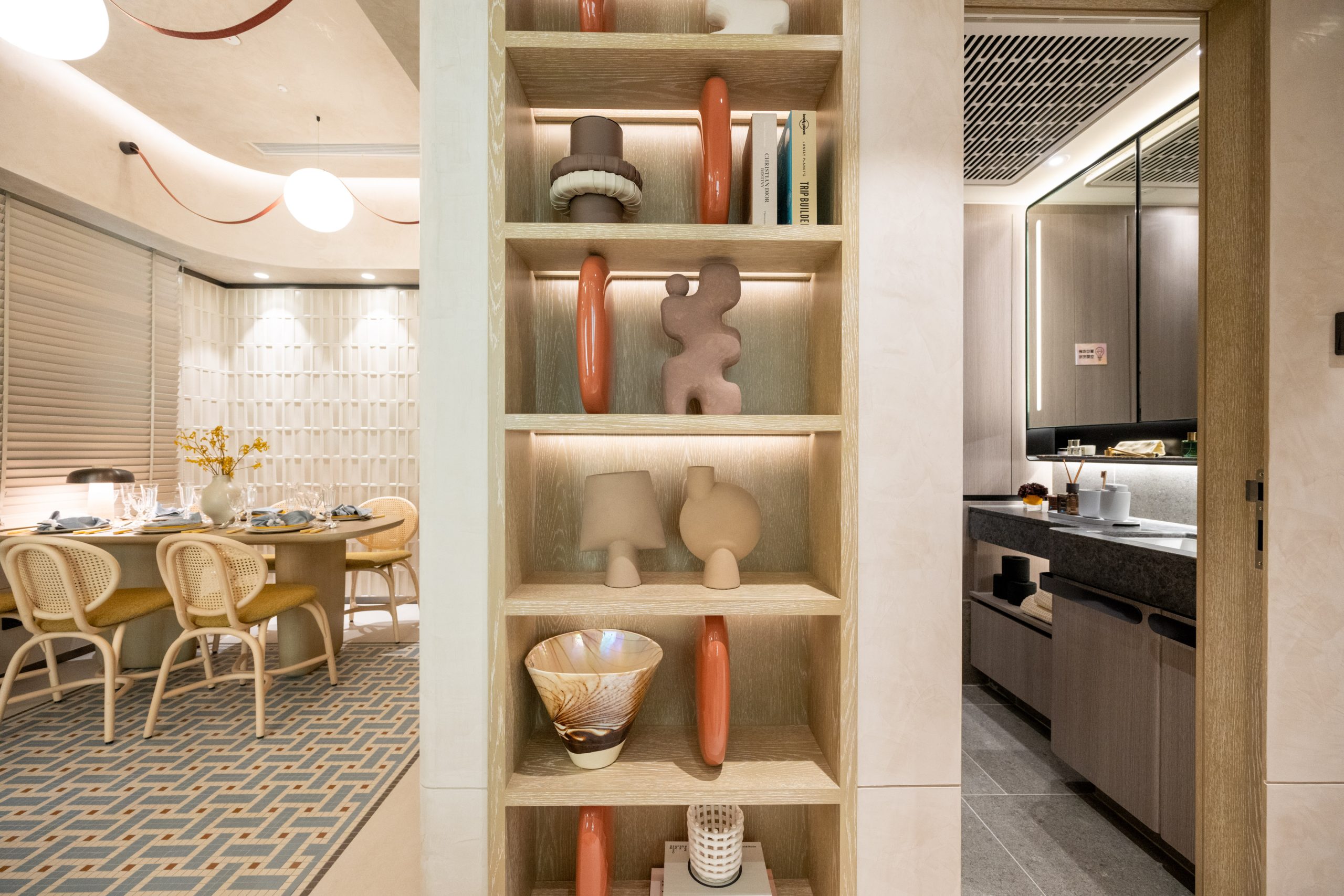 單位以「北歐復古磚紅」為主題,全屋以原木裝飾為主調,再配以優雅復古的磚紅色作點綴,襯以木質家具及具藝術感的配飾擺設。客飯廳呈長方形設計,長約5.18米,寬約2.45米,方客廳以樸實優雅的原木色風琴形狀方格配搭磚紅色包邊牆身,營造溫暖舒適感覺。面積偌大的客飯廳連接戶外露台,採用落地大玻璃趟門設計廣納自然光線,配上高樓底設計,大大提高客飯廳採光度之餘,延伸室內空間。