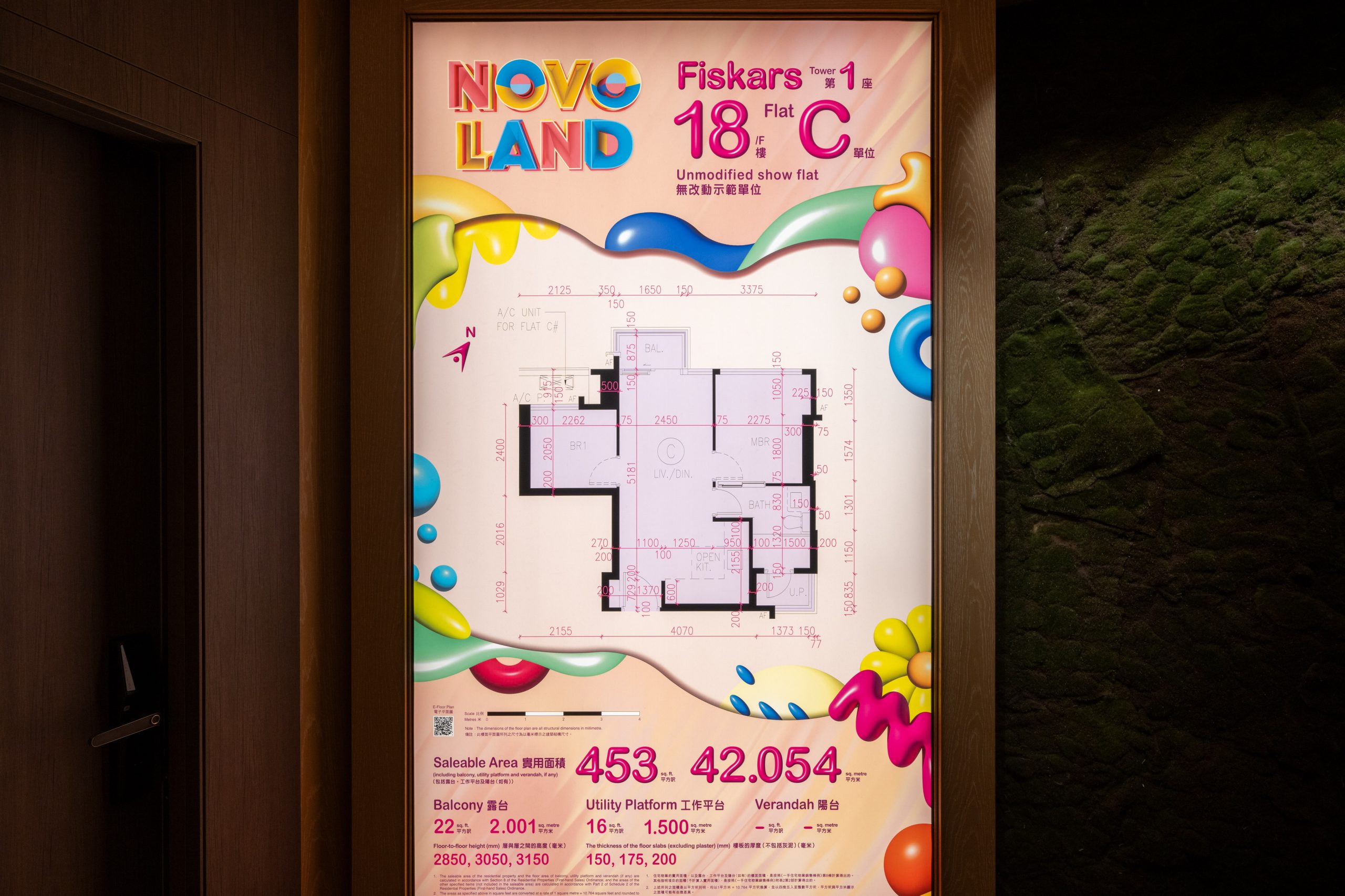 新界區焦點新盤、新鴻基地產屯門「NOVO LAND」第3B期提供4個示範單位,涵蓋一房至三房間隔,實用面積介乎303至697方呎。兩房單位包括以第1座18樓C室為藍本的連裝修示範單位,實用面積453方呎,包含一個連接客廳22方呎露台及一個連接浴室16方呎工作平台,層與層之間的高度約為2.85米、3.05米米及3.15米,空間感十足,適合小型家庭入住。