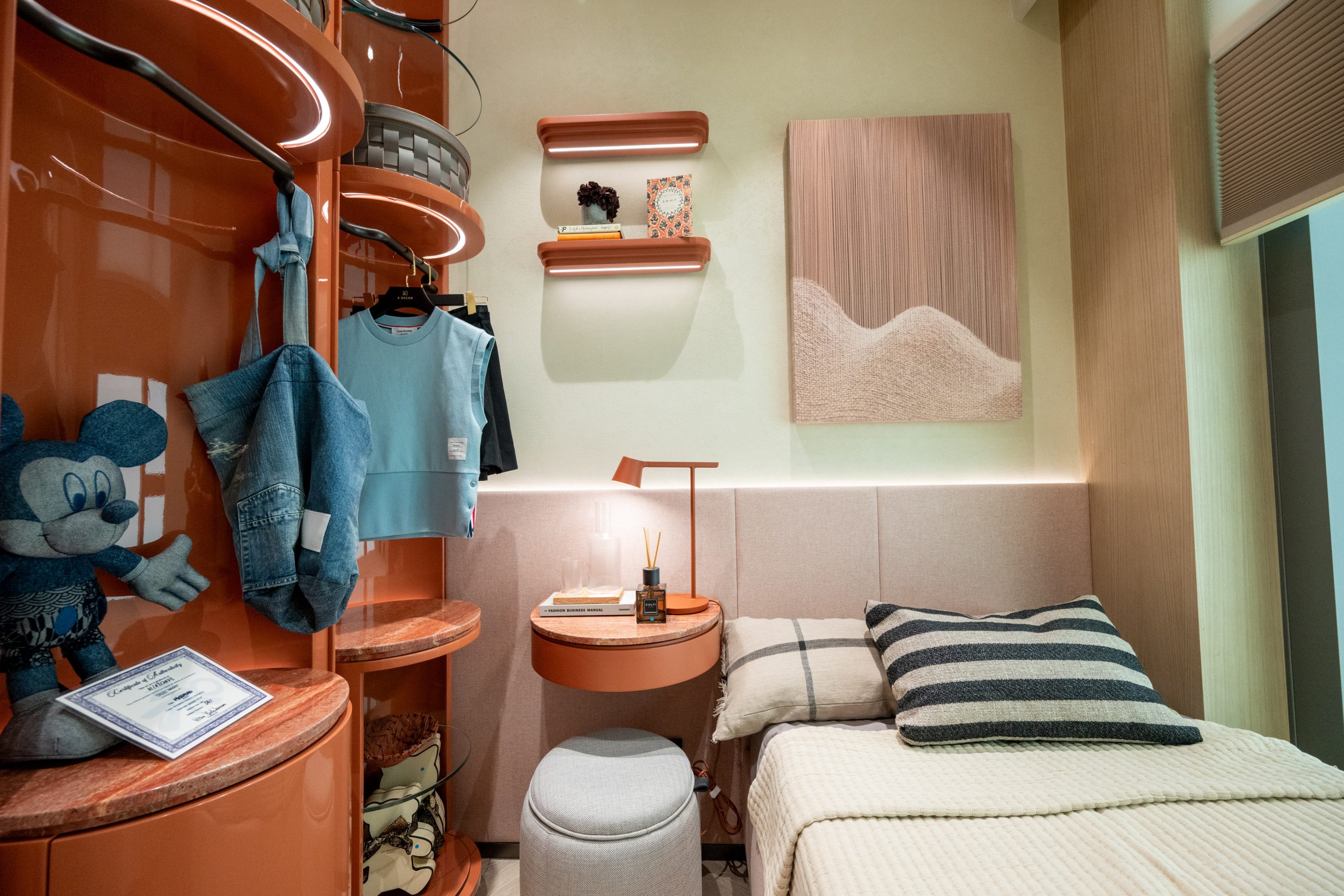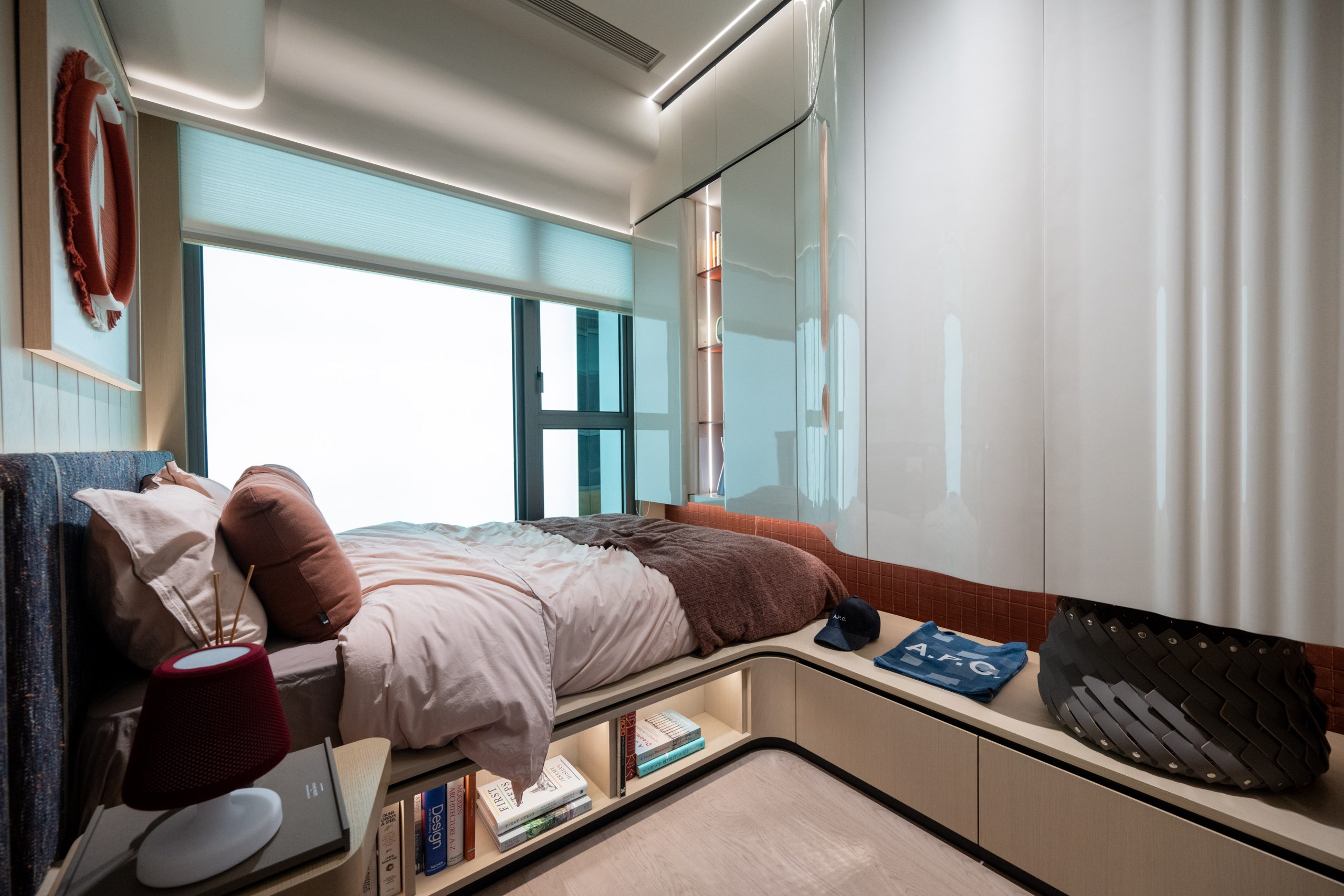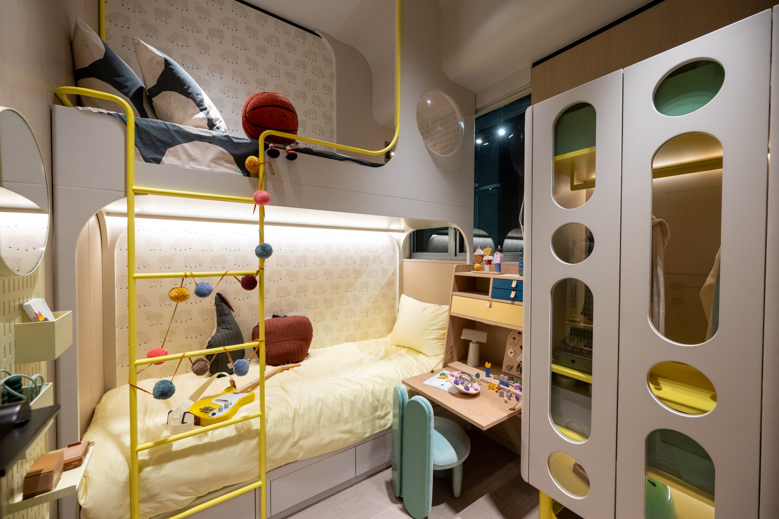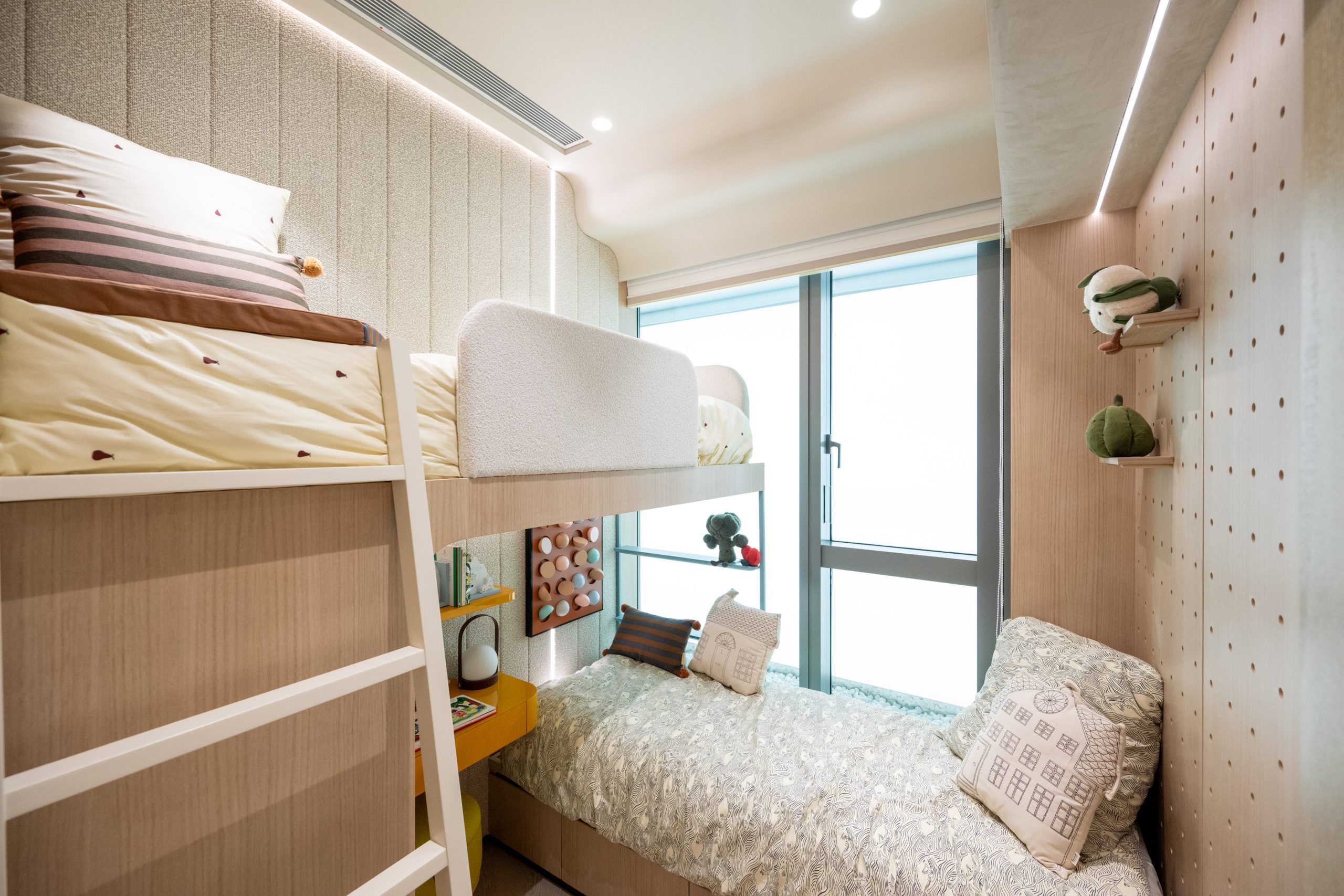 單位客飯廳、主人睡房及睡房1均享同一座向景觀。設計師精心打造睡房1為童趣滿分的兒童房。地面以複合木地板鋪砌,牆上的洞洞板提供置物空間,層架可擺放玩具積木,靠牆之雙層床床架以白色為主色調,襯以鮮黃色梯架,配合白色綿羊圖案牆紙。上層床頭以太空艙意念設計,擺放籃球玩偶抱枕,配以灰色波點的圖案被單,下層床頭擺放多個水果造型抱枕,綴以淺黃色被單。旁邊擺放原木矮書櫃及矮身兒童椅,書櫃設置收納式折疊書檯,擺放各式色彩繽紛的積木,讀書時,住戶拉出木質書桌,放置椅子後,即變成學習區,書櫃旁擺放白色造型衣櫃。