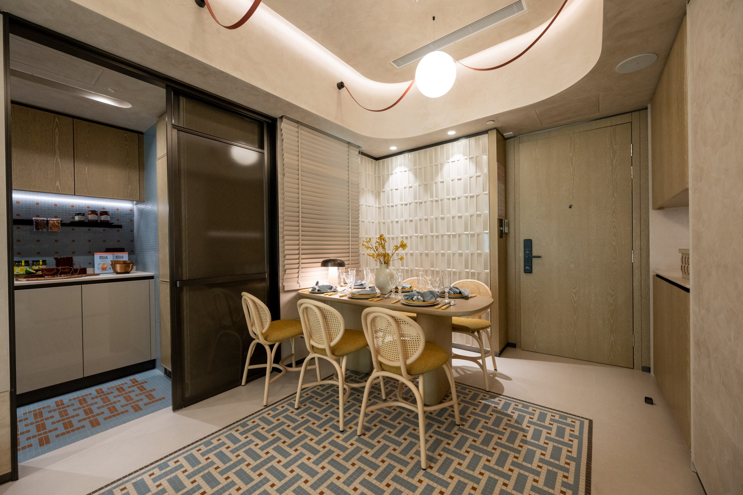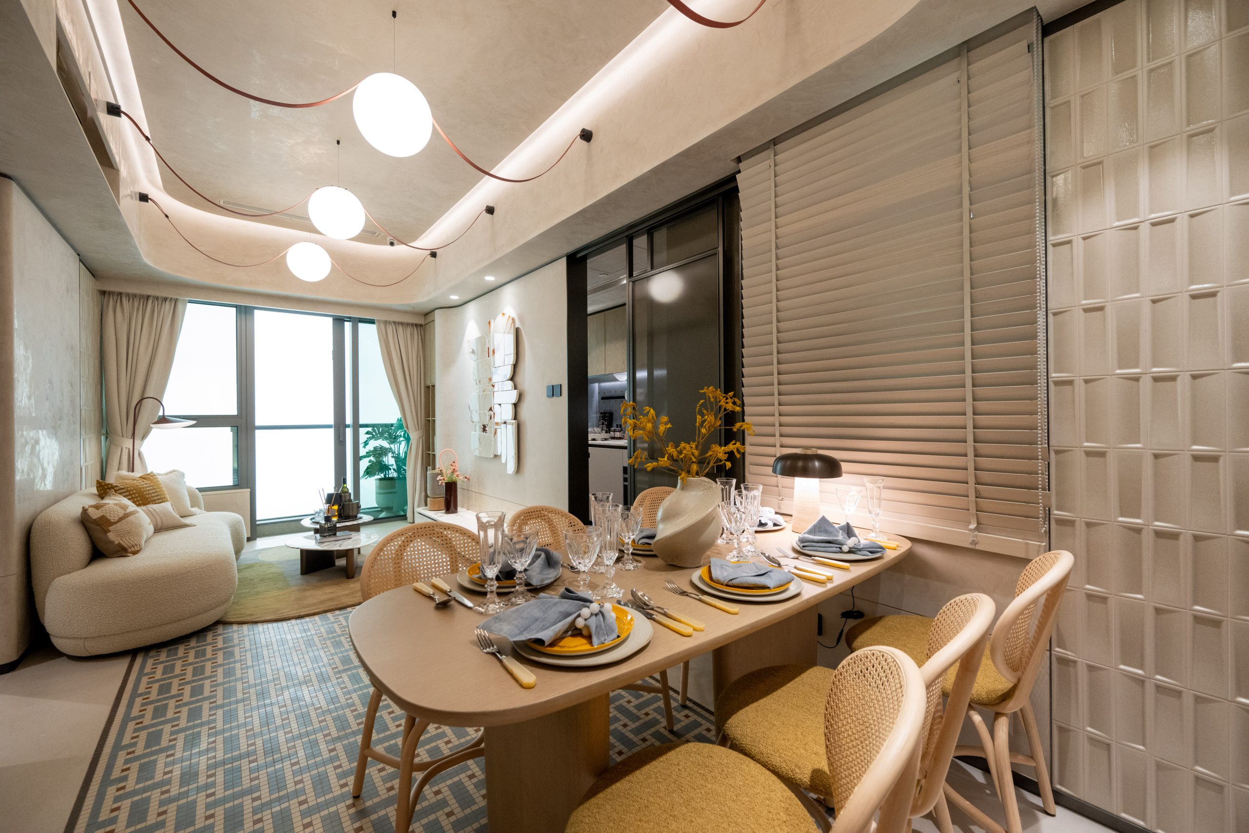 飯廳選用磚紅色檯面的長形四人餐桌,配上淡藍色餐椅,餐桌旁採用金屬色半圓鏡面設計。地板以淡雅的白色地磚鋪砌,與屋內磚紅色主調的非凡設計互相交錯。客廳放置高雅的象牙白色絨面梳化,配上型格的拼色格紋地毯,擺放灰色幾何造型茶几後,仍空間闊落,沙發背後牆身採用鏡面設計,客廳另一端放置時尚奶茶色地櫃,擺放藝術畫作。