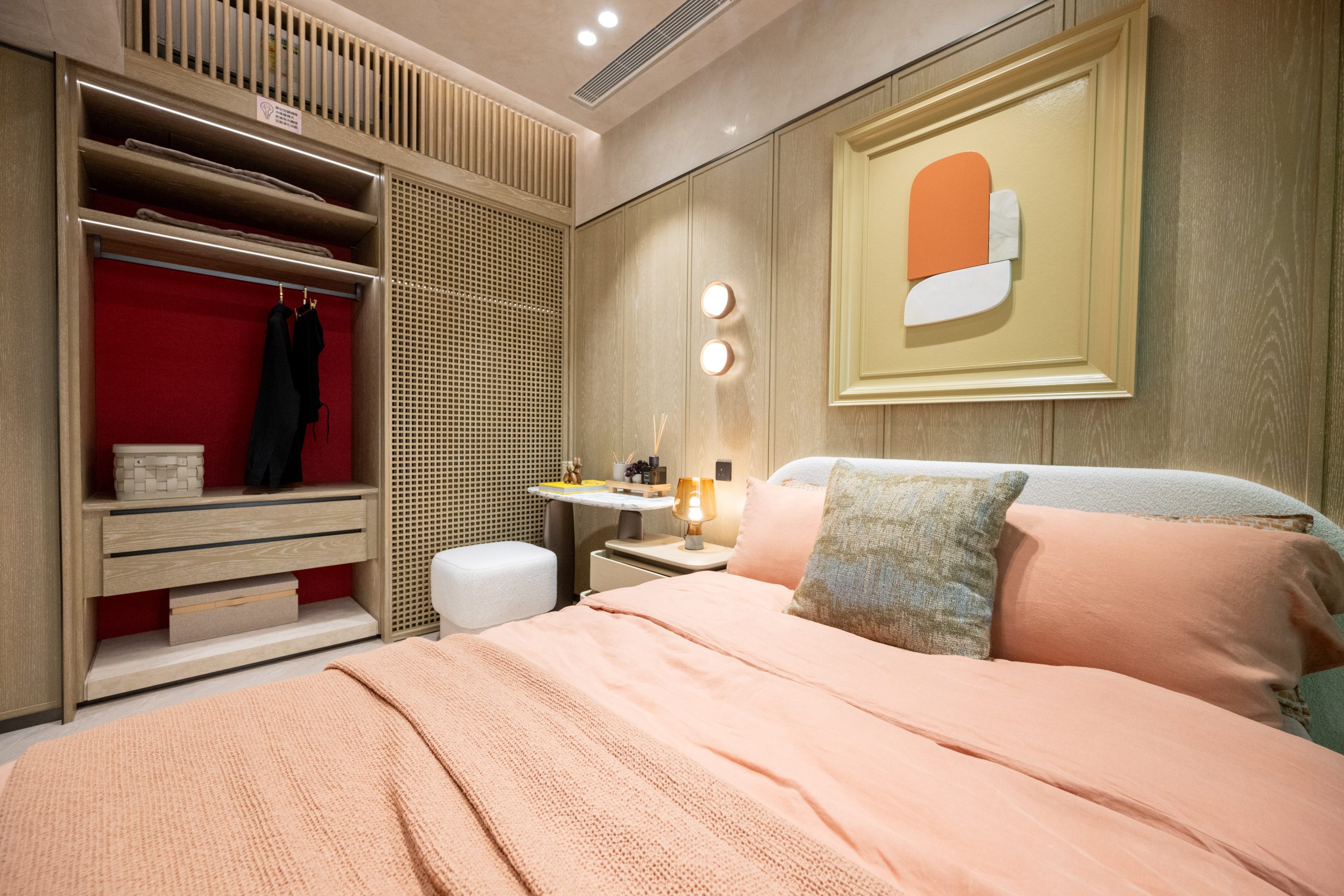 主人睡房貫徹單位以磚紅色及原木色為主調,設有偌大玻璃窗,有效加強睡房空間感。睡房鋪砌複合木地板,營造溫馨明亮氛圍,靠窗位置擺放雙人床,床架伸延接連原木色地櫃及衣櫃,波浪形型懸空白色烤漆亮面衣櫃,收納空間充裕,床邊放置原木色床頭櫃,擺放床頭燈及香薰,牆身一端採用木紋牆身設計,綴以橙色及白色的圓形布藝裝飾掛畫。
