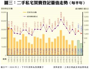 二手私宅市場方面,同受樓市撤辣消息提振,買家入市信心回升,當中更不乏換樓客及投資者重投市場,帶動二手買賣登記連月上升,於4月份時更高見近4,400宗的登記,縱然5月有所回落,仍能突破三千宗水平。上半年截至6月11日的二手私宅登記量錄得14,408宗,預期整個上半年最終可錄17,341宗,將較去年下半年急增逾58%,重返至貼近2023年上半年的水平;至於,今年上半年二手私宅登記總值料達1,300.13億元,將較去年下半年的939.63億元增加38%,量值均同步自低位大反彈。
