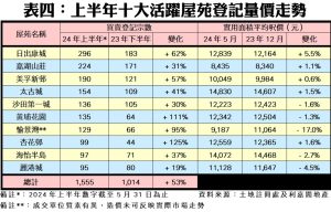 另外,上半年截至5月底止十大活躍屋苑買賣登記量暫錄得1,555宗,較去年整個下半年的1,014宗已上升53%;當中以日出康城登記量最旺,蟬聯最熱賣屋苑,上半年首5個月買賣登記暫錄296宗,已較去年下半年的183宗暫多出62%。十大活躍屋苑登記量全線上升,其中以杏花村的1.25倍升幅最凌厲,上半年暫已錄99宗登記,而黃埔花園及愉景灣亦分別升1.11倍及95%,至各自的135宗及129宗(見附錄表四)。