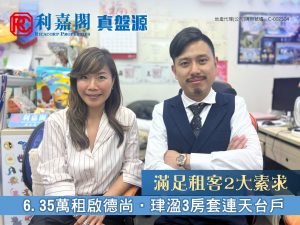 利嘉閣地產新啟德-現崇山分行聯席董事李嘉輝(Fai)(右)稱,該行客戶主任蘇靜荷(Sammi)(左)早前促成啟德尚‧珒溋一個極高層J室連天台及車位的二手租賃成交個案,單位實用面積約1,104方呎,屬3房1套間隔,外望市景。