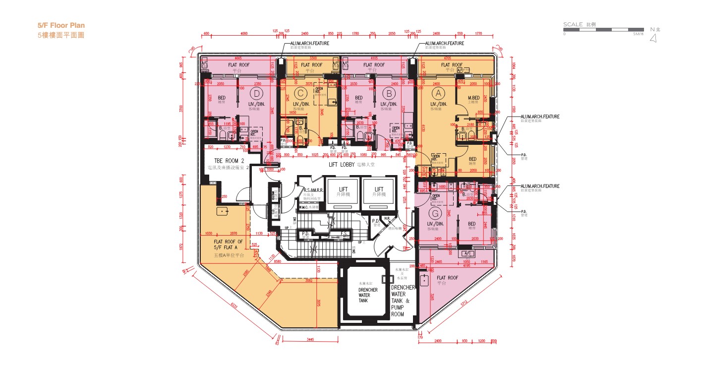 值得一提,5樓A室連平台單位,兩房間隔,實用面積351方呎,連415方呎平台,但採雙平台設計,其中有57方呎平台直接連接單位,其餘約361方呎則設於同層另一邊,即是住戶使用時要經過電梯大堂。