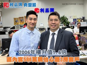 利嘉閣地產調景嶺站分行首席聯席董事羅志雄(Franki)(右)稱,該行客戶經理伍家豪(Gordon)(左)新近促成將軍澳怡心園5座高層D室的二手成交個案,單位實用面積約604方呎,屬3房1套間隔,可望市景。