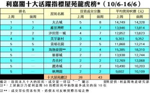 在上周十大活躍成交屋苑當中,共有6個屋苑交投量下跌,跌幅介乎25%至60%不等。當中黃埔花園交投變化顯著,成交量由前周5宗跌至上周2宗,按周急挫60%;而太古城則以5宗買賣登上上周最熱賣屋苑寶座。