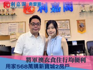 利嘉閣地產將軍澳蔚藍灣畔一行A組分行經理蔡麒麟(Ivan)稱,該行客戶經理潘瑞霖(Benny)(左)及物業顧問李子欣(Lexi)(右)新近促成將軍澳新寶城2座中層D室的二手成交個案,單位實用面積約433方呎,屬2房間隔,座向北,外望園景。