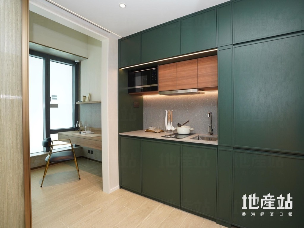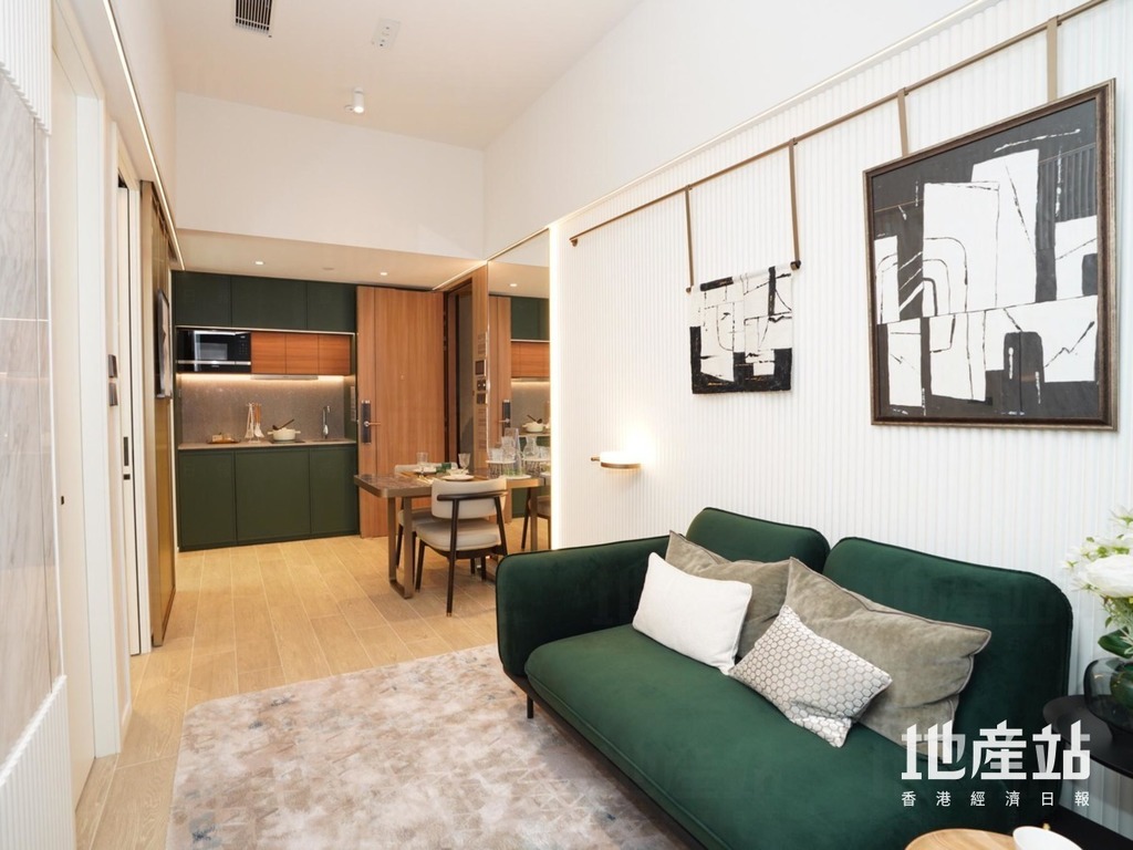 單位並採用開放式廚房設計,用上墨綠色作為點綴,不過只設單邊的備餐及煮食空間,對於喜歡下廚的住戶,位置可能就未必足夠。飯餐用上雲石餐桌,設計時尚高貴,旁邊亦設有玻璃鏡面,以增加空間感。客廳位置設有白色條子牆身,並加入滲光效果,以及藝術裝置,令空間更具層次,同時備有墨綠色沙發。