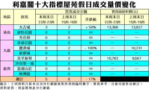 綜合利嘉閣地產分行網絡數據,在過去的周六日(6月22至23日)十大指標屋苑錄得5宗二手成交,較對上一個周六日(6月15至16日)的6宗,減少17%,為近三個周末新低。廖偉強續指,預料短期內十大屋苑周末交投量仍會於單位數之間游走,直至減息或其他利好消息出台後才會有較明顯反彈。
