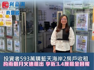 投資者593萬購藍天海岸2房戶收租 約兩個月火速租出 享近3.4厘租金回報