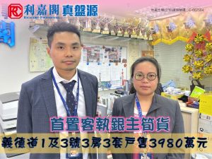 利嘉閣地產紅磡九豪區半島豪庭分行聯席董事張金祥(Kenny)稱,該行高級客戶經理潘少勤(Eric)(左)及羅菲(Sophia)(右)新近促成九龍塘義德道1及3號1座低層B室的二手成交個案,單位實用面積約1,484方呎,屬3房3套間隔,外望開揚市景。