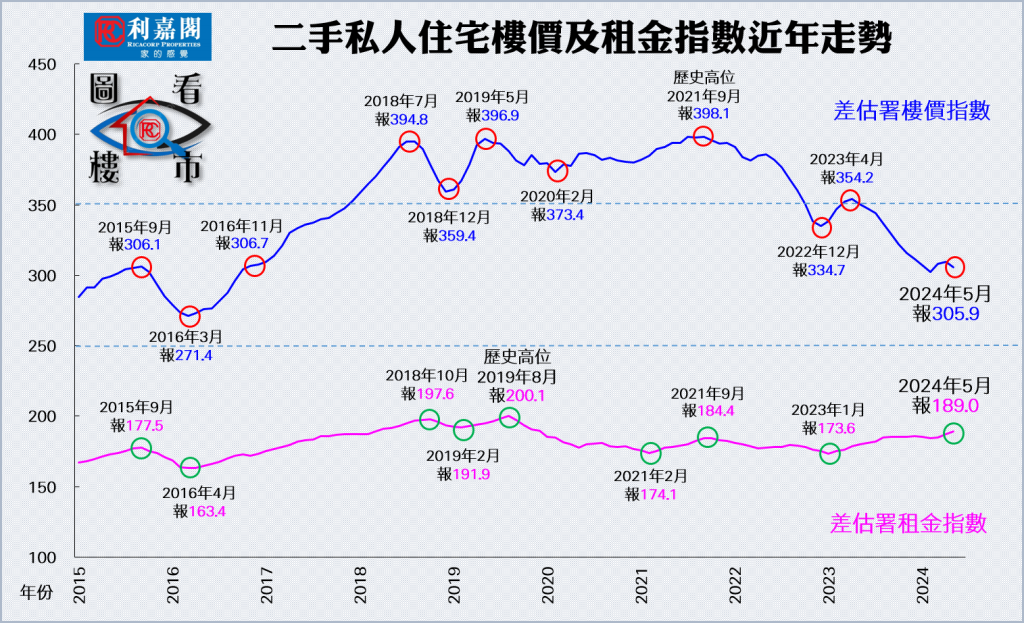 利嘉閣地產研究部主管陳海潮表示,樓價一如預期出現倒跌,料在目前利淡因素較強下,將持續回軟,料最快第四季才有轉機。差估署今日公布的最新數據顯示,2024年5月份私人住宅售價指數報305.9點,較4月的309.7點下跌1.23%,兩連漲後斷纜,兼創近3個月低位;首5個月累計,樓價共跌1.73%;若與2021年9月的歷史高位398.1點比較,樓價累積跌幅擴闊至23.16%。