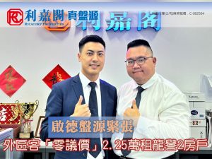 利嘉閣地產新啟德OASIS KAI TAK分行經理薛丁武(Tiger)稱,該行客戶經理胡家榮(Steven)(左)及物業顧問區正仁(Andy)(右)新近促成啟德龍譽1A座中層B室的二手租賃成交個案,單位實用面積約538方呎,屬2房梗廚間隔,外望河景及海景。