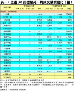 至於,九龍區21個指標屋苑上周共錄34宗成交,較前周的36宗減少6%,其中宇晴軒交投量由前周的4宗,減少50%至上周的2宗;維港灣及港灣豪庭各自錄得1宗買賣,按周分別減少50%;海逸豪園、將軍澳中心及美孚新村成交量按周各自減少33%,分別錄得2宗、2宗及4宗買賣。此外,在全港50個指標屋苑之中,上周共有13個屋苑錄得「零成交」,與前周的數量相同,當中港島區及九龍區各佔2個及4個屋苑,新界區則佔7個(詳見表一)。