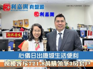 利嘉閣地產調景嶺站分行首席聯席董事羅志雄(Franki)(右)稱,該行客戶董事王兆萍(Shirley)(左)新近促成將軍澳日出康城領峯8座高層LB室的二手成交個案,單位實用面積約721方呎,屬3房1套連士多房間隔,外望市景。