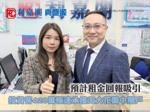 利嘉閣地產中九龍淘大一行高級聯席董事鮑允中(Eric)(左)稱,該行客戶主任董桂花(Grace)(右)新近促成牛頭角淘大花園B座中層3室的二手成交個案,單位實用面積約375方呎,採2房間隔,外望東九文化中心及遠眺維港景致。